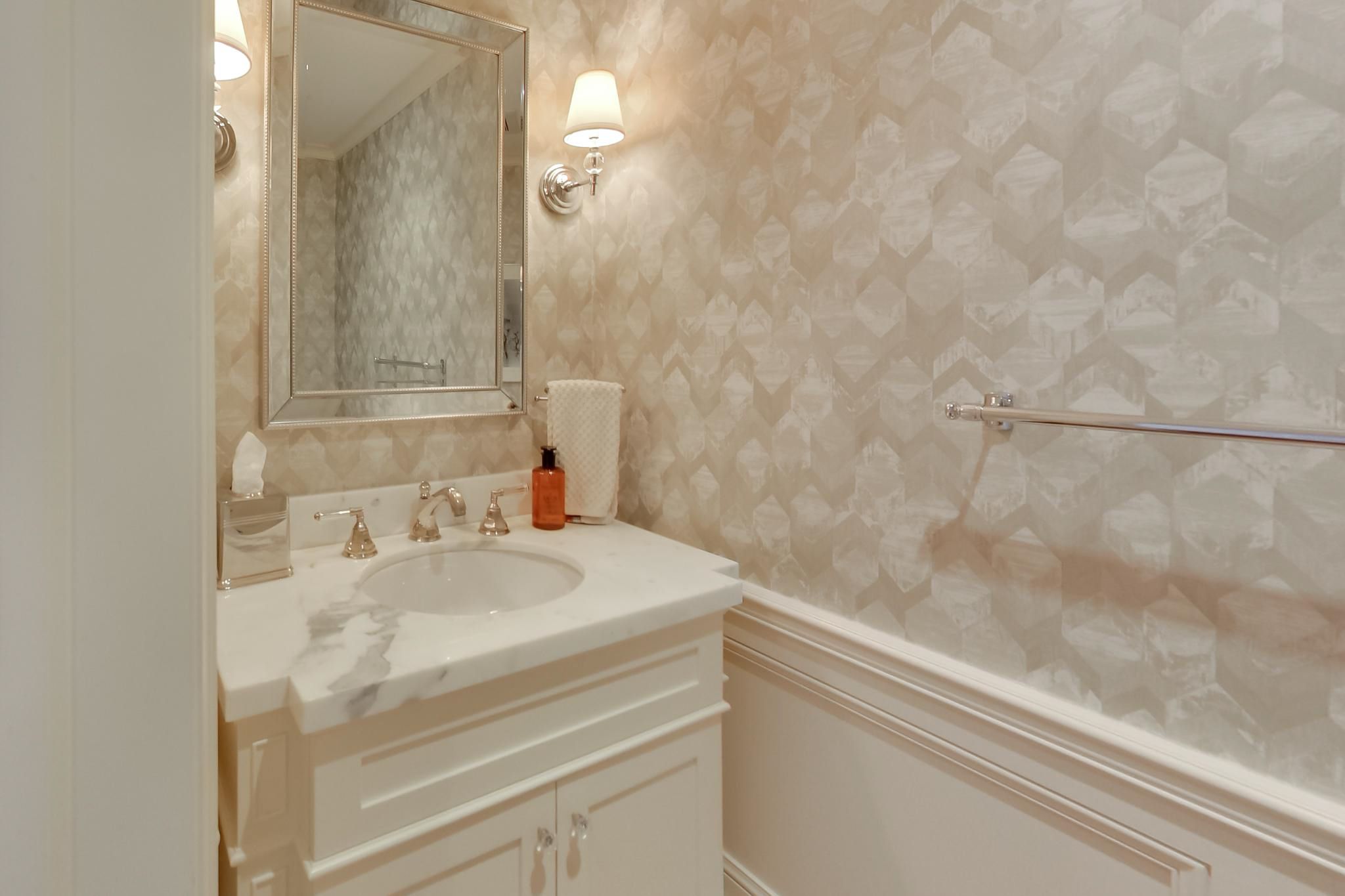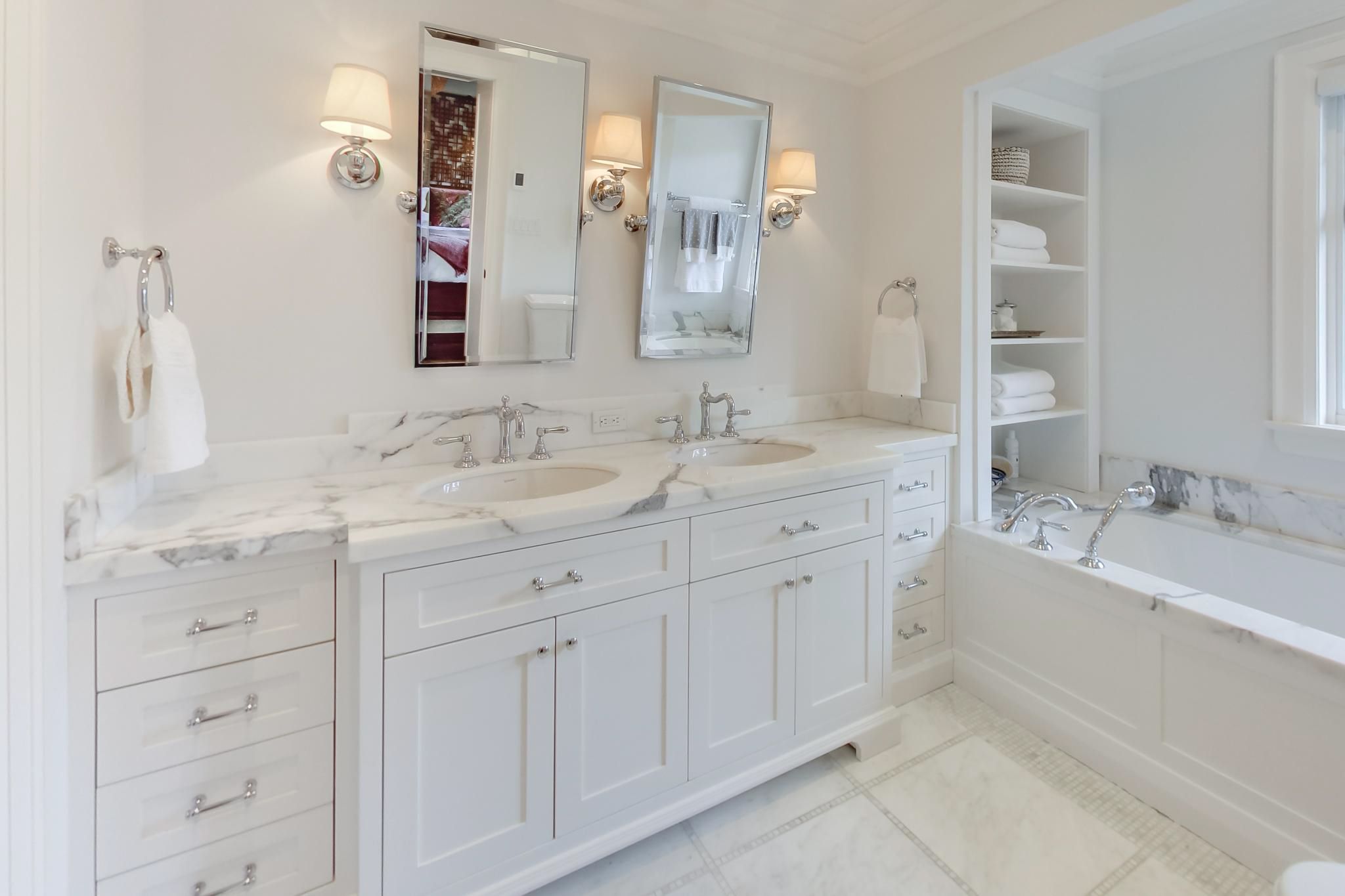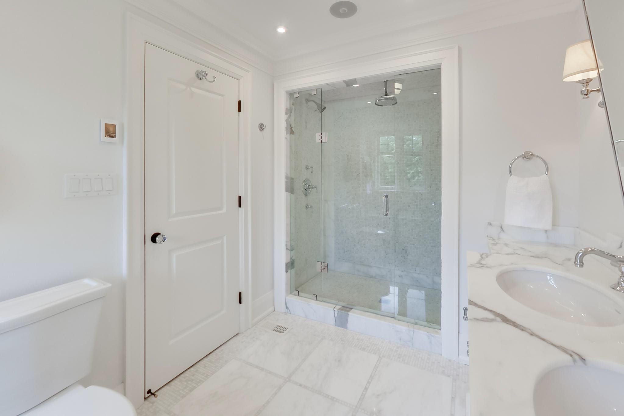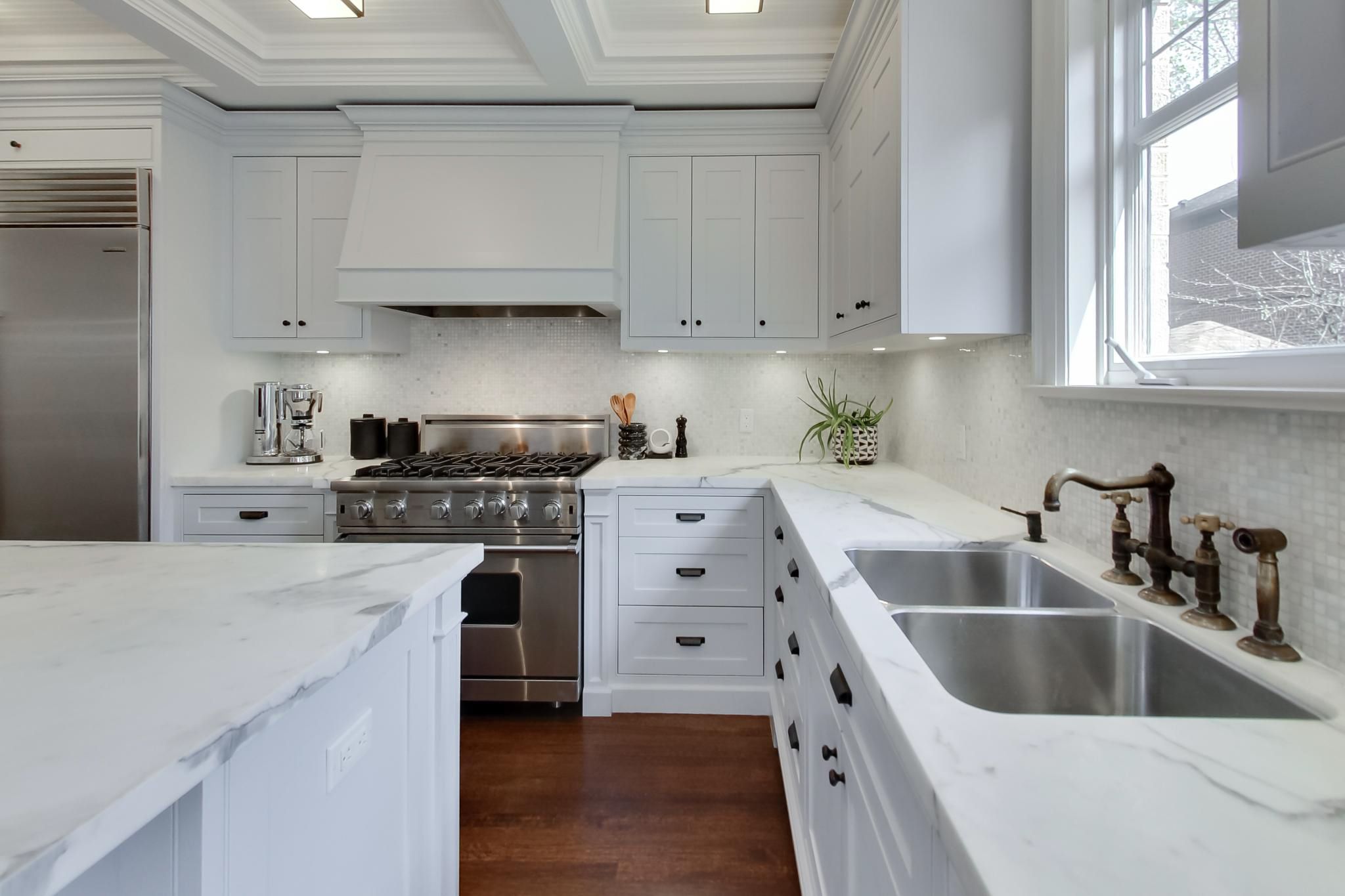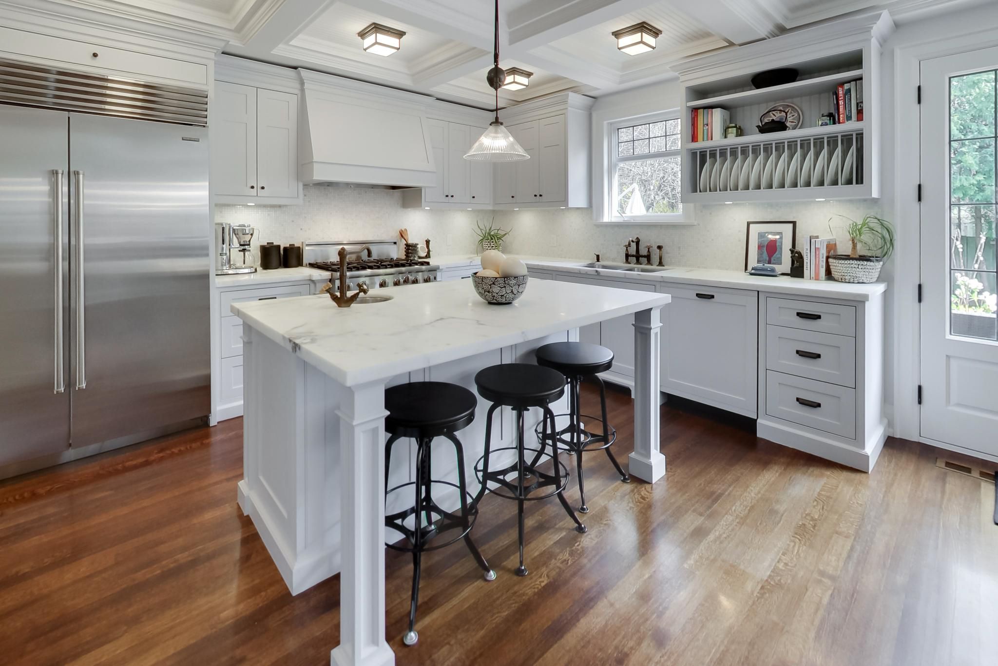 • Gourmet kitchen features Carrara marble countertops and a Sub-Zero refrigerator.