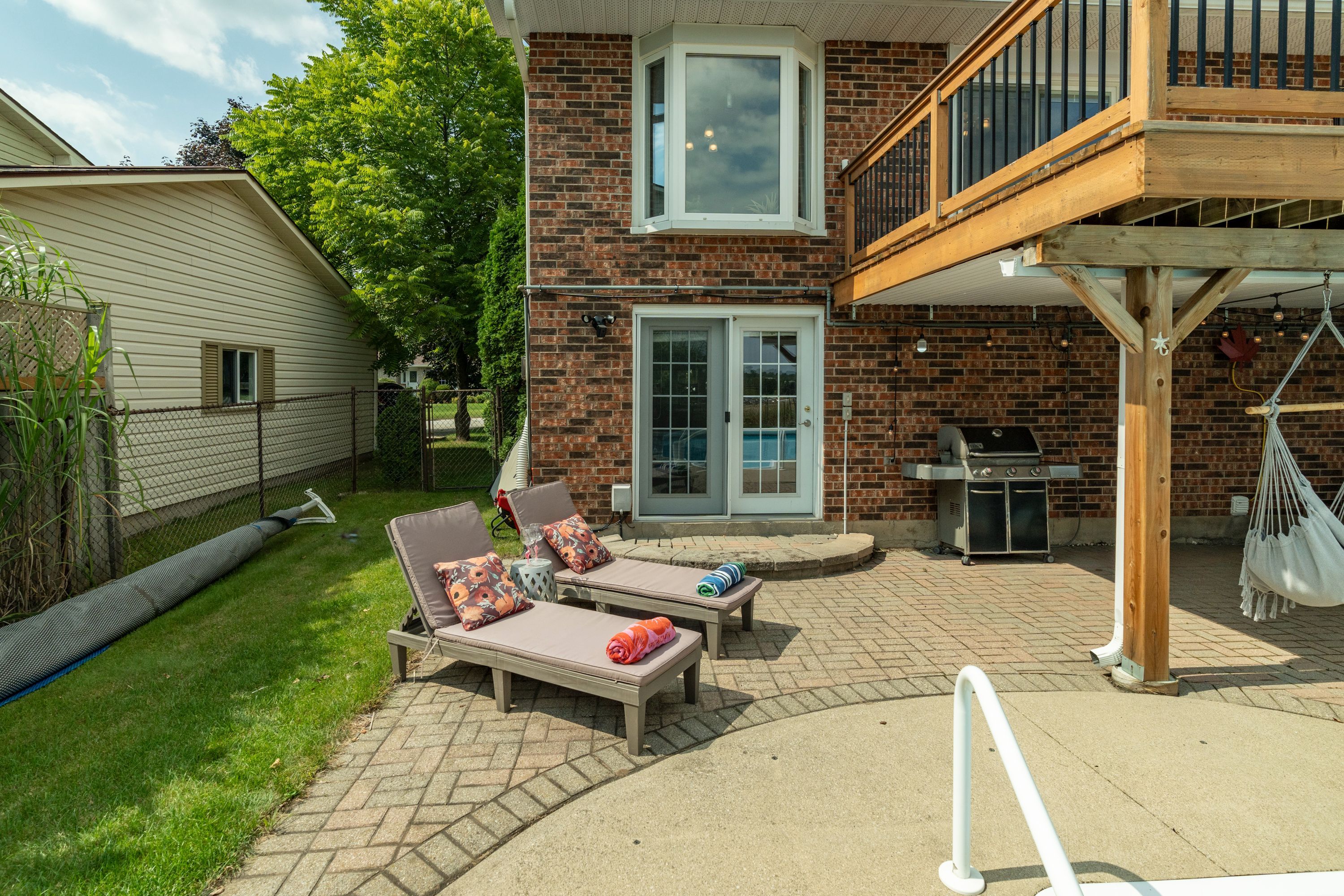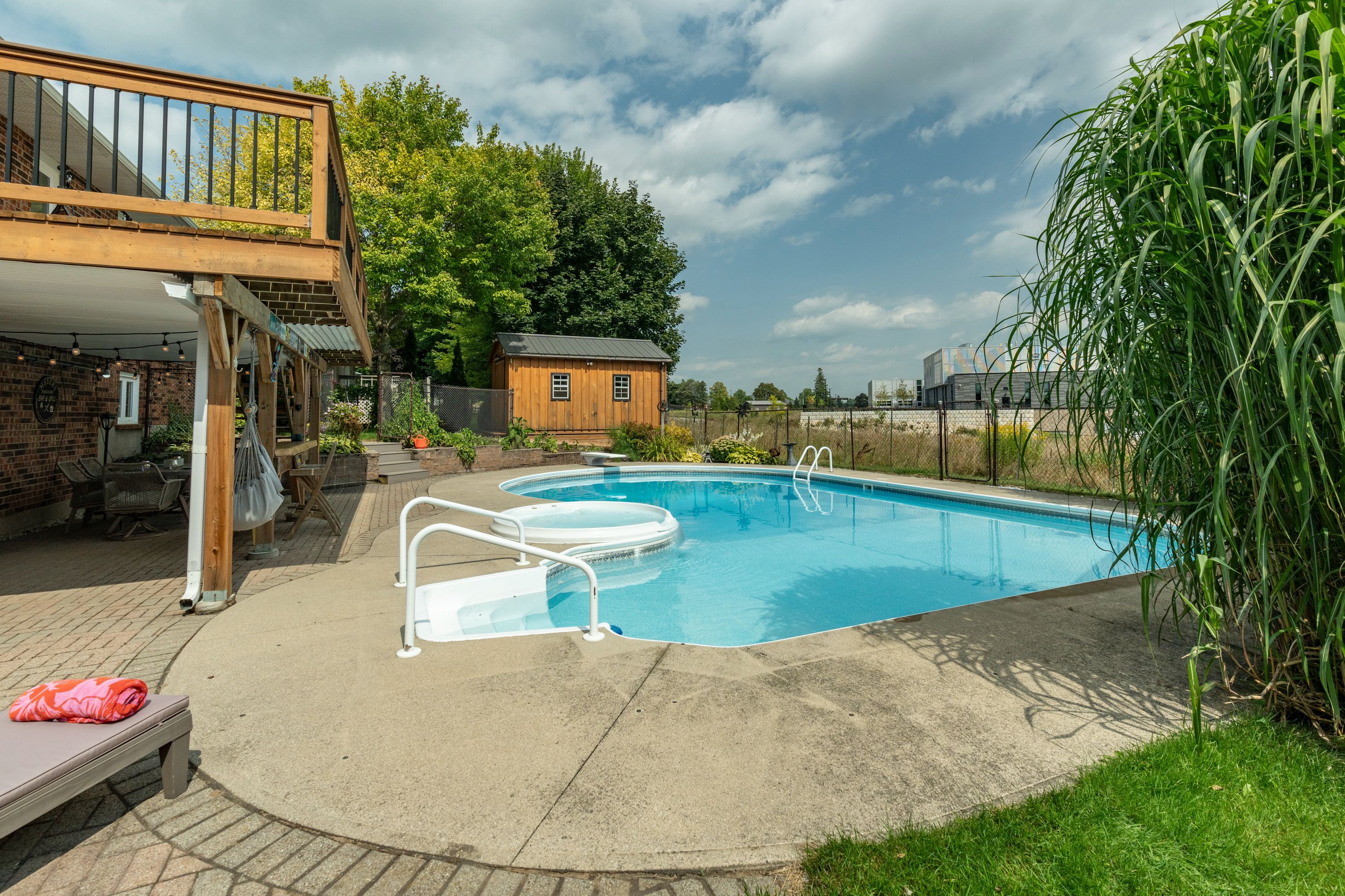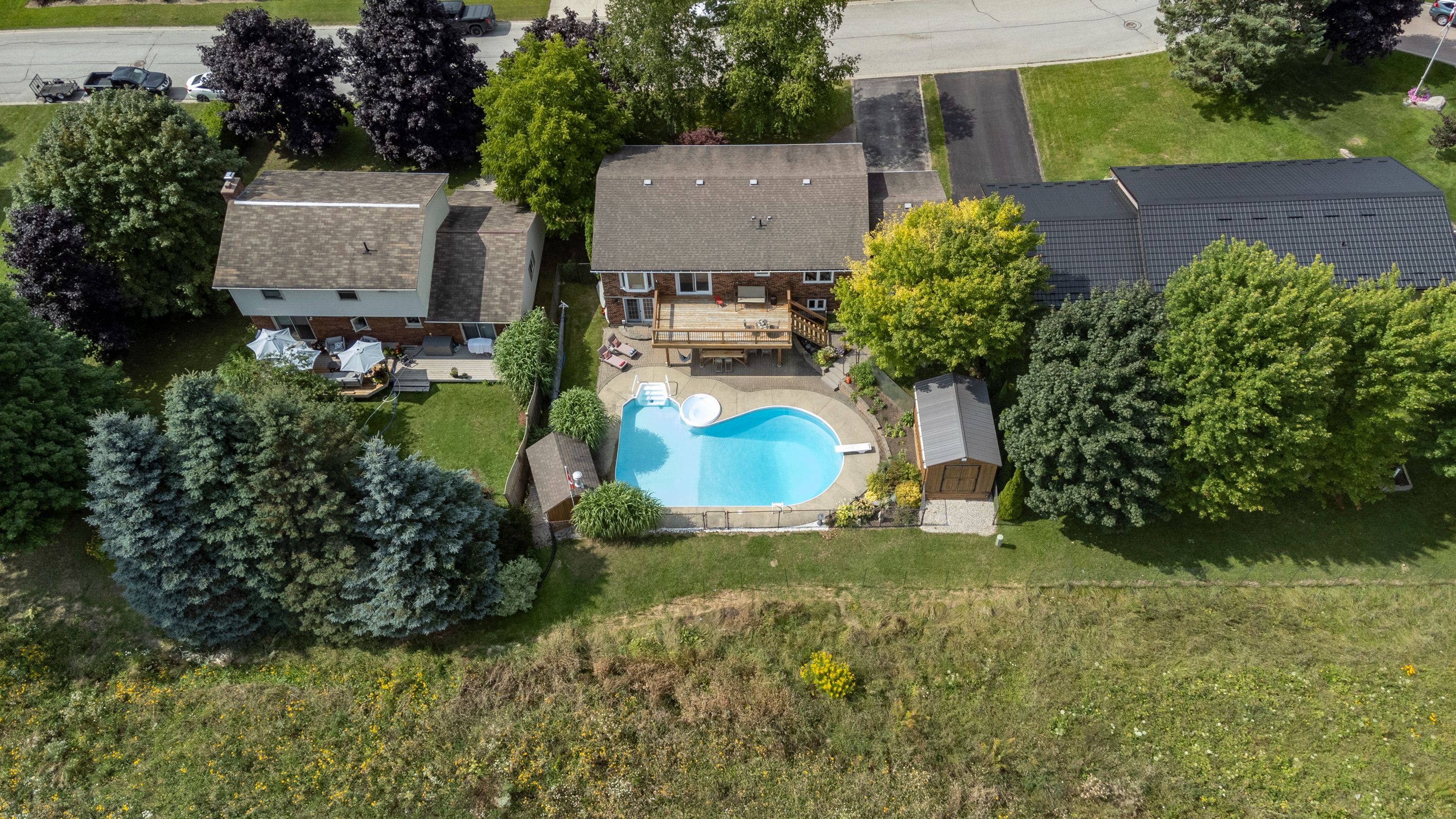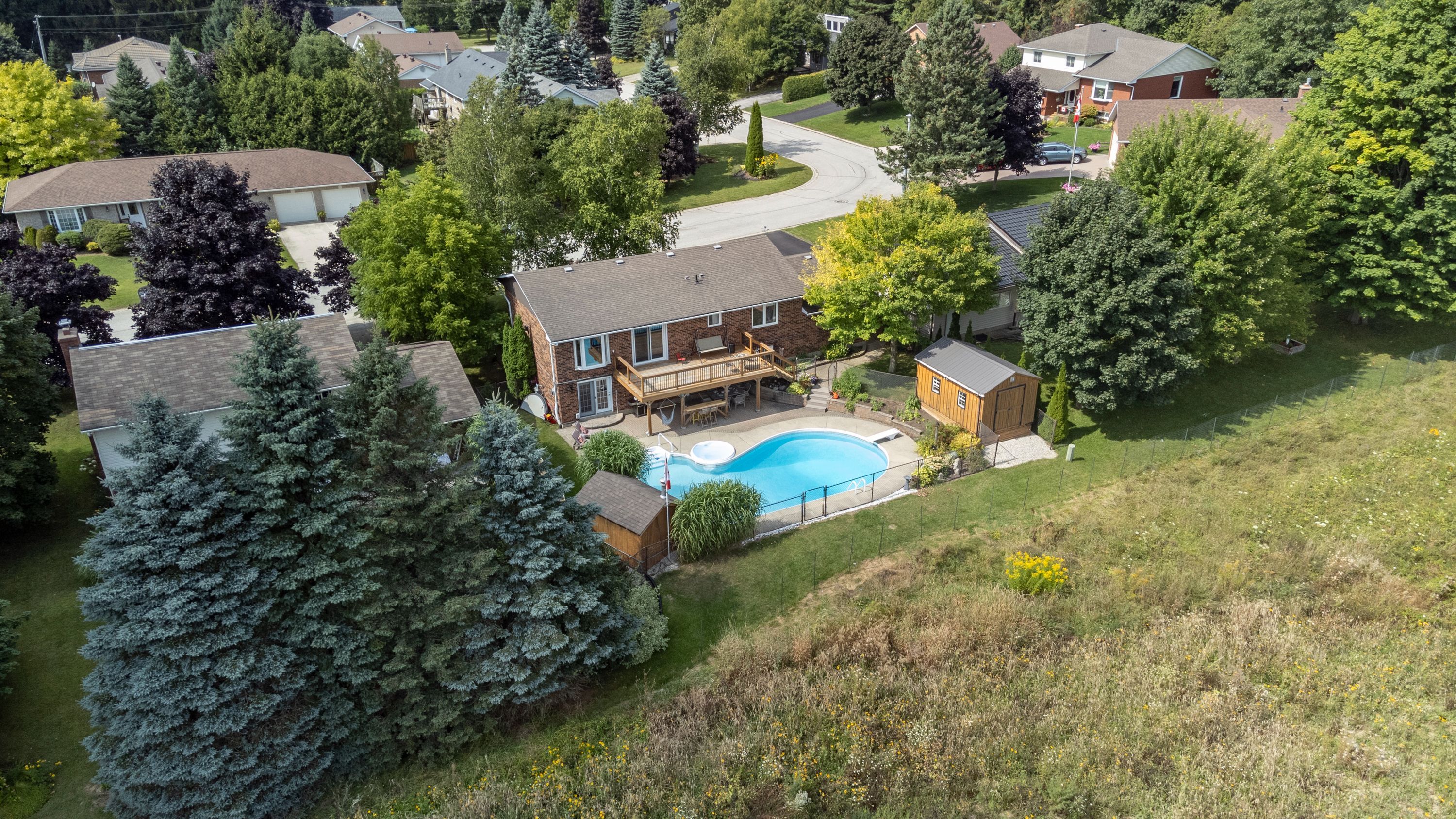 This beautifully maintained all brick bungalow is set in one of the areas most sought-after neighbourhoods. The main floor showcases gleaming hardwood floors, a bright and spacious living room with a stone fireplace, and a dining room featuring a large bow window with picturesque countryside views. The kitchen offers a breakfast bar and french doors that open to a 24' x 12' deck, ideal for outdoor dining and entertaining. Three bedrooms complete the main level, including a primary suite with a private en-suite bath. The fully finished lower level provides a fourth bedroom, a combined laundry and 2-piece bath, a versatile hobby or flex room, and a family room with walkout access to the backyard. Outside, enjoy summer living in your private, fully fenced yard with a 38' x 23' heated inground pool and 6-person waterfall spa. A perfect home for comfortable family living and effortless entertaining.