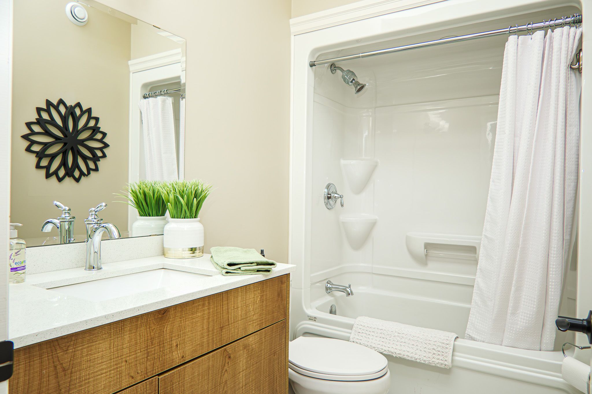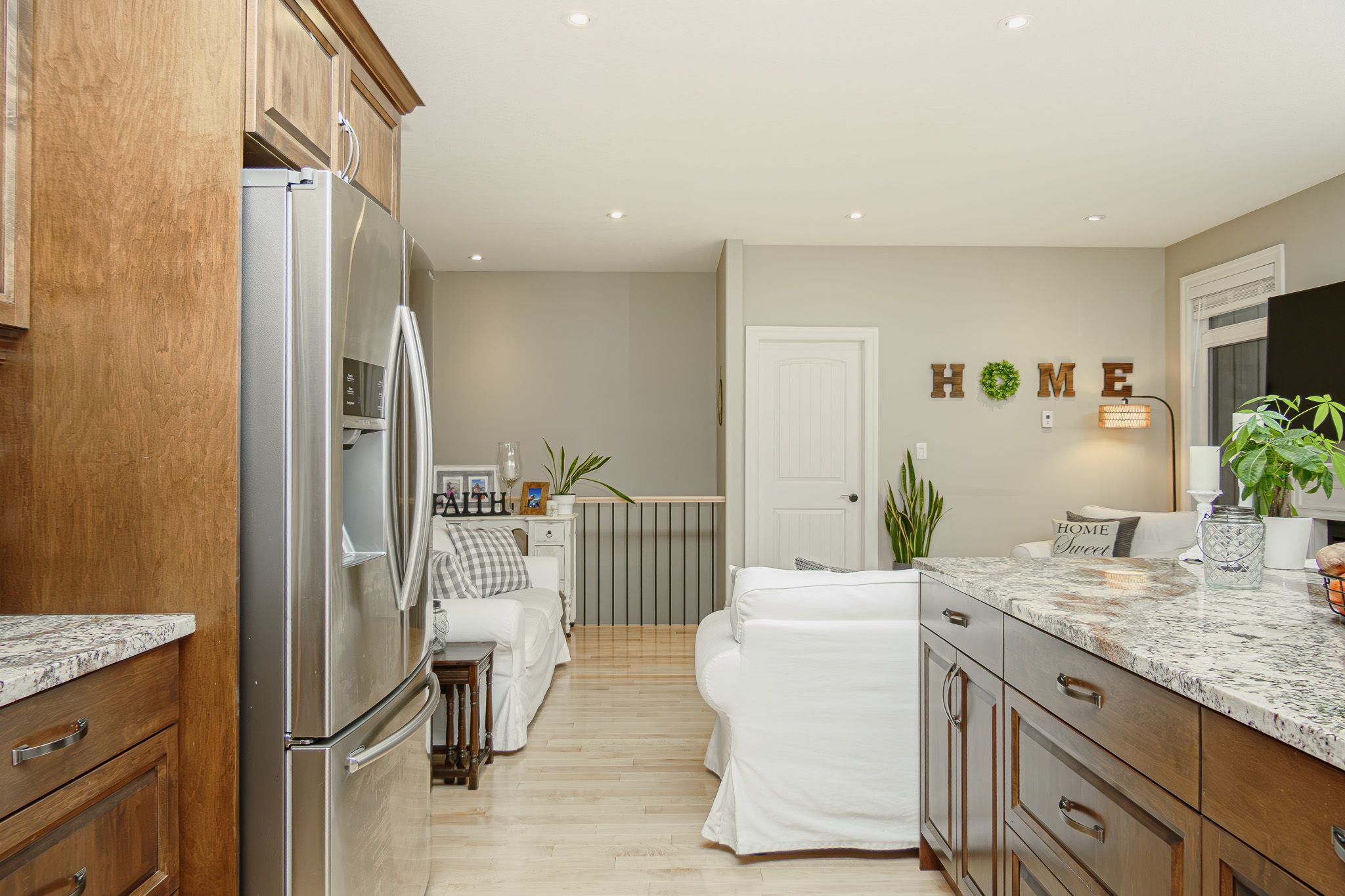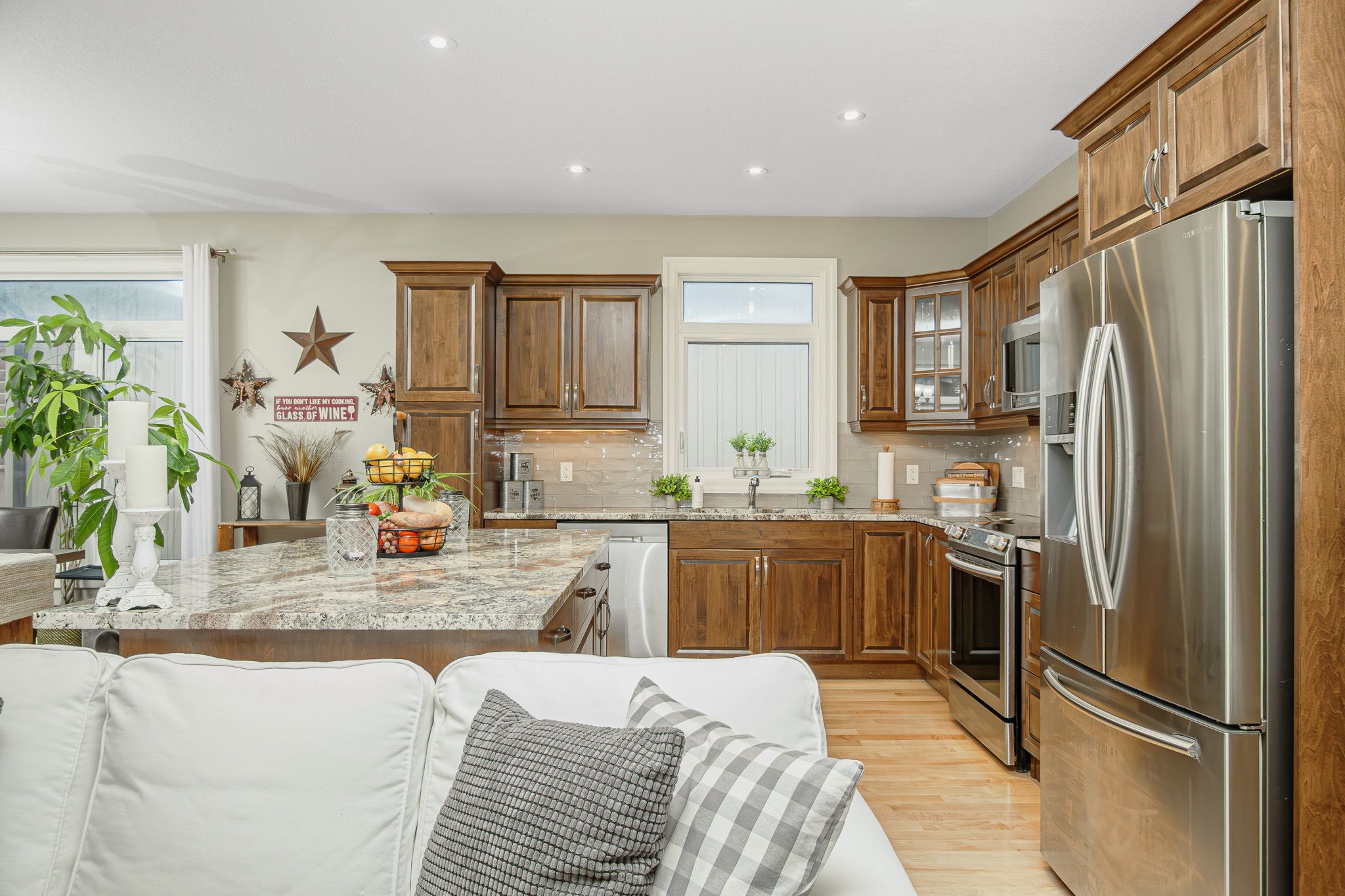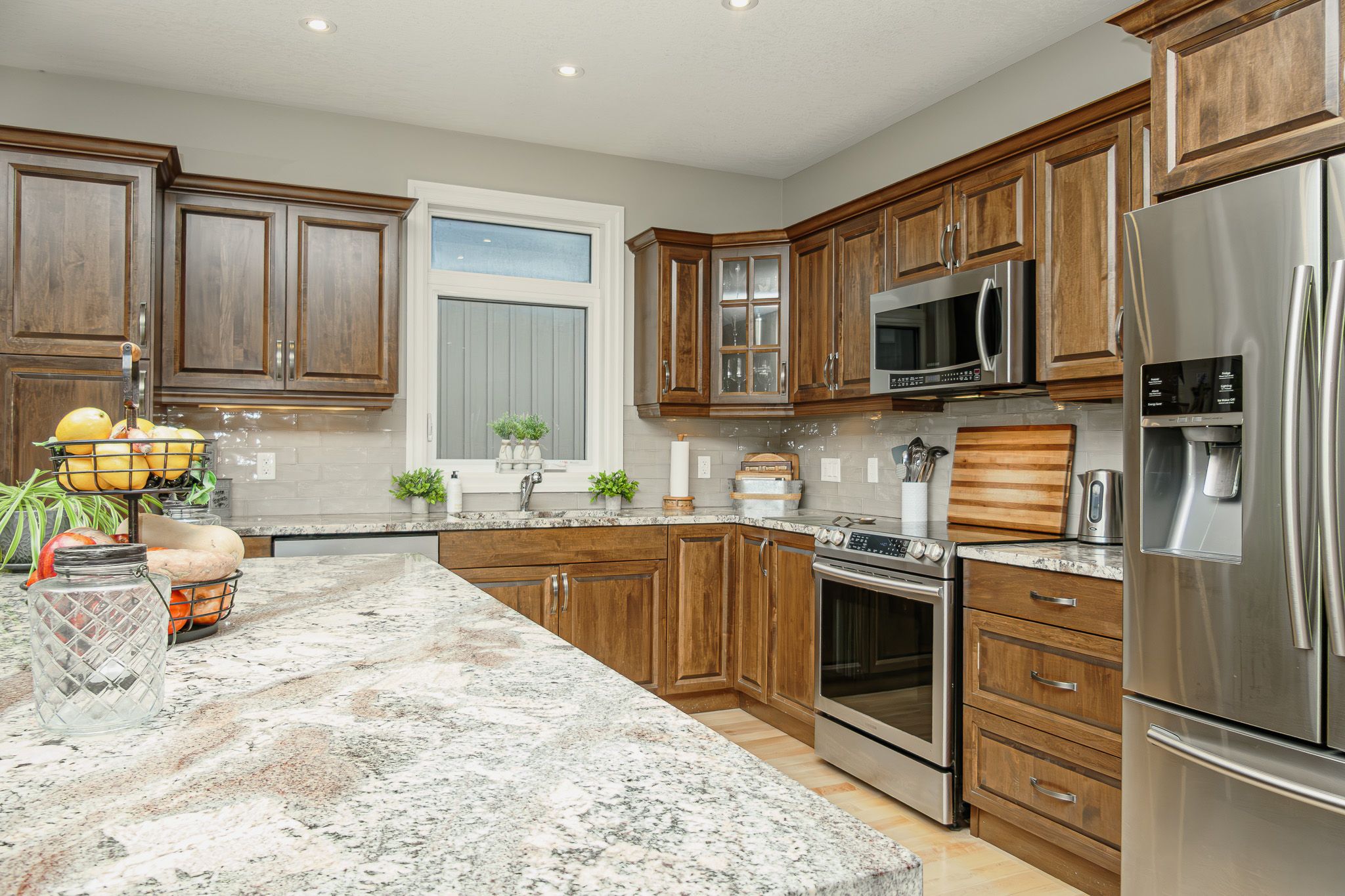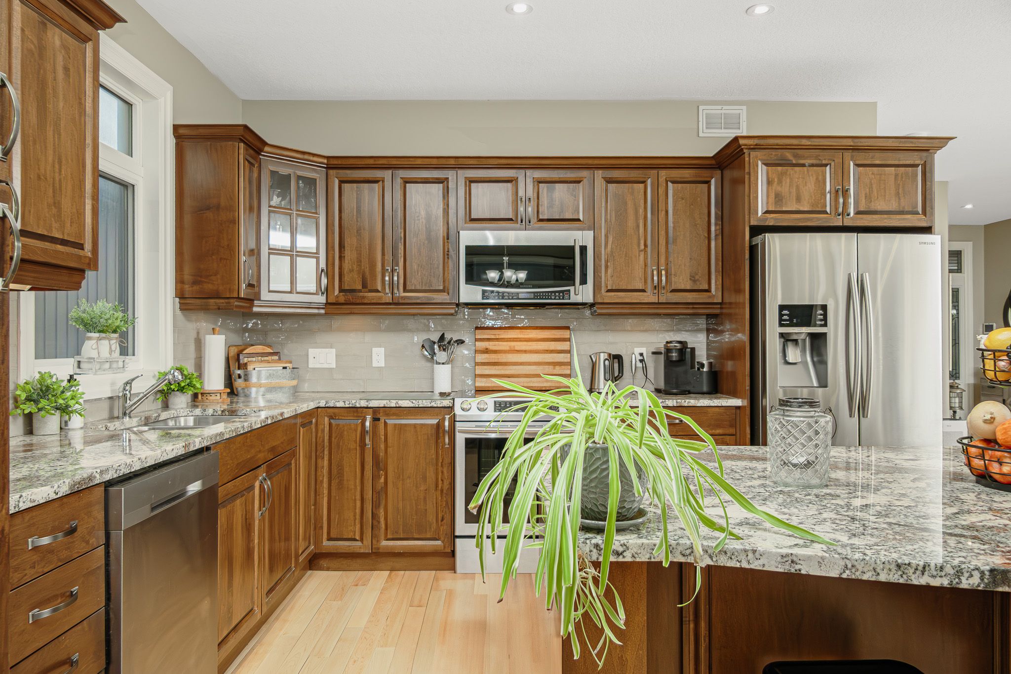 • Custom kitchen with quartz countertops and stainless-steel appliances for easy cooking.