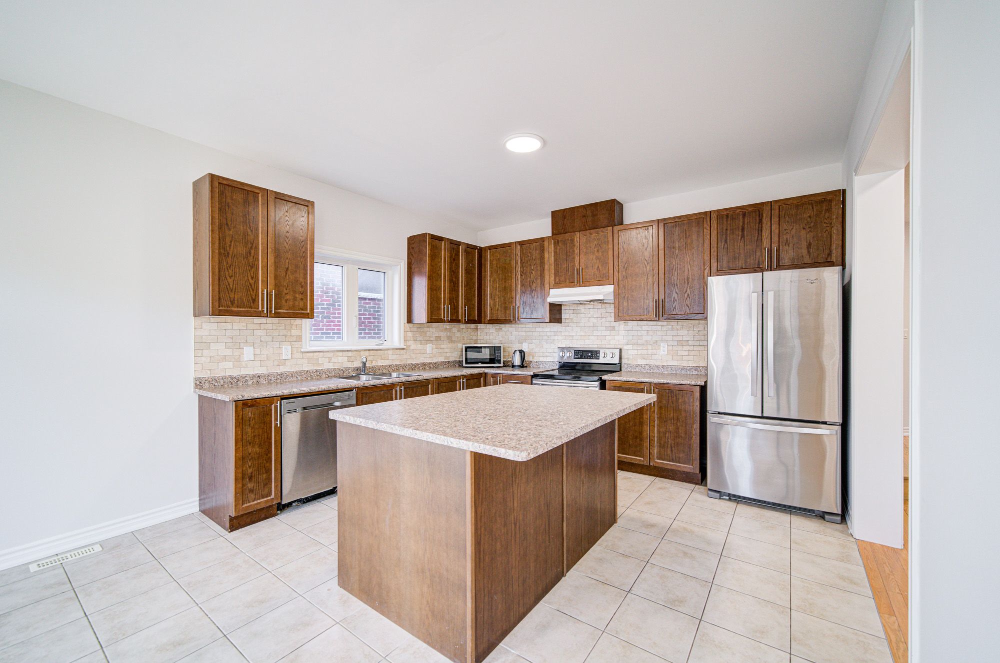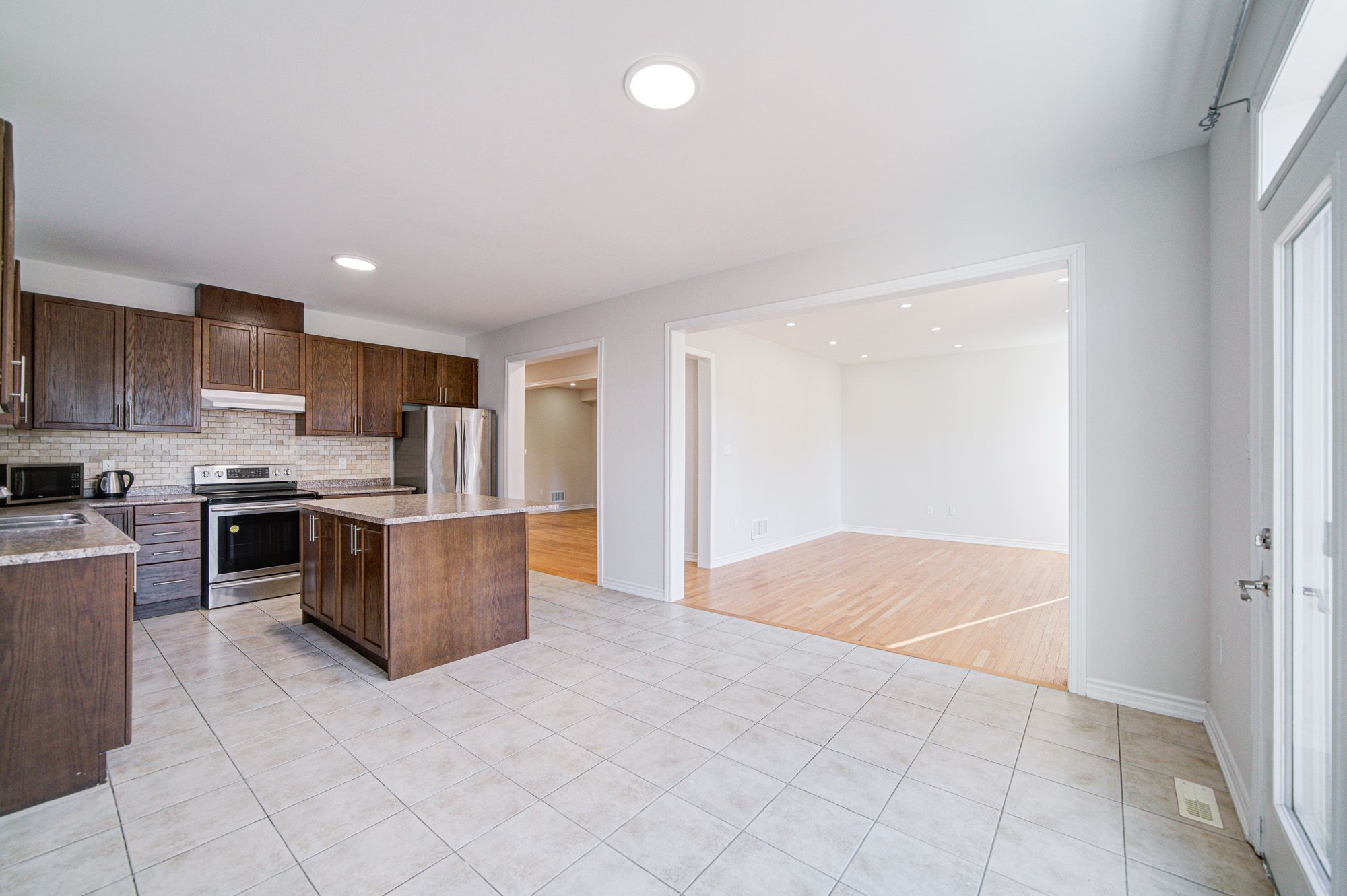 • Open concept kitchen features a large center island and dining area.