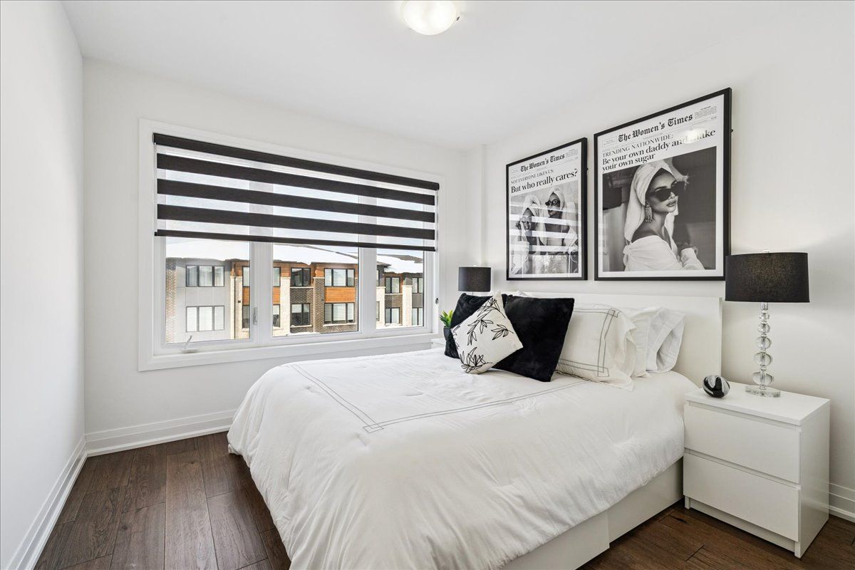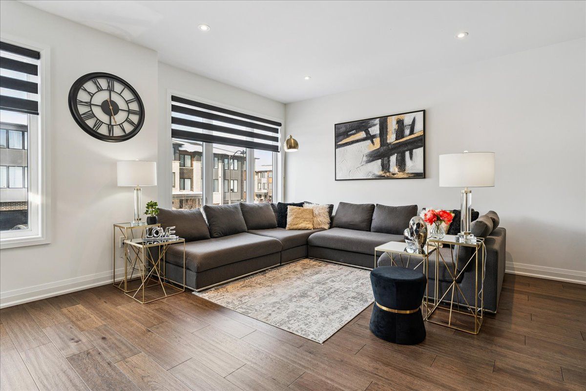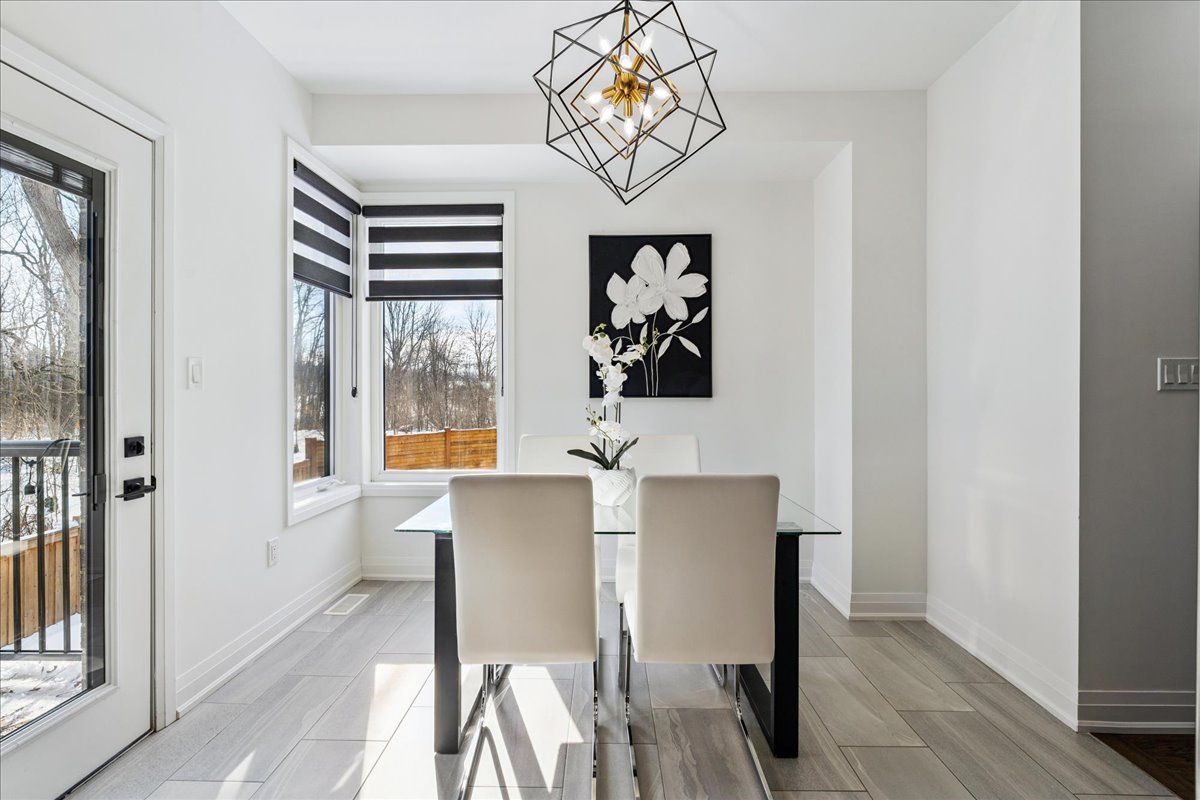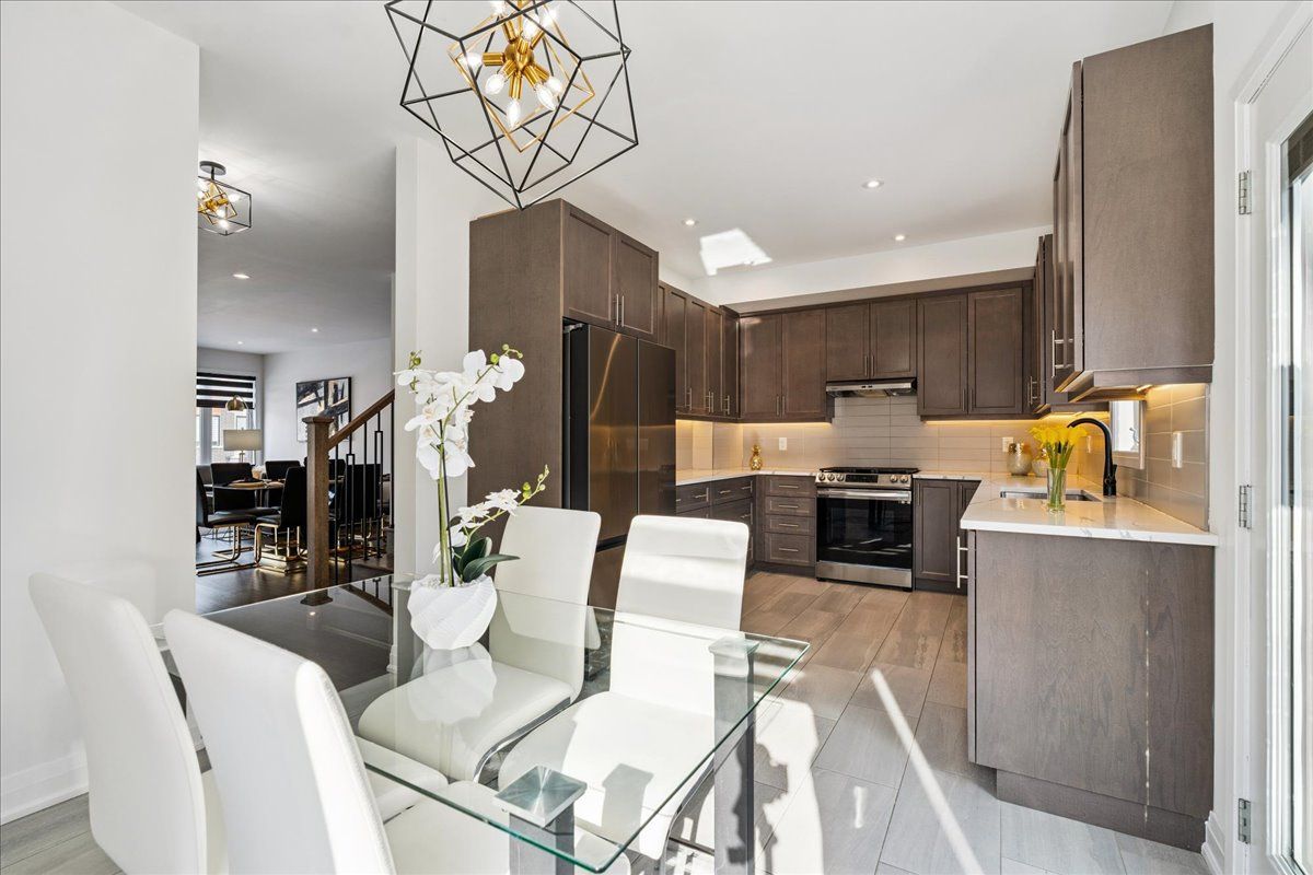 Welcome home to modern luxury at its finest! A stunning, nearly new (built by worthington homes) freehold end-unit townhome with rare two-car garage and double driveway in georgetown's highly sought-after trafalgar square community. This home is perfectly positioned on a premium lot without rear neighbours, just steps from the club at north halton golf course - the ideal blend of nature's serenity and city convenience. Flooded with natural light, this beauty showcases elegant contemporary finishes including wide-plank hardwood floors, quartz counters in the kitchen and bathrooms, premium ceramic tile, upgraded pot lights, gorgeous chandeliers, and contemporary custom zebra blinds throughout which are remoted-controlled in the primary suite and family room!! The ground level offers a versatile walk-out to the fully fenced yard from the recreation room or home office and direct access to the oversized two-car garage. The main level features a bright, open-concept large family room and dining space with huge windows and custom fireplace feature wall, perfect for entertaining. The chef-inspired large eat-in kitchen is equipped with stainless steel appliances, soft-close cabinetry, and a walk-out to the deck overlooking the private backyard and beautiful green space . . . No neighbours behind! Upstairs, the spacious primary suite enjoys tranquil nature views, a walk-in closet, and a luxurious 3-piece ensuite with an oversized glass shower featuring floor-to-ceiling tile. Two additional generously sized bedrooms, a full main bathroom, practical laundry, and a convenient den/media niche completes the third floor! Ideally located minutes from downtown georgetown, the go station, highway 401, shops, restaurants, the hospital, conservation, trails, the fairground and trafalgar sports park. This turn-key home offers the perfect balance of small-town charm & urban style in the city!! Your future home awaits - don't miss this incredible opportunity to make it yours!