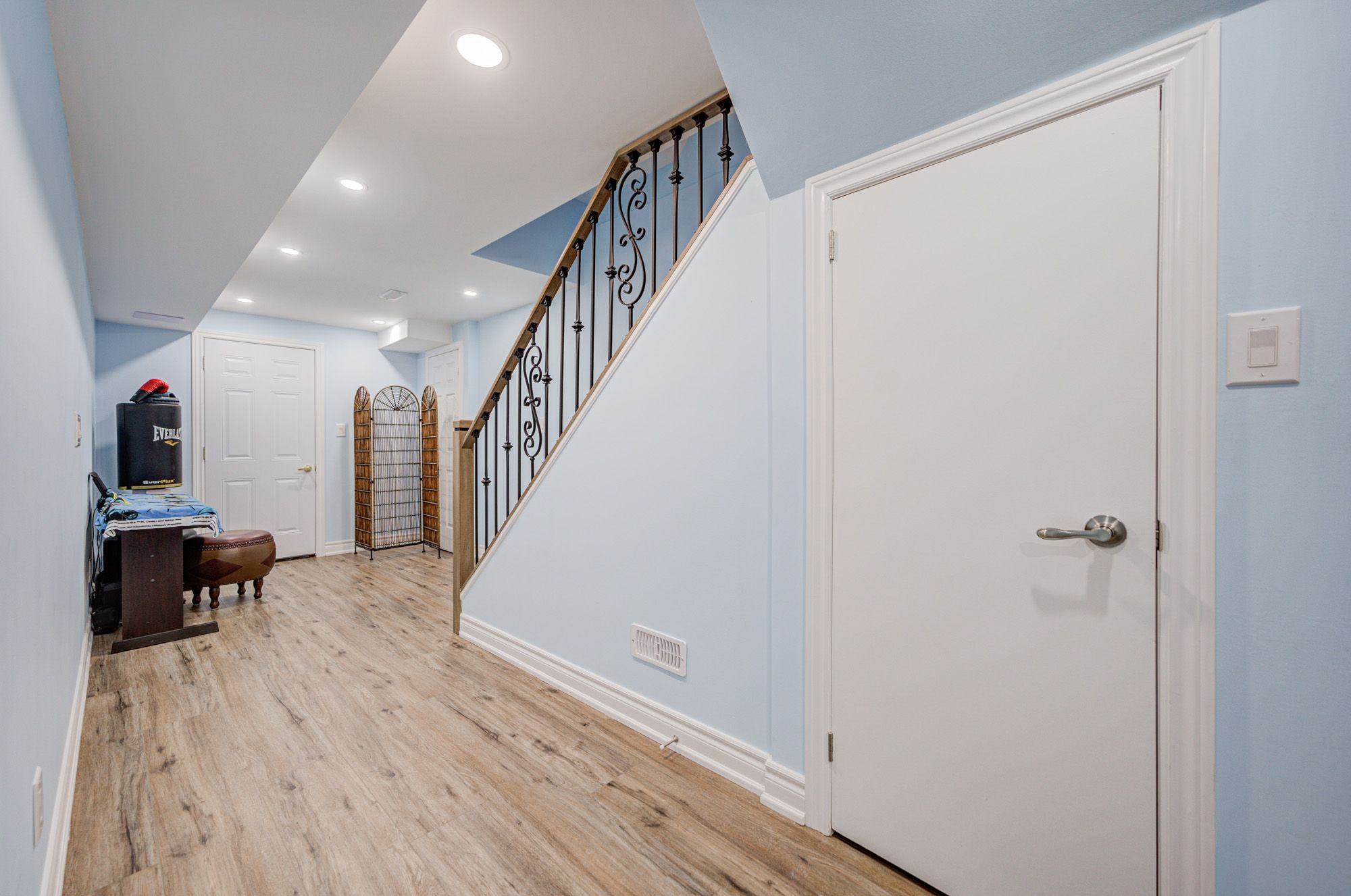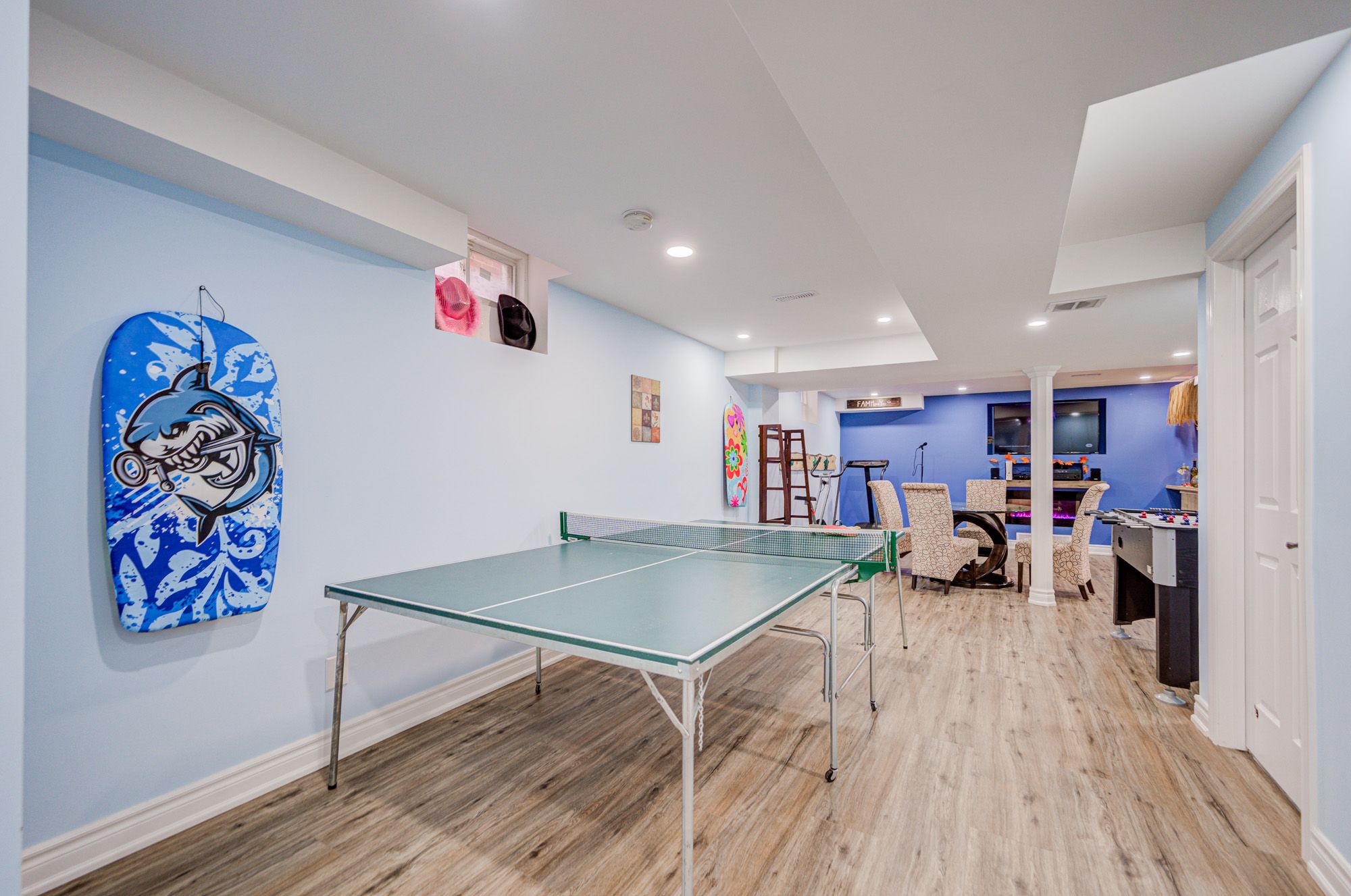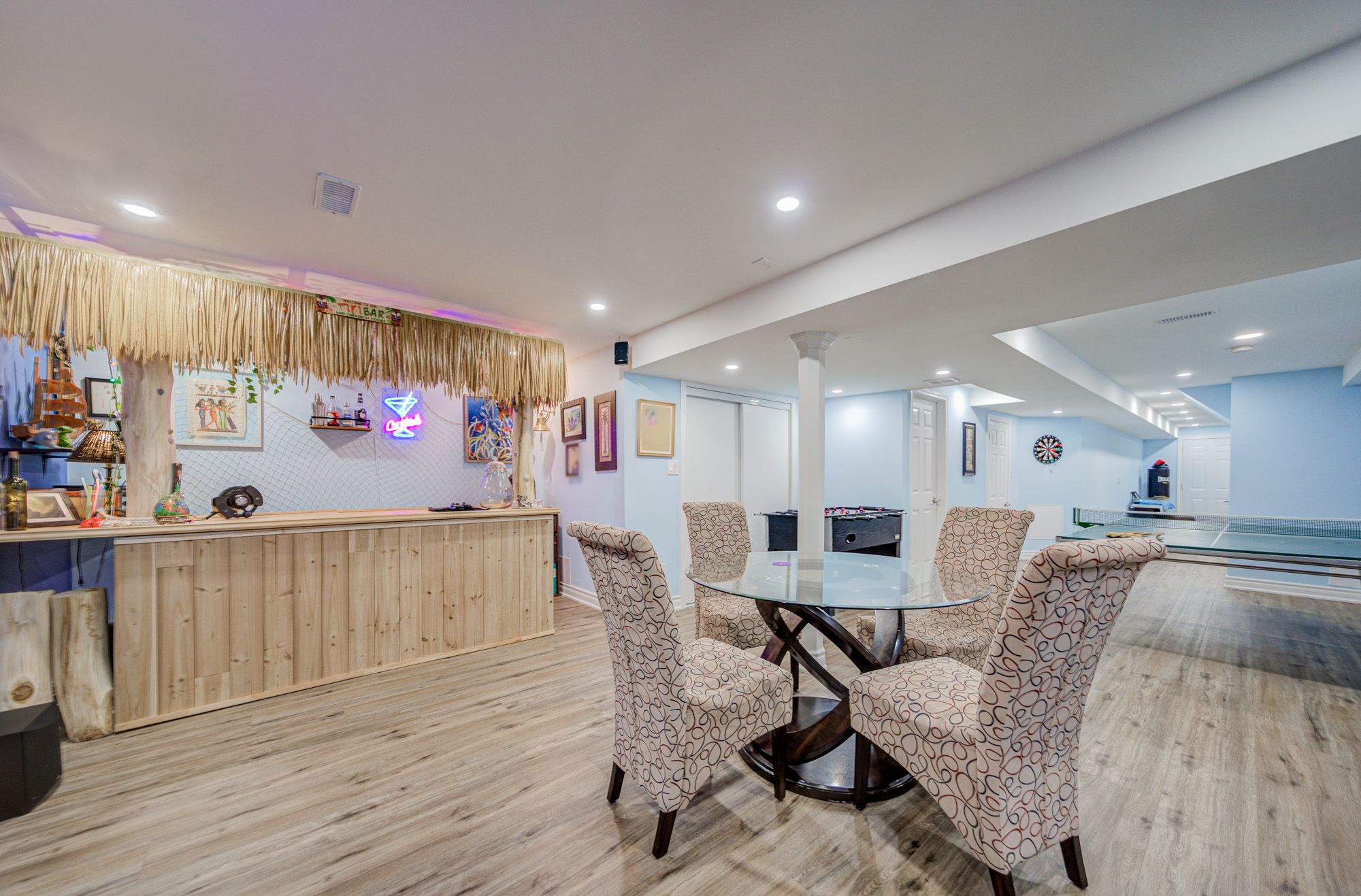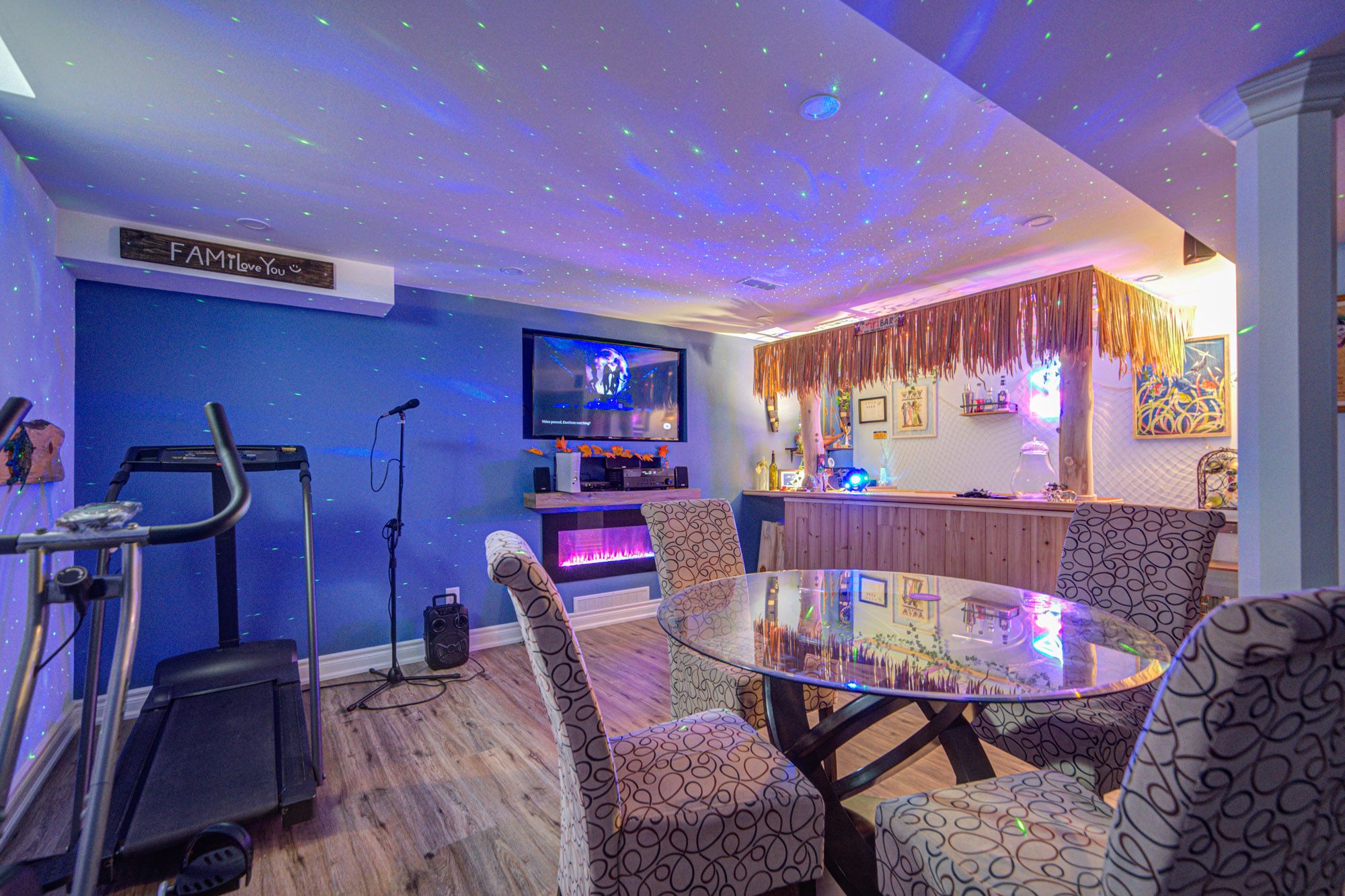 • Finished open concept basement with a Tiki bar and movie theater setup.