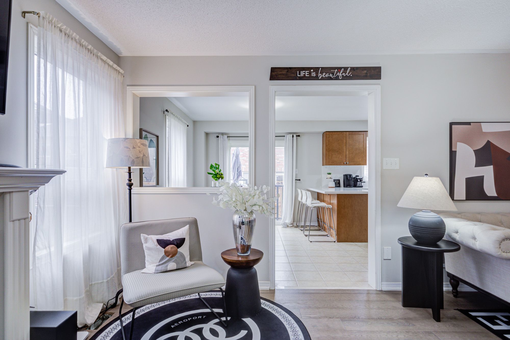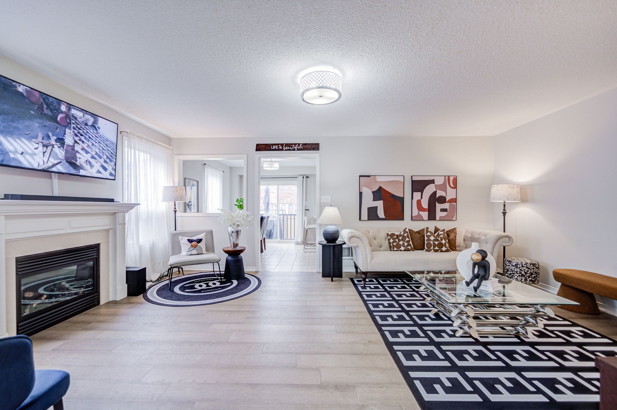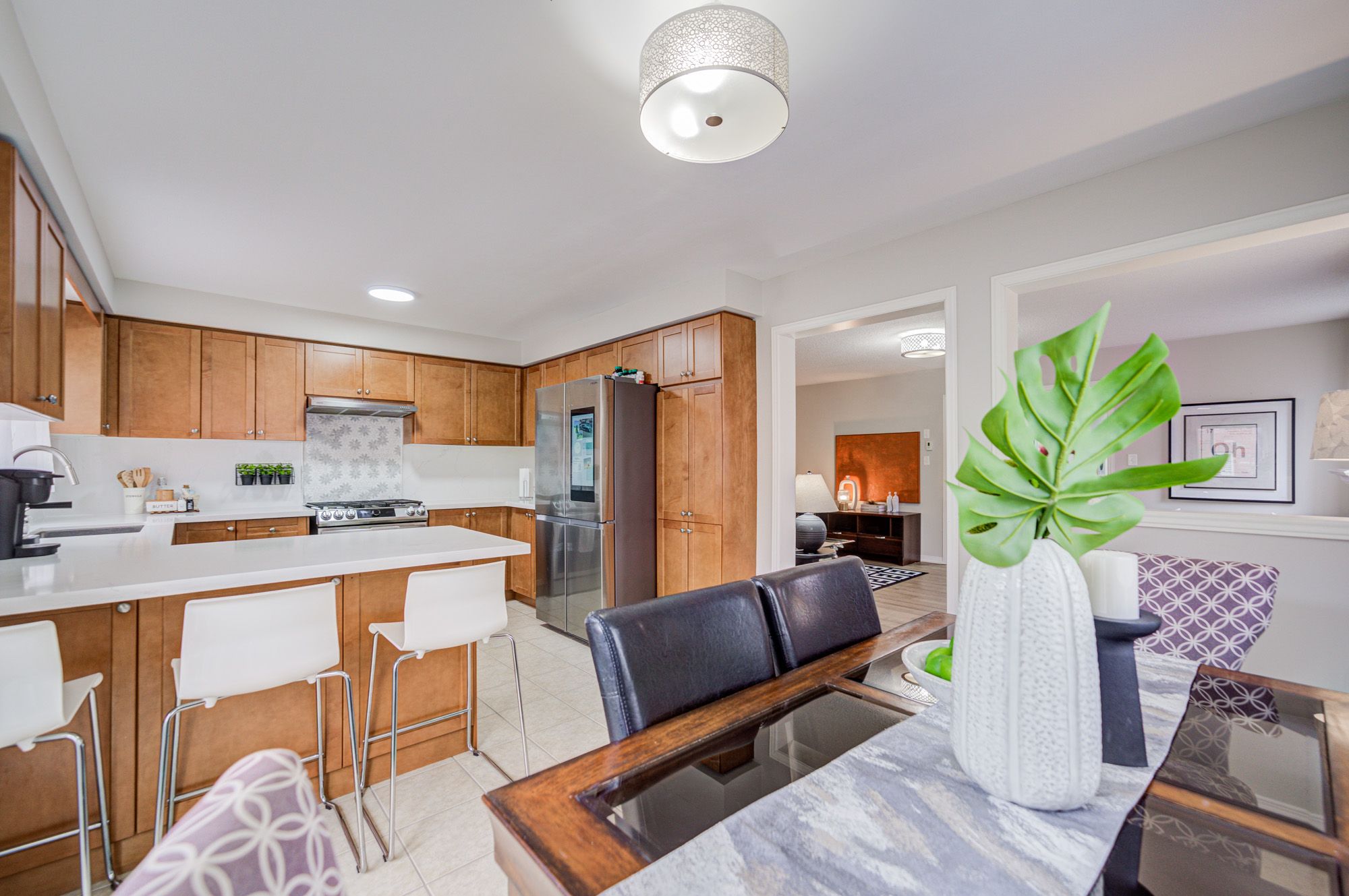 • Upgraded kitchen featuring quartz countertops and easy yard access.