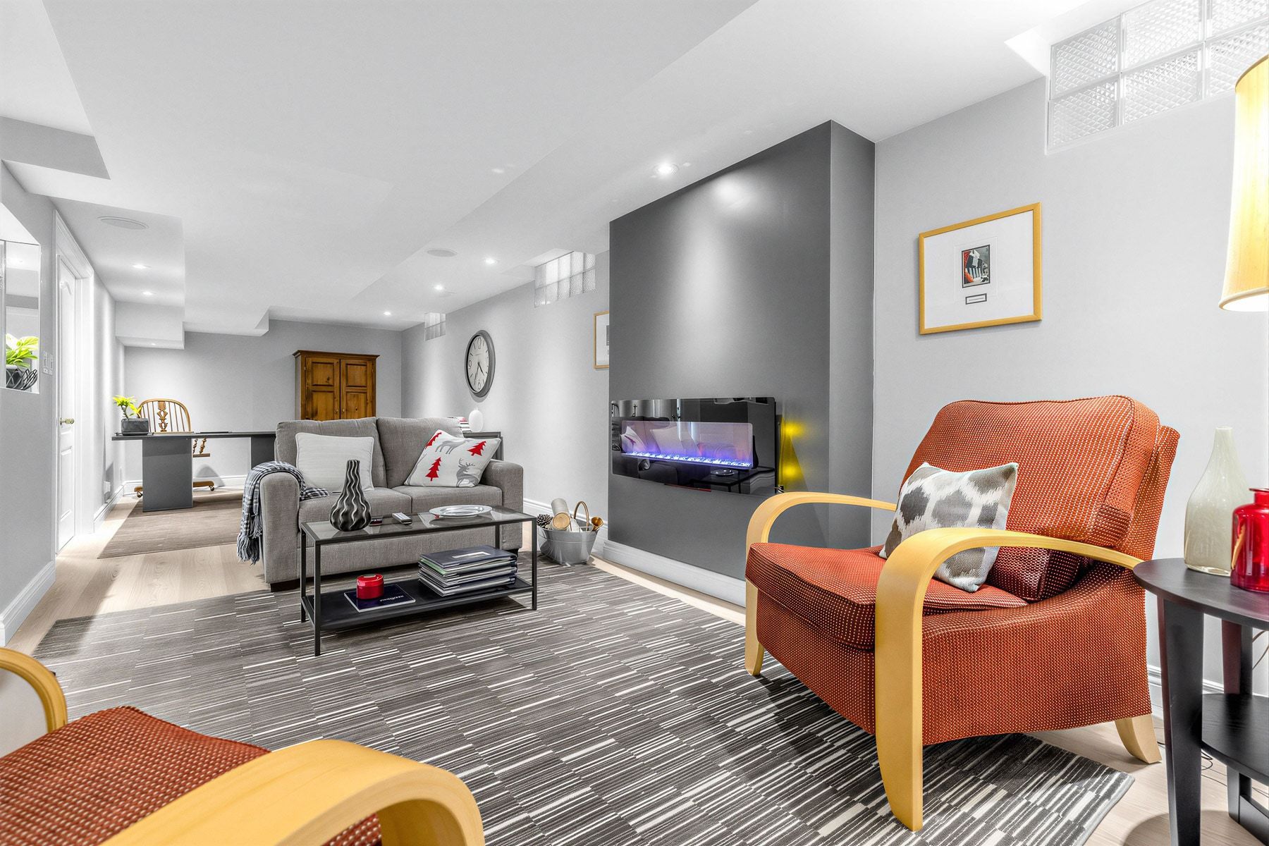 • Finished basement with rec room, exercise room, and wet bar.