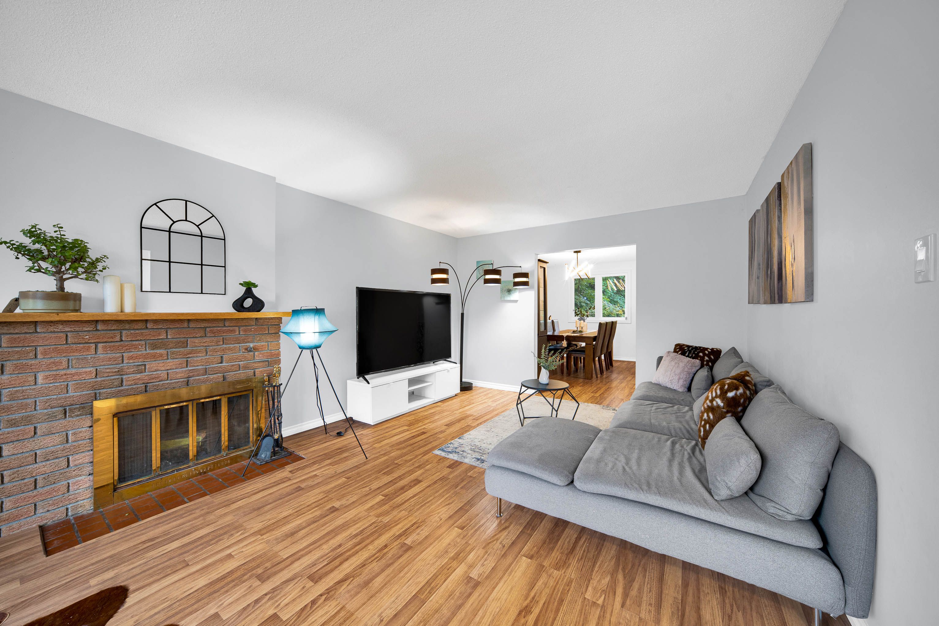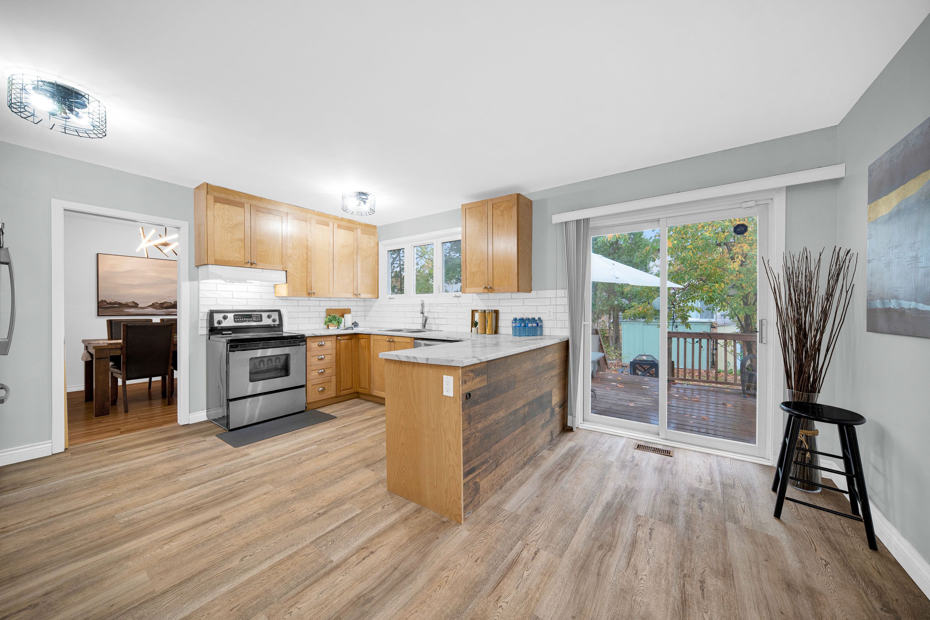 • Open-concept kitchen and dining area leading to a large deck and backyard.