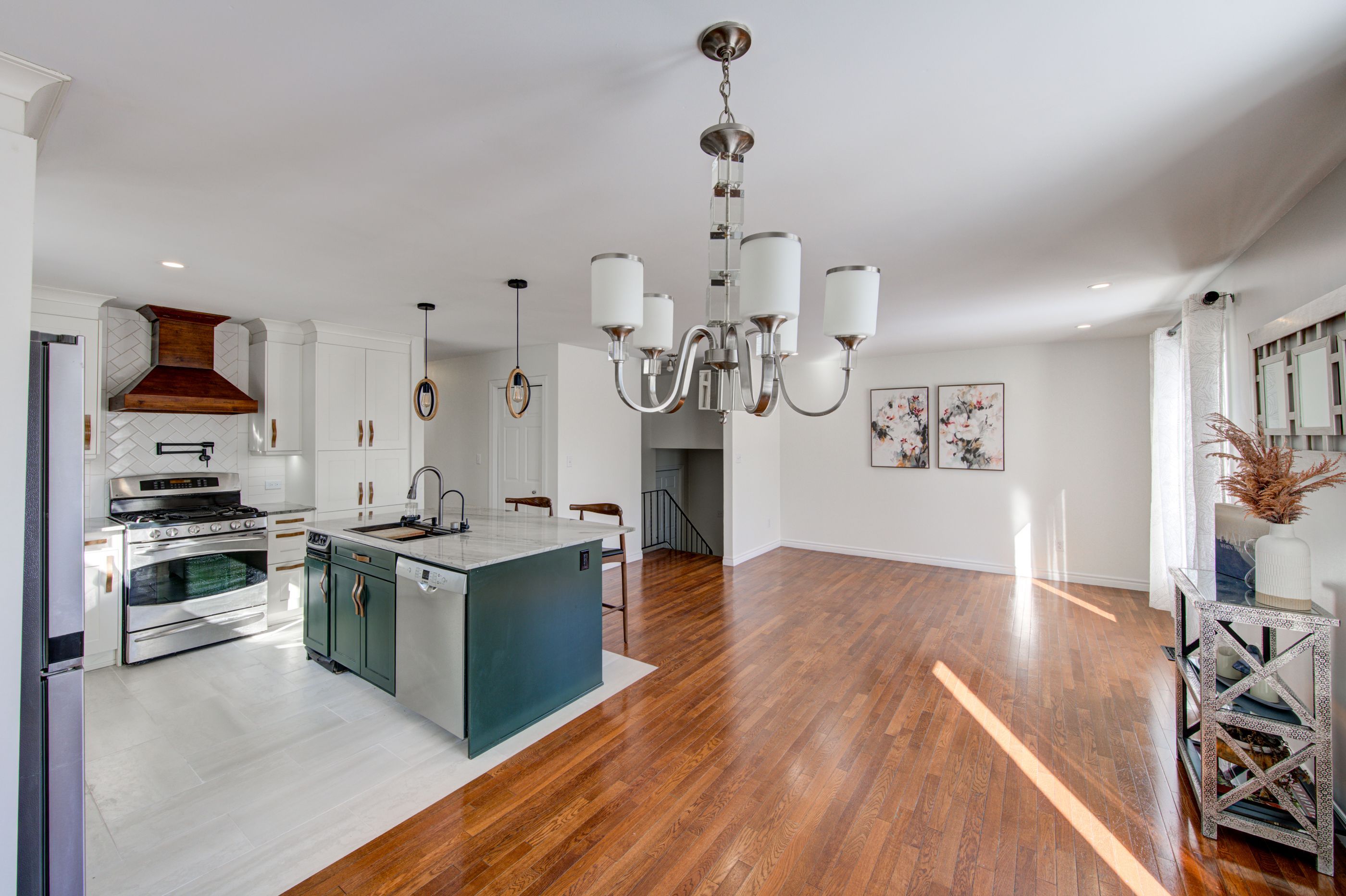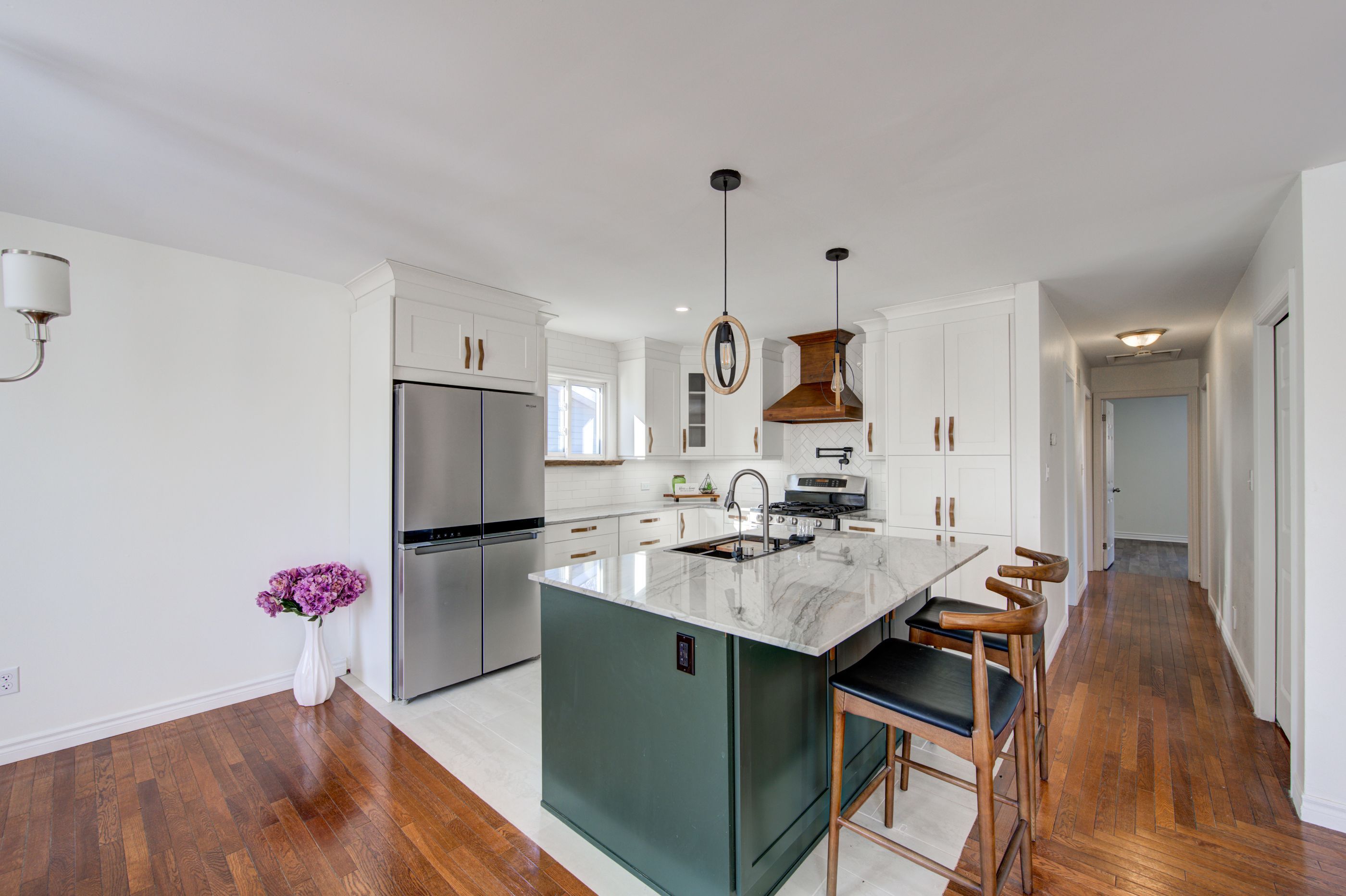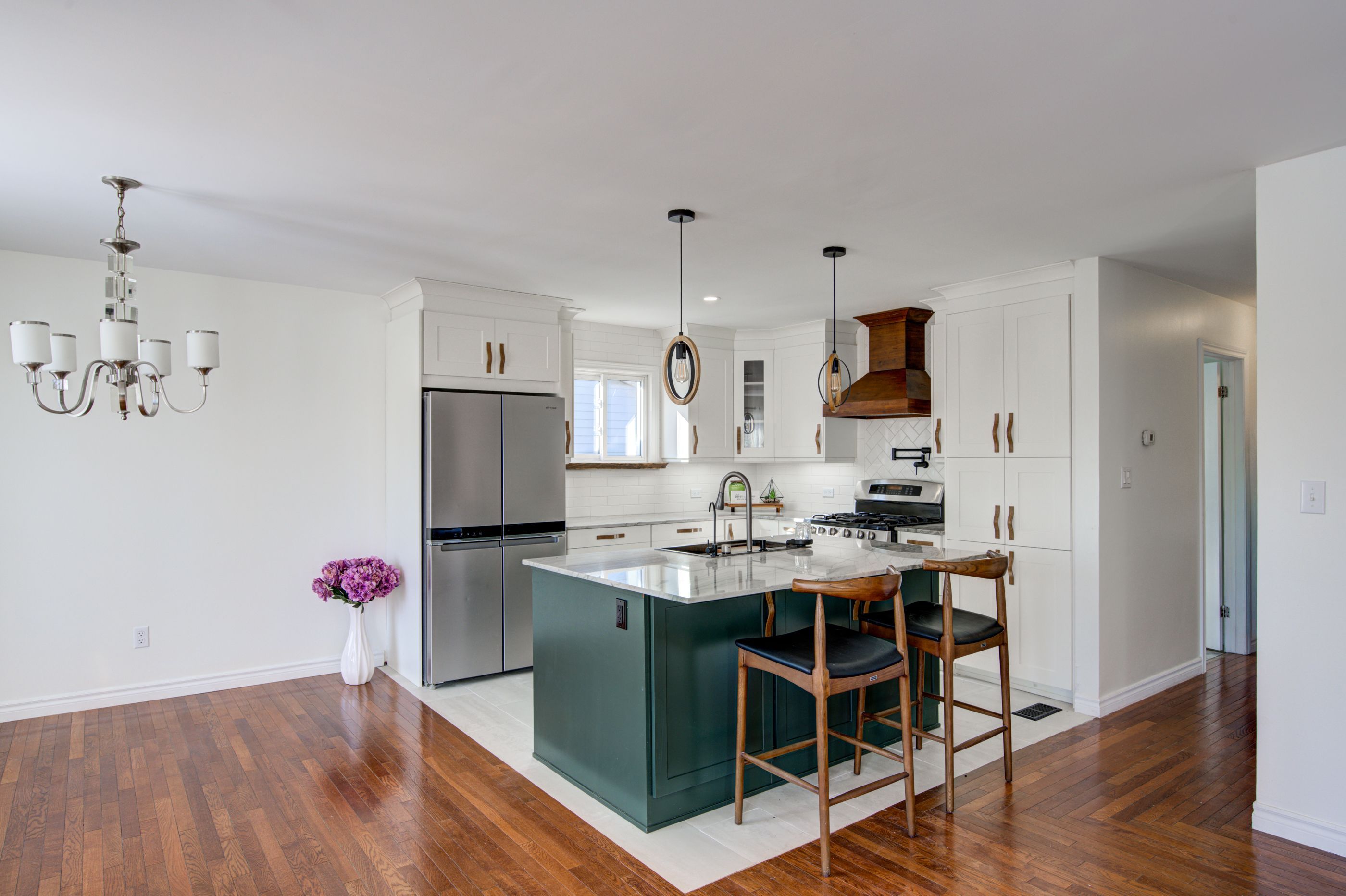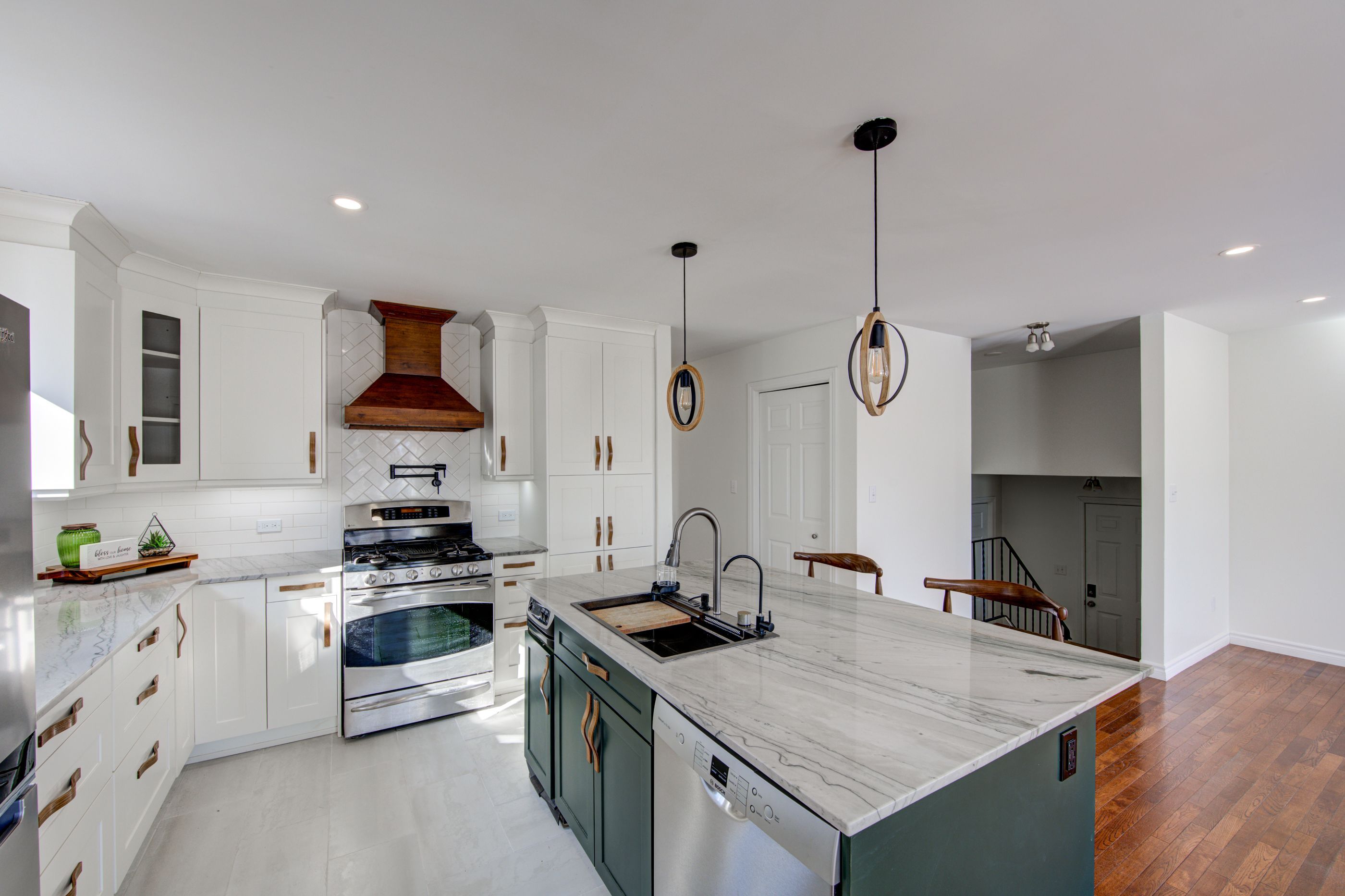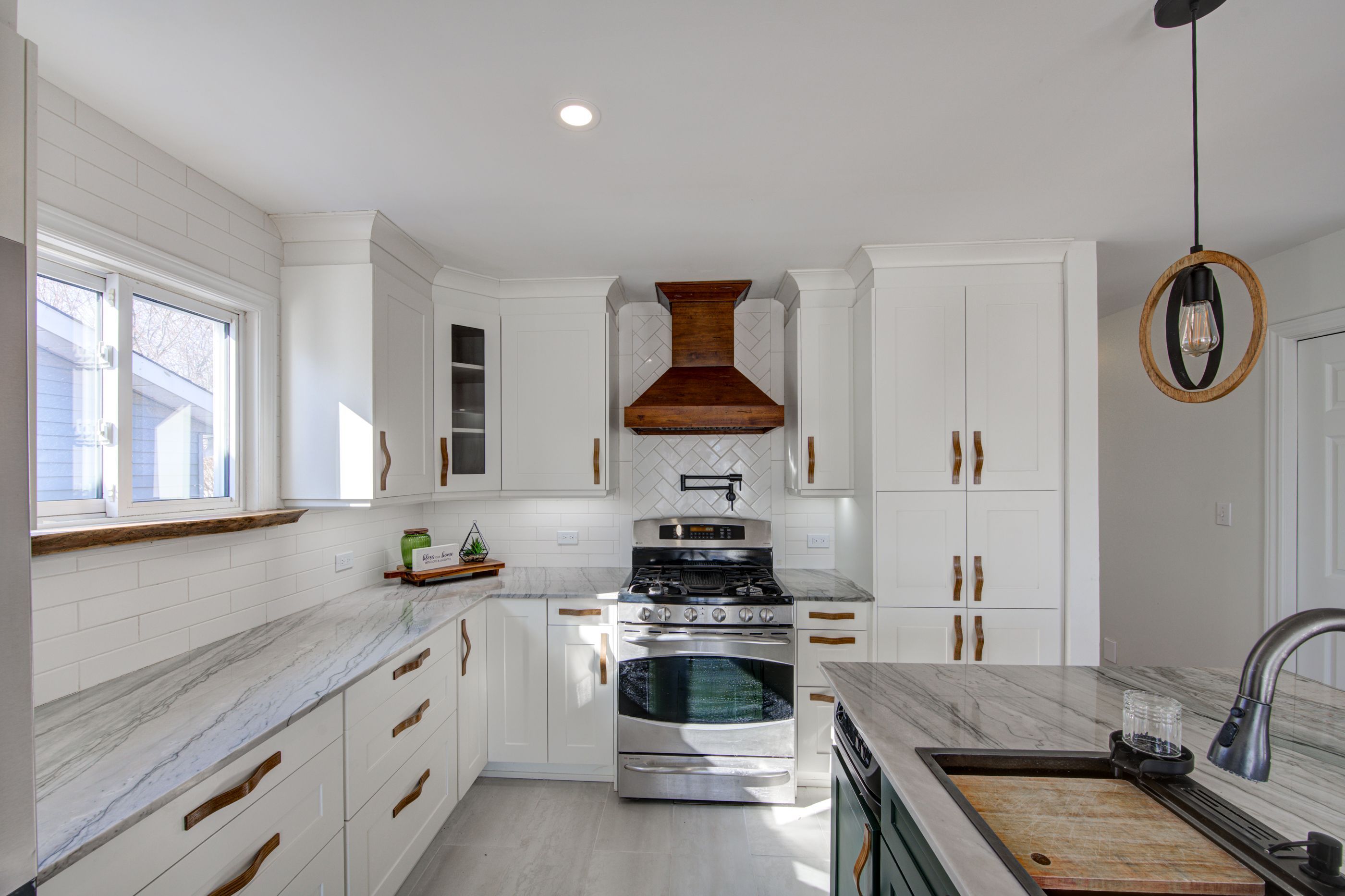 • Updated kitchen with custom island and gas range for cooking enthusiasts.