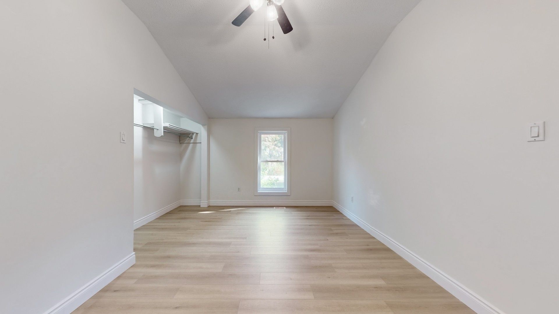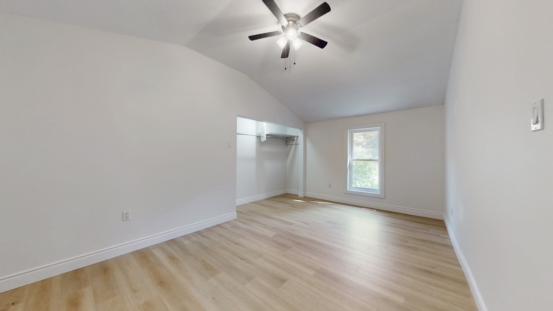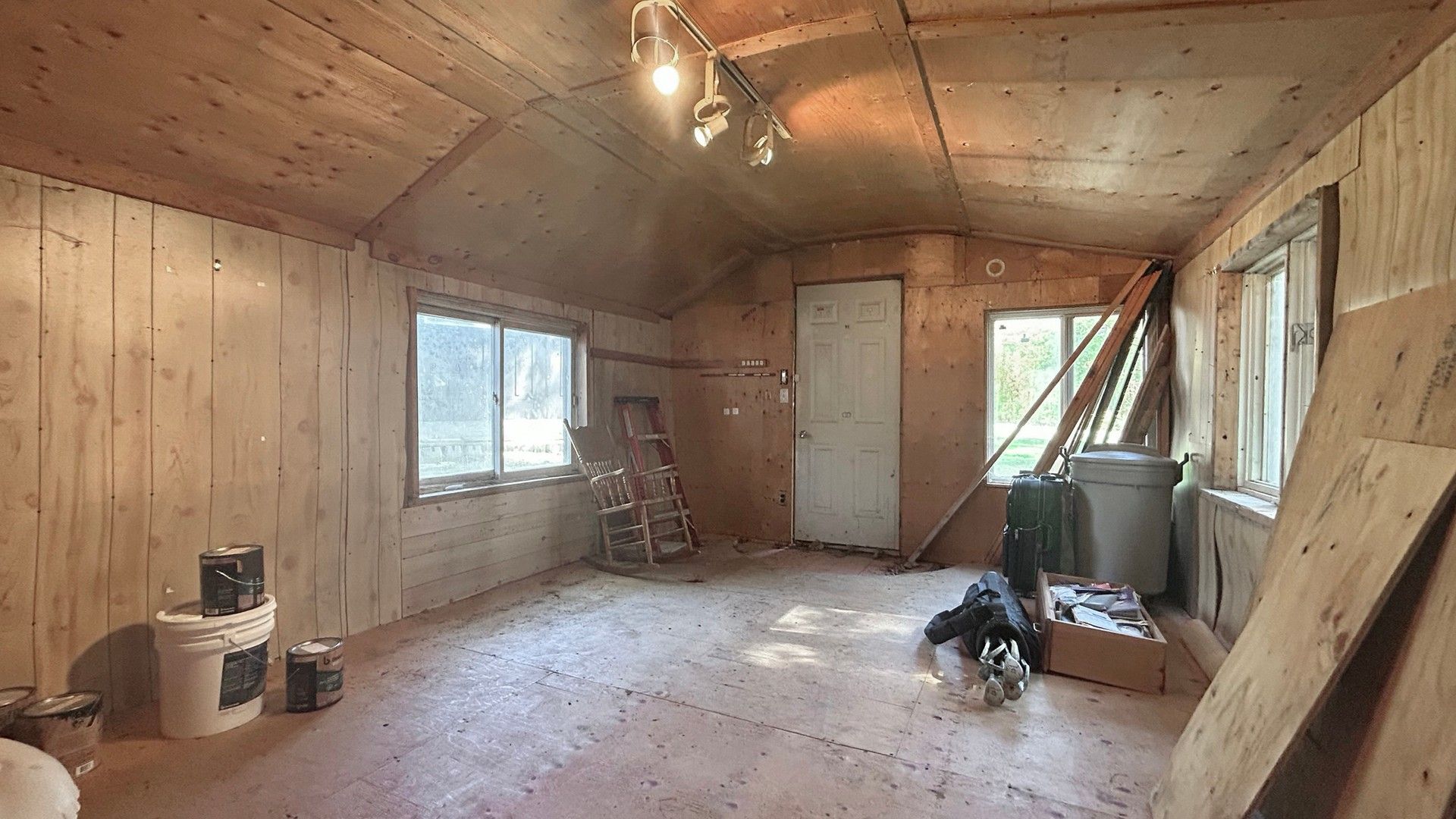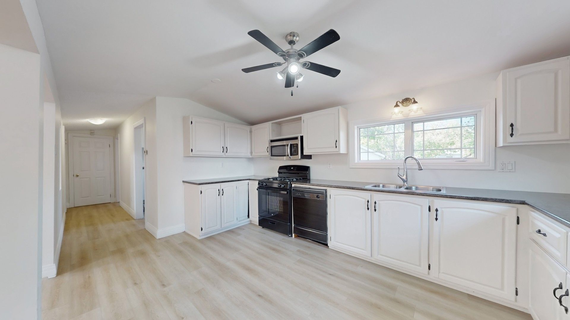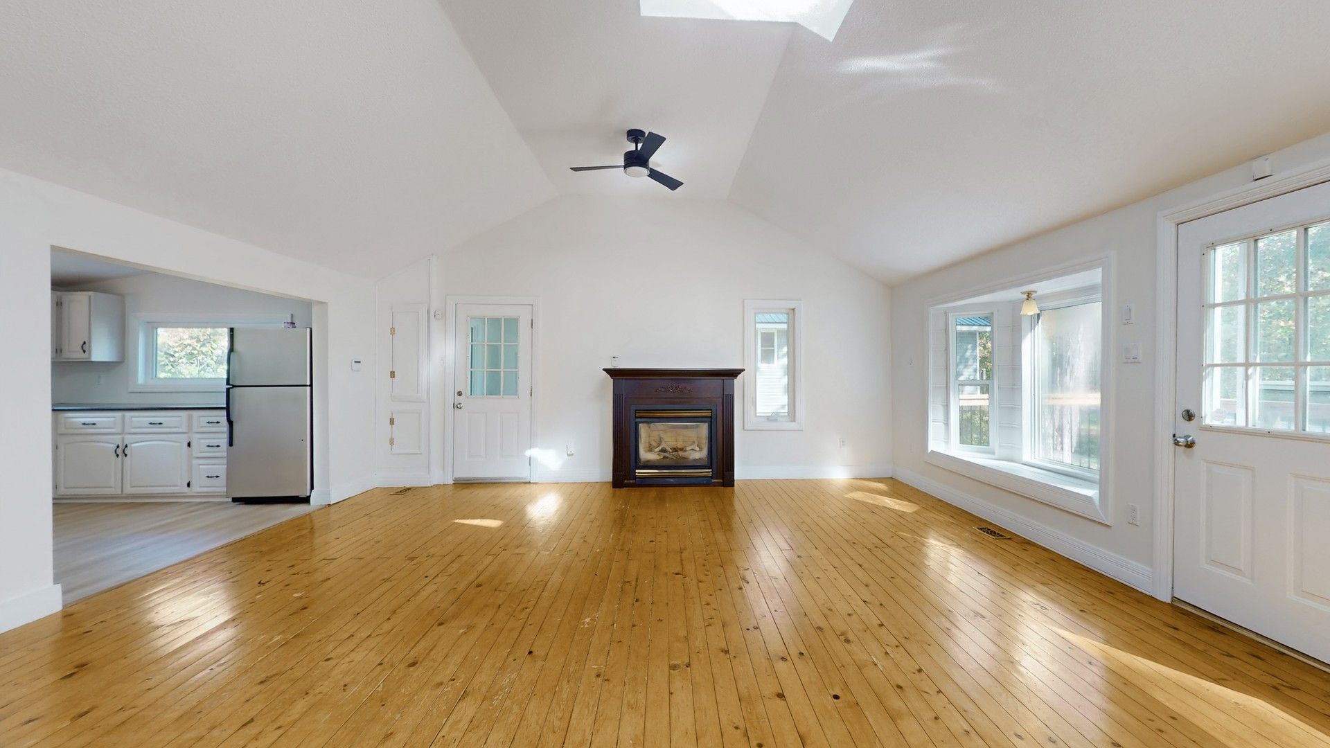 • Open-concept design with hardwood flooring and large windows throughout.