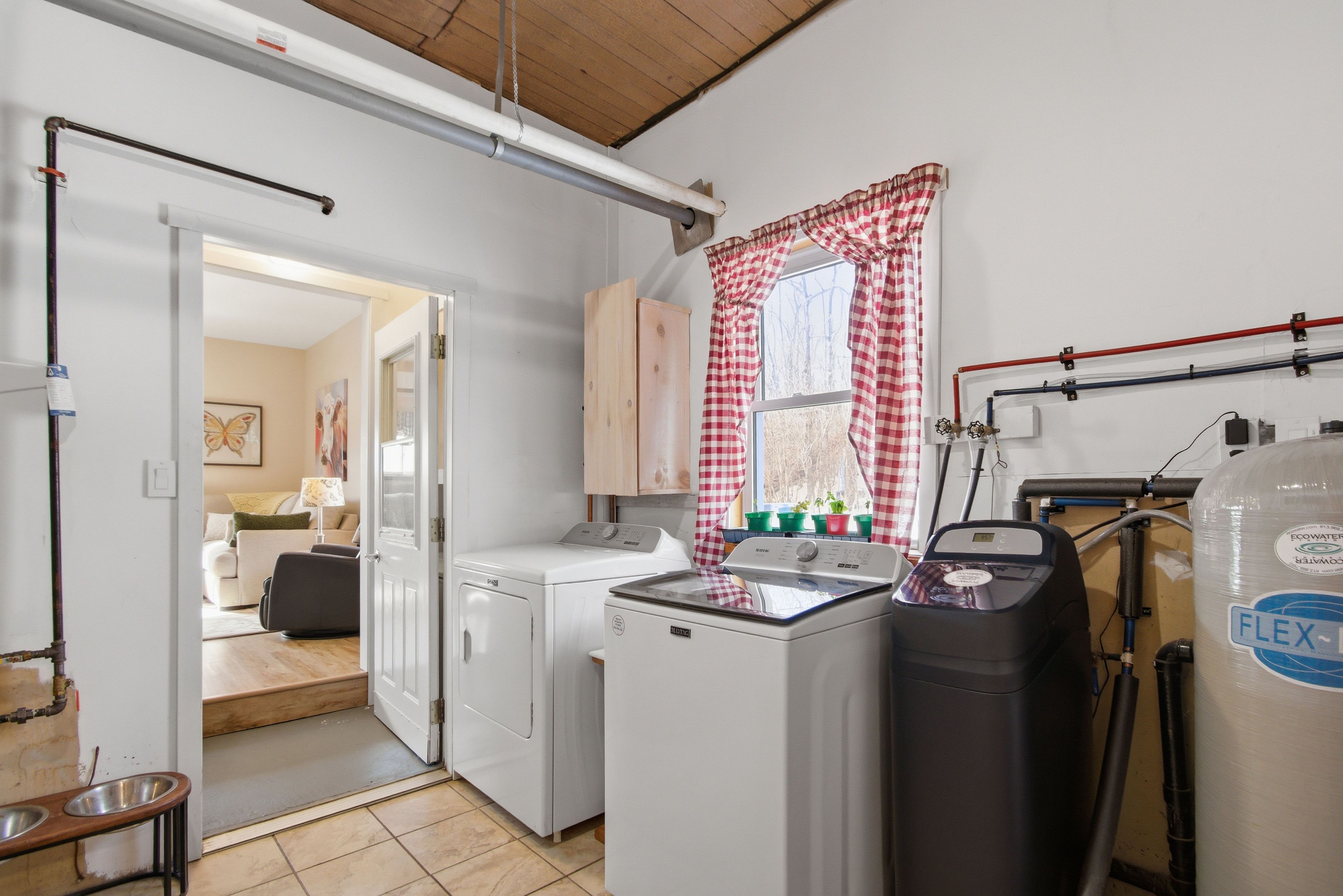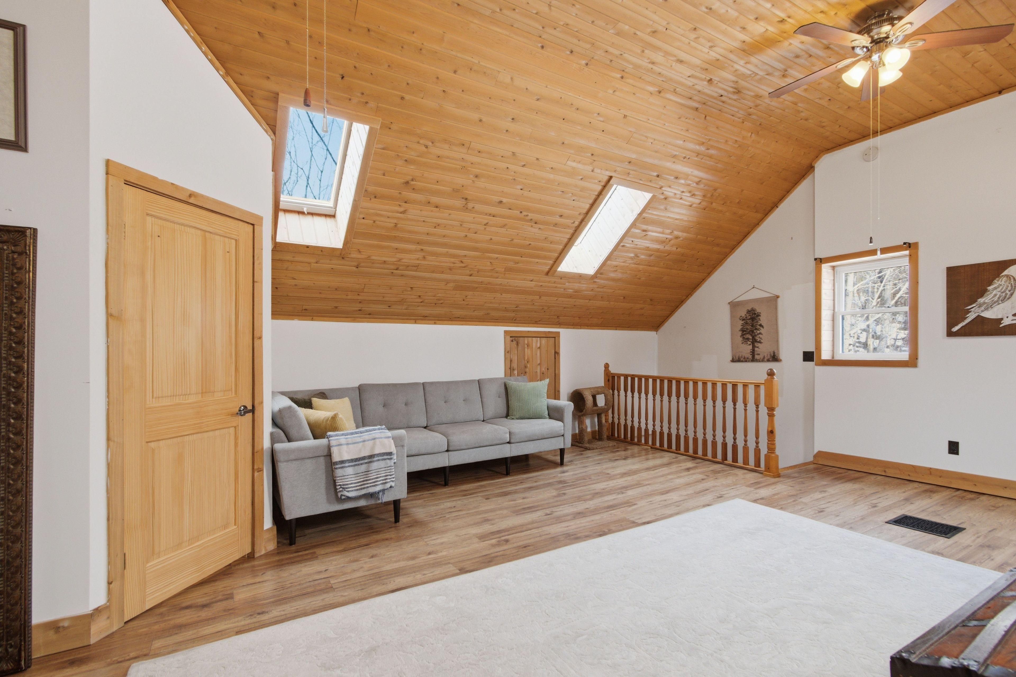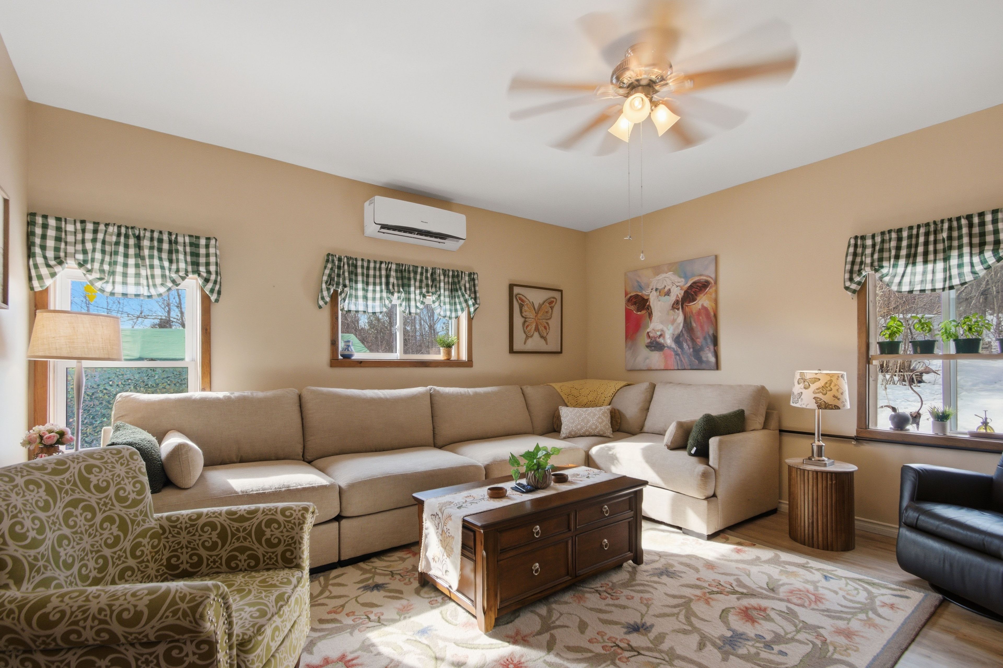 Escape to peaceful country living with this charming and versatile 3 bedroom, 2 bathroom home set in a scenic rural setting with beautiful views in every season. Offering a flexible layout ideal for families, multi generational living, or potential income with an in law suite style setup, this home combines character with thoughtful modern updates throughout. The main floor features warm rustic charm with exposed log ceiling joists, exposed beams, and knotted pine flooring, along with two comfortable living areas, one of which can be converted into a 3rd main level bedroom. The spacious country kitchen with cozy wood stove creates a welcoming gathering space, complemented by newer appliances and refreshed interior finishes. The entry area and updated 3 piece bathroom feature heated floors, plus a convenient main floor utility and laundry space supported by an efficient upgraded boiler system. Upstairs offers a bright primary retreat with skylights, a 3 piece ensuite style bathroom, and a large family or rec room with modern finishes and walkout to a private upper deck overlooking the countryside, enhanced by a ductless heat pump system providing efficient heating and cooling. With numerous renovations already completed and low property taxes adding exceptional value, this inviting country property delivers comfort, flexibility, and lifestyle in one truly special place to call home.