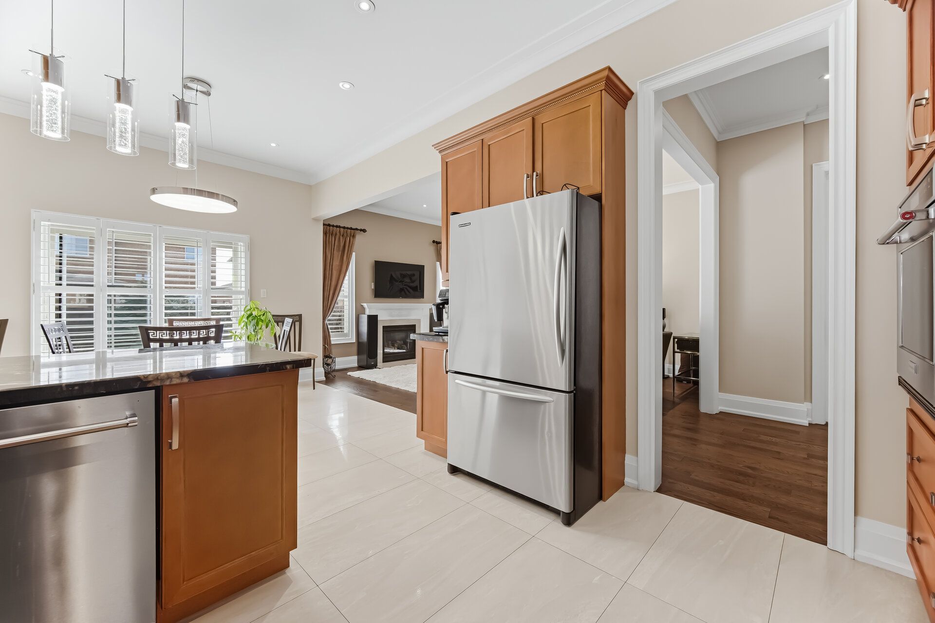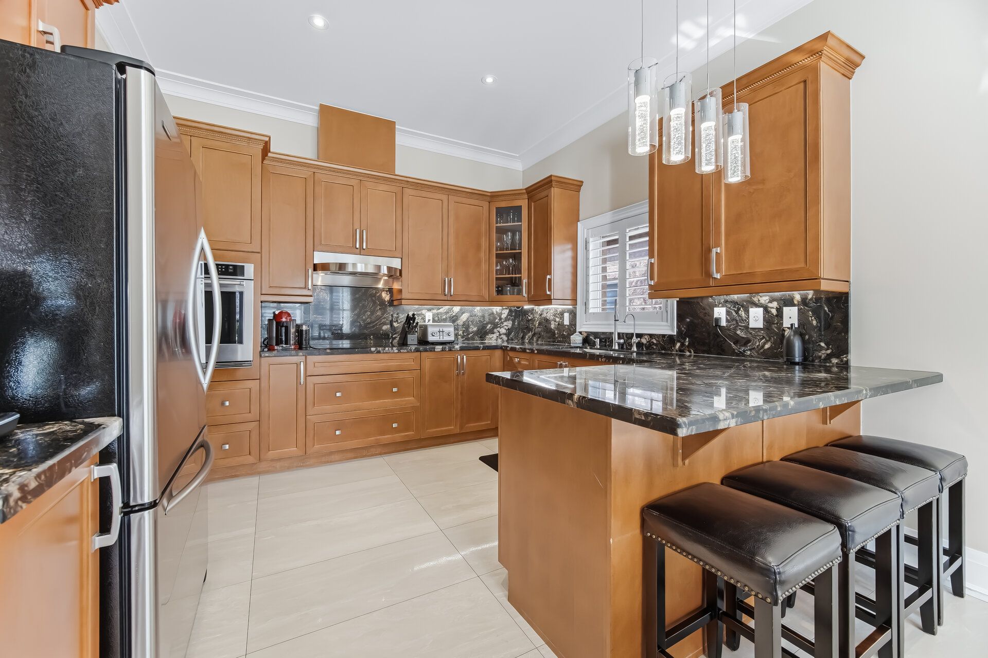 • Open-concept kitchen with granite finishes and built-in appliances.