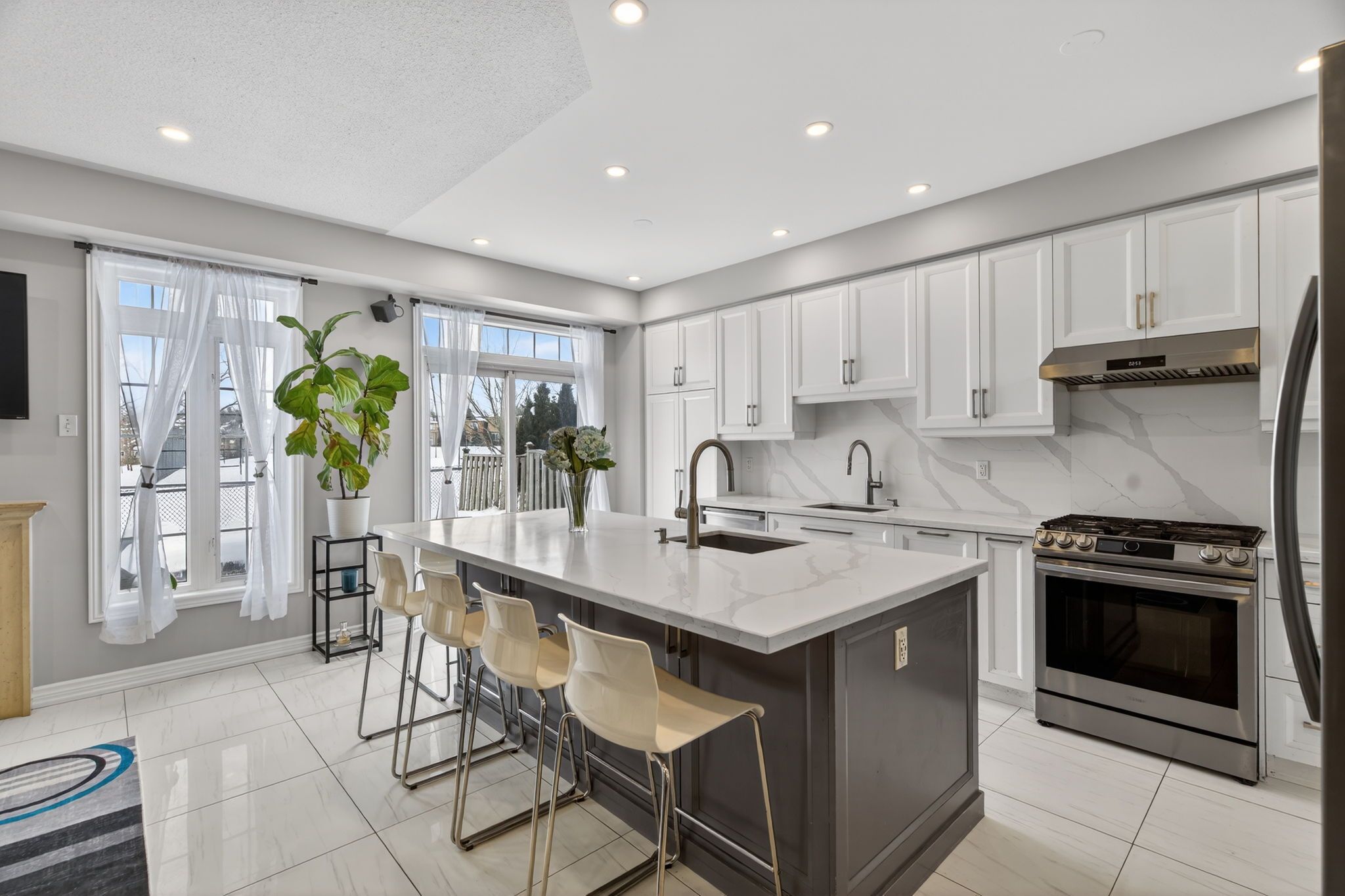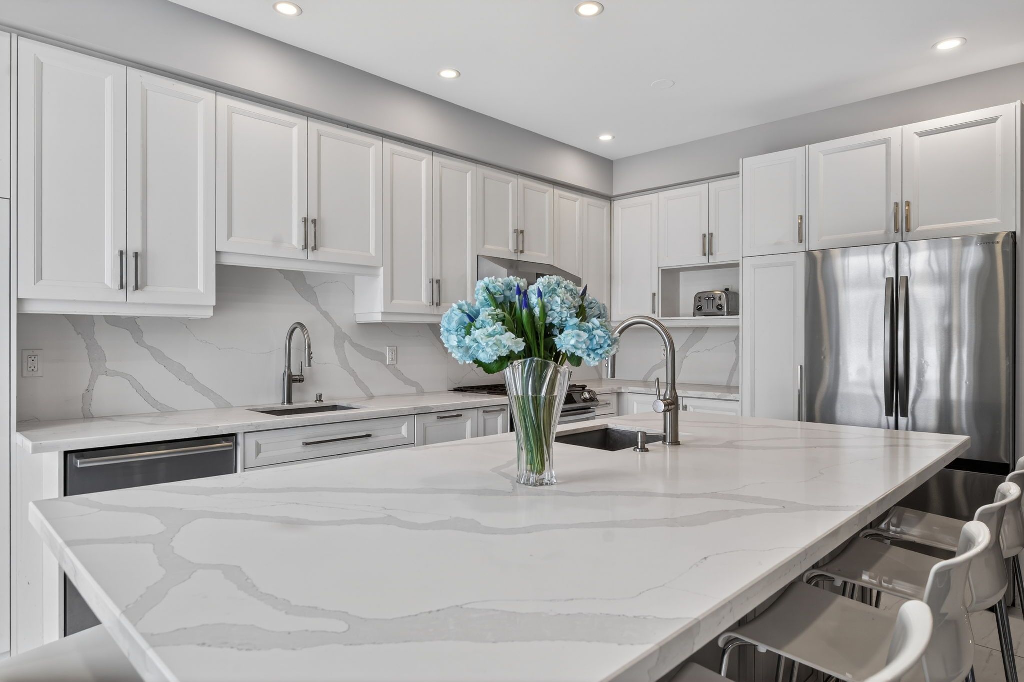 • Modern kitchen with large island, quartz countertops, and stainless steel appliances.