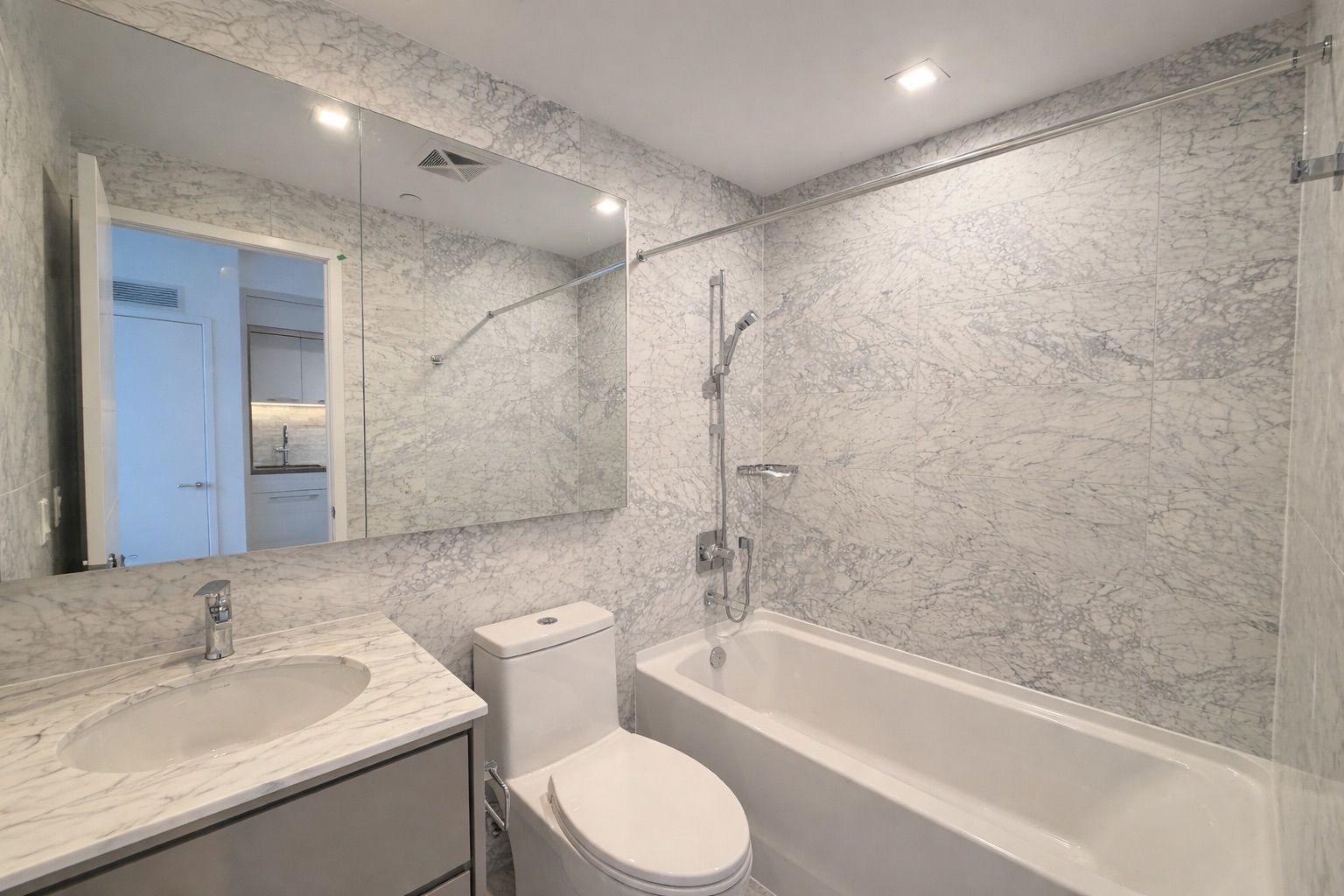 • Upgraded high-end appliances and a sleek marble bathroom for modern living.