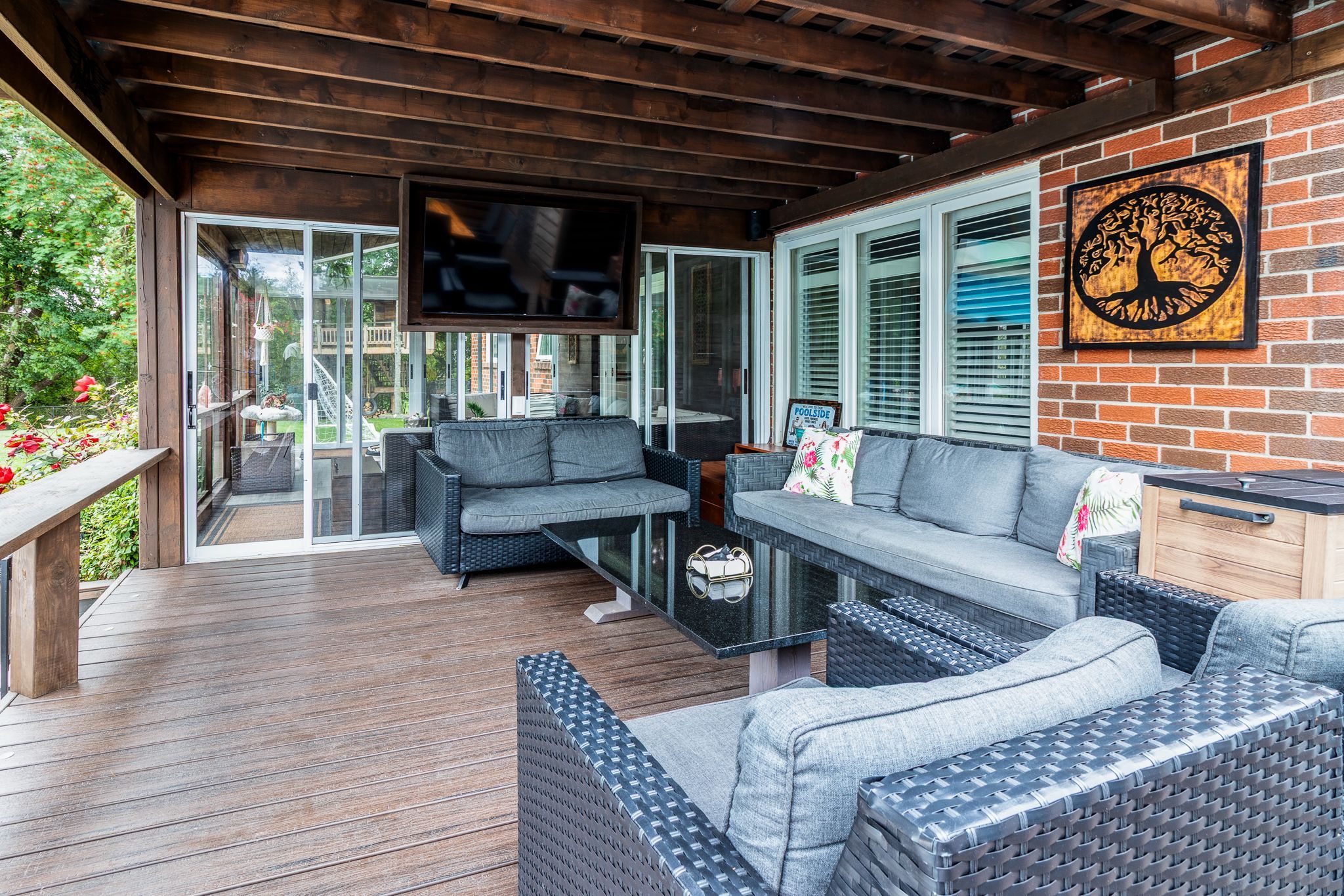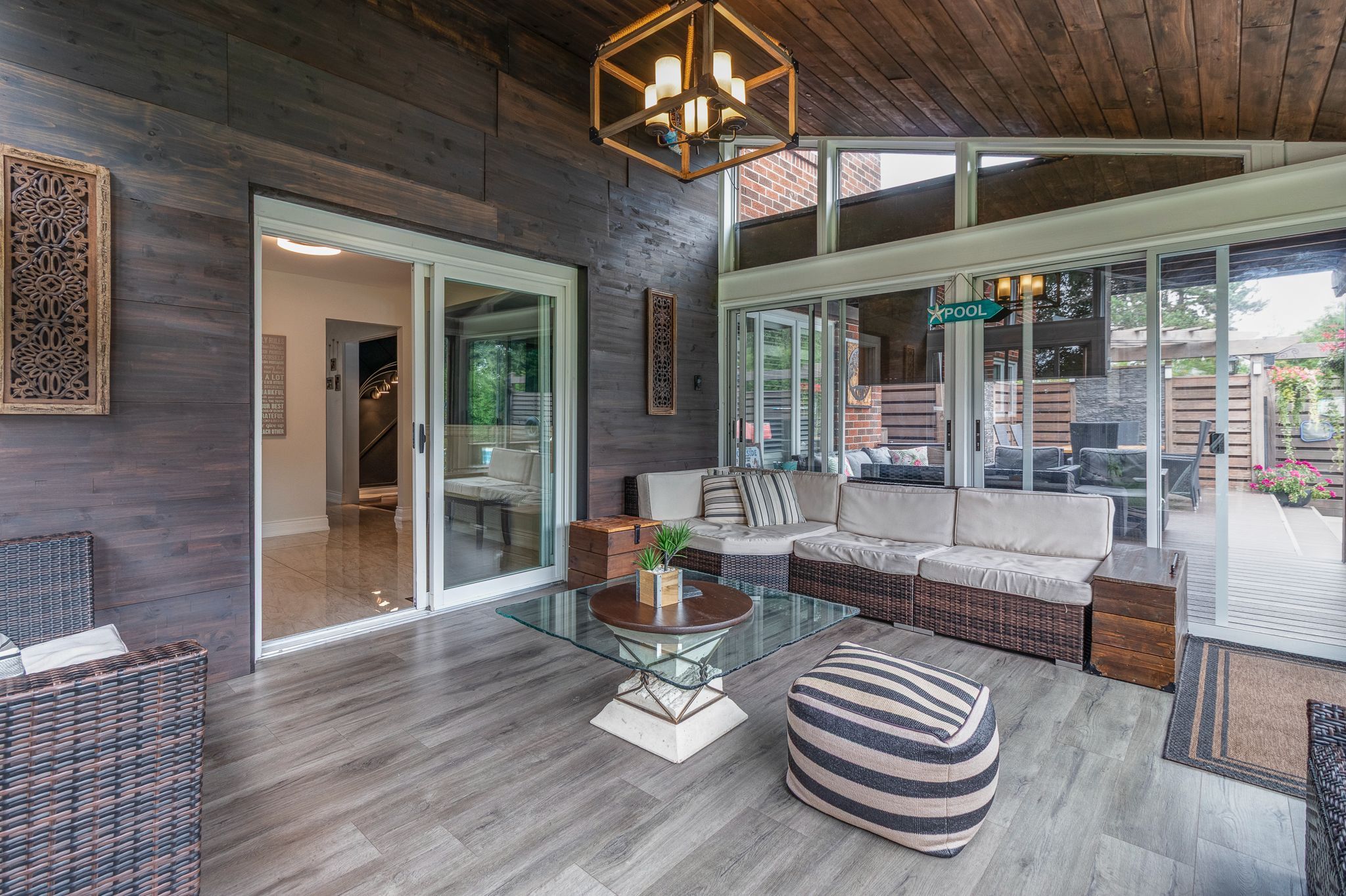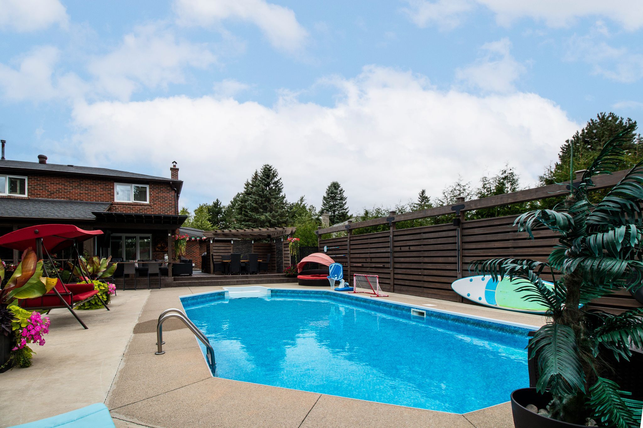 • Backyard oasis featuring in-ground pool, patio, and covered lounge area.
