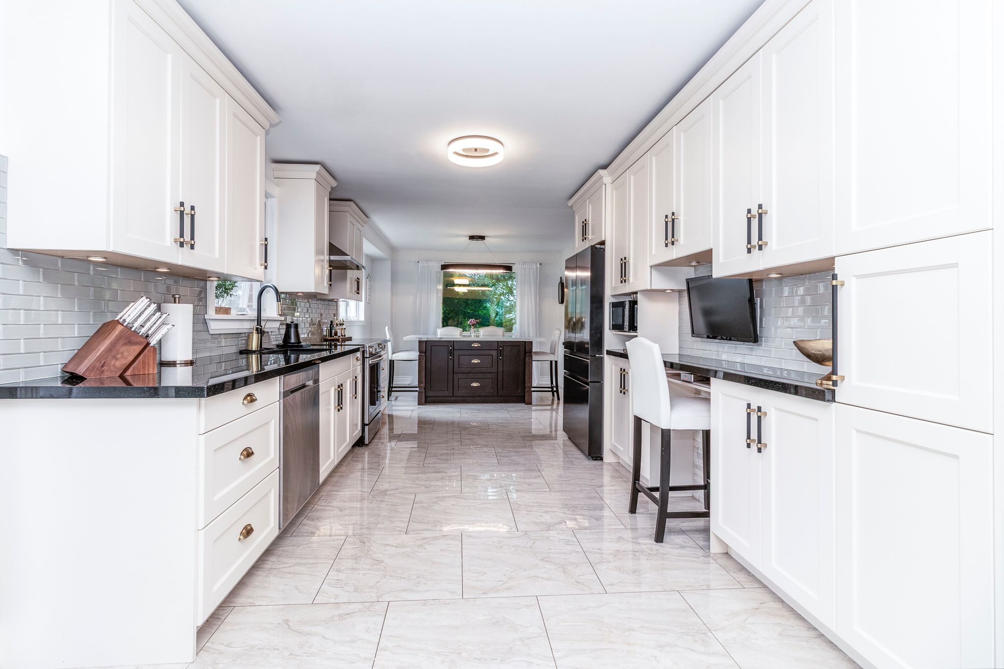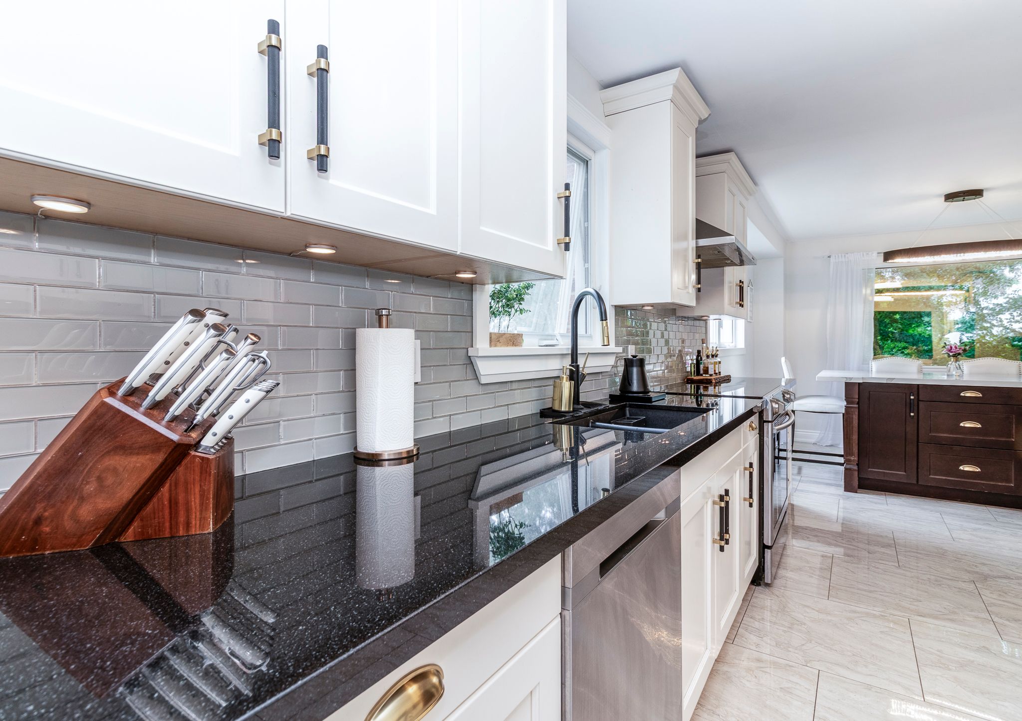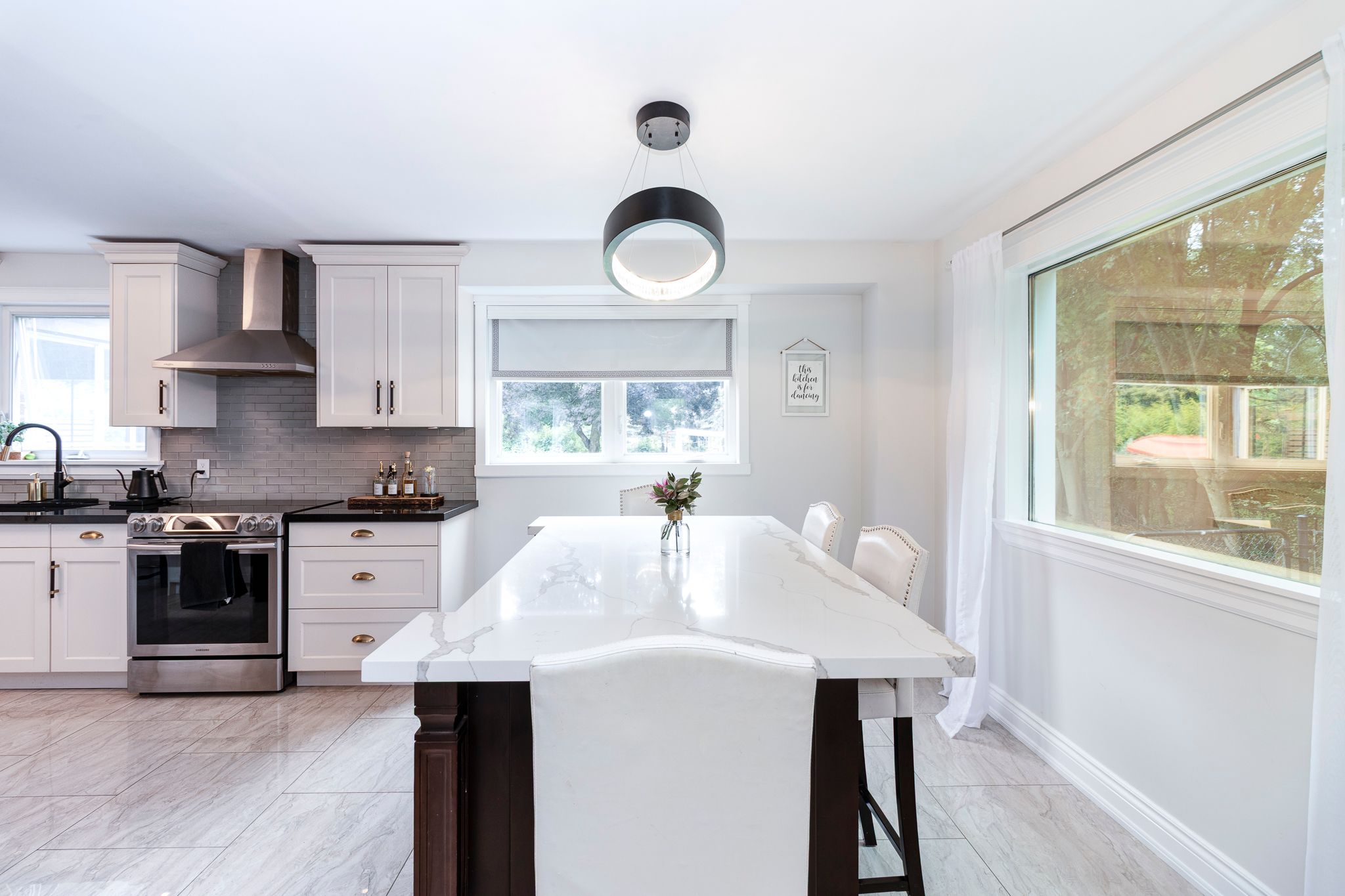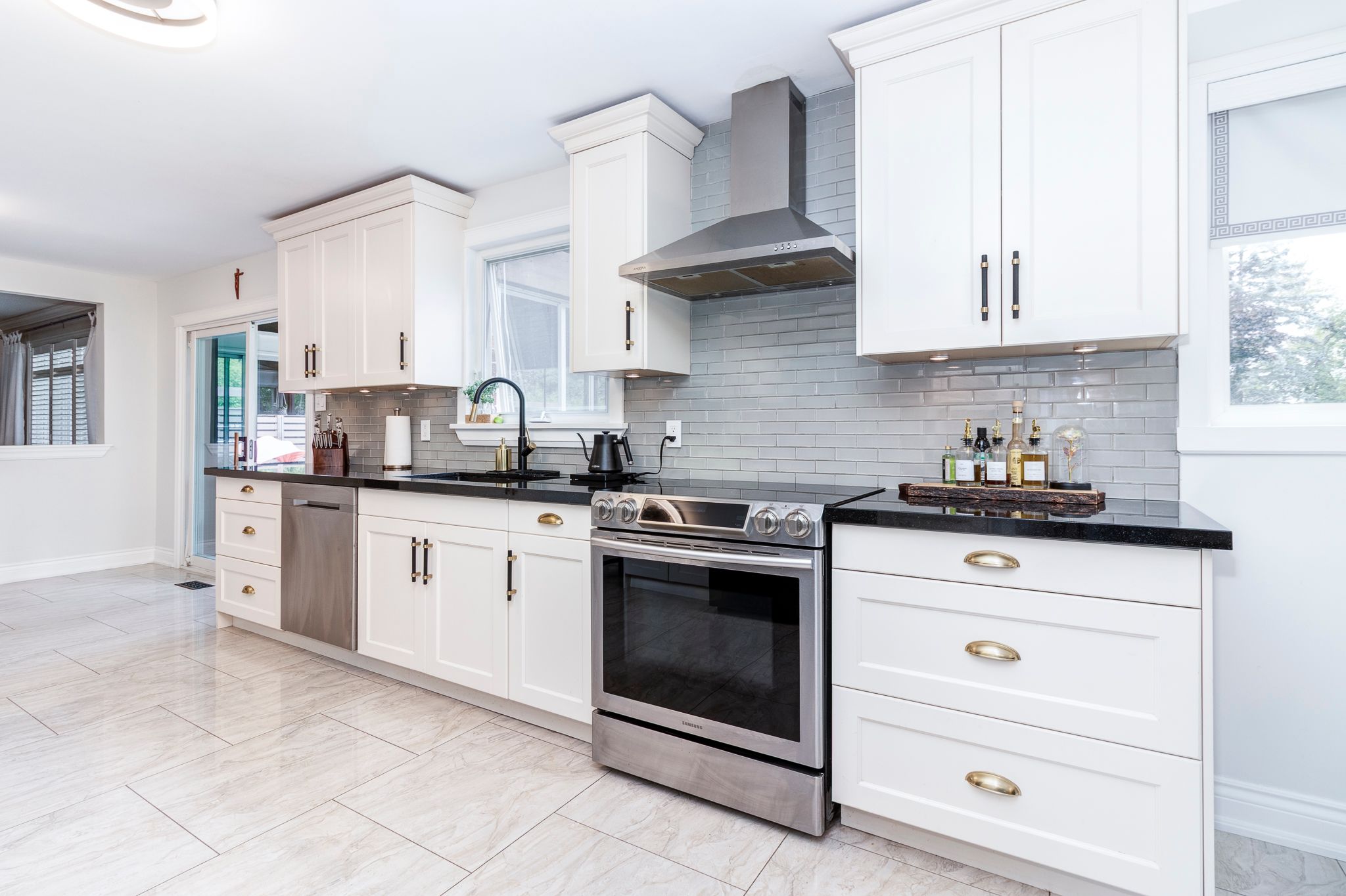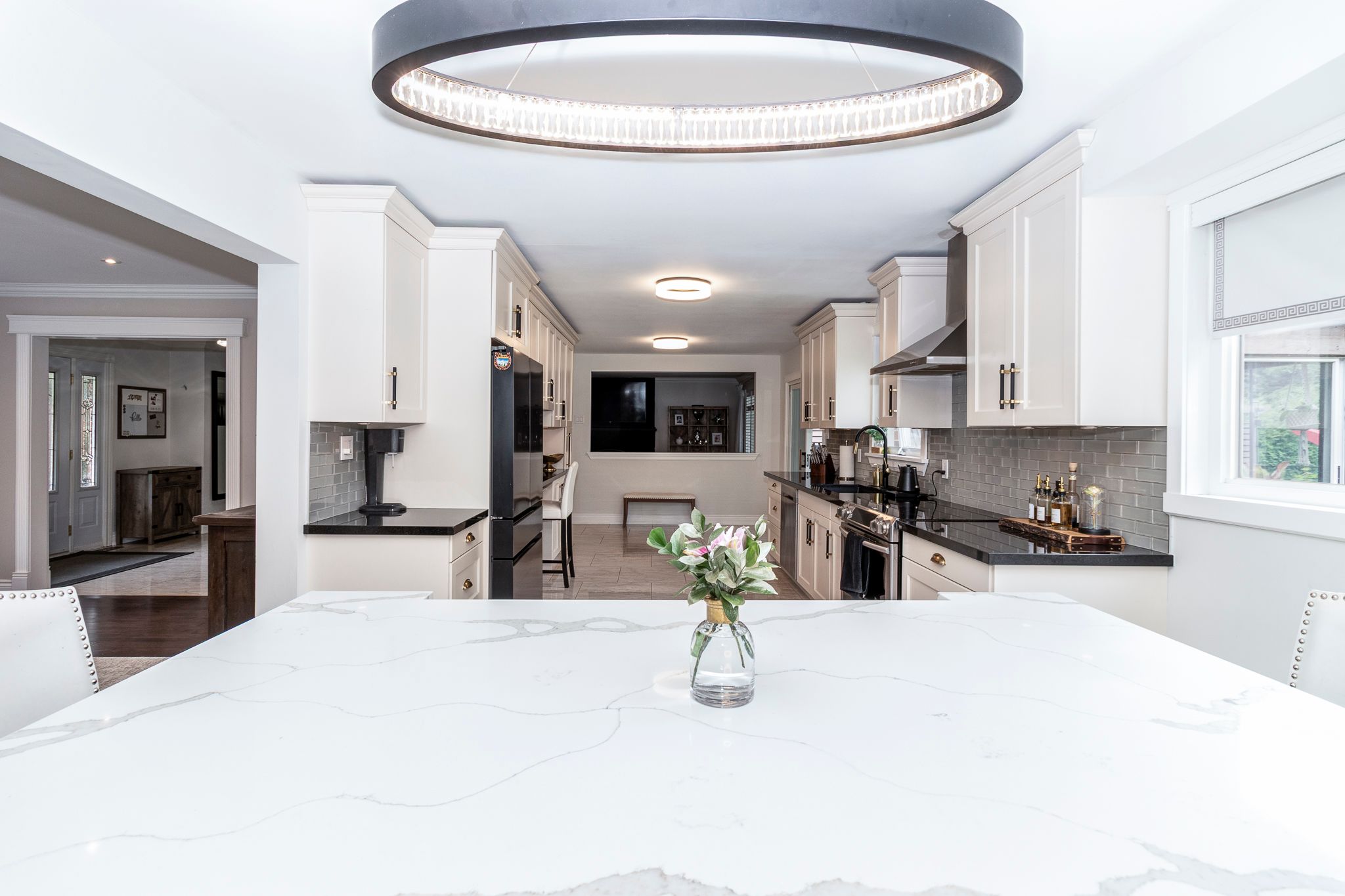 • Renovated kitchen with quartz countertops and stainless steel appliances.