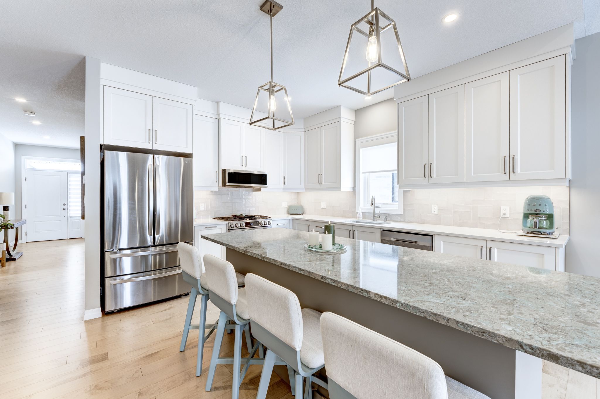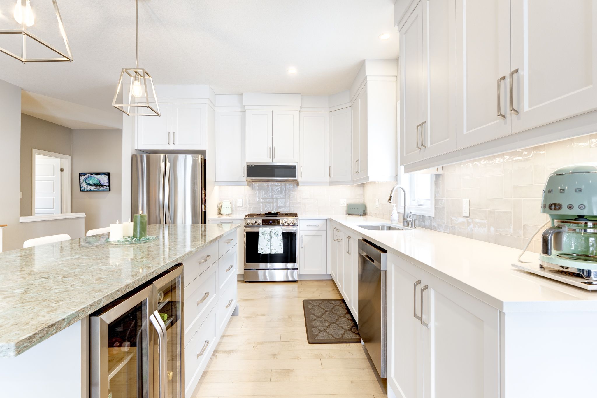• Spacious custom kitchen featuring quartz countertops and a wine fridge.