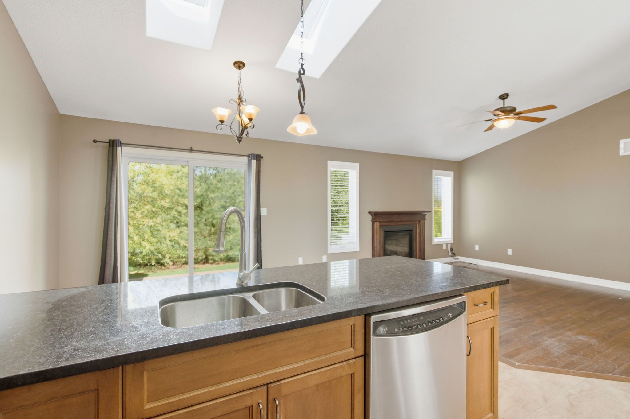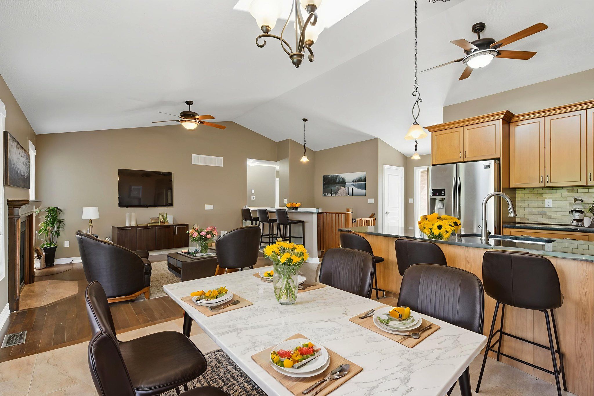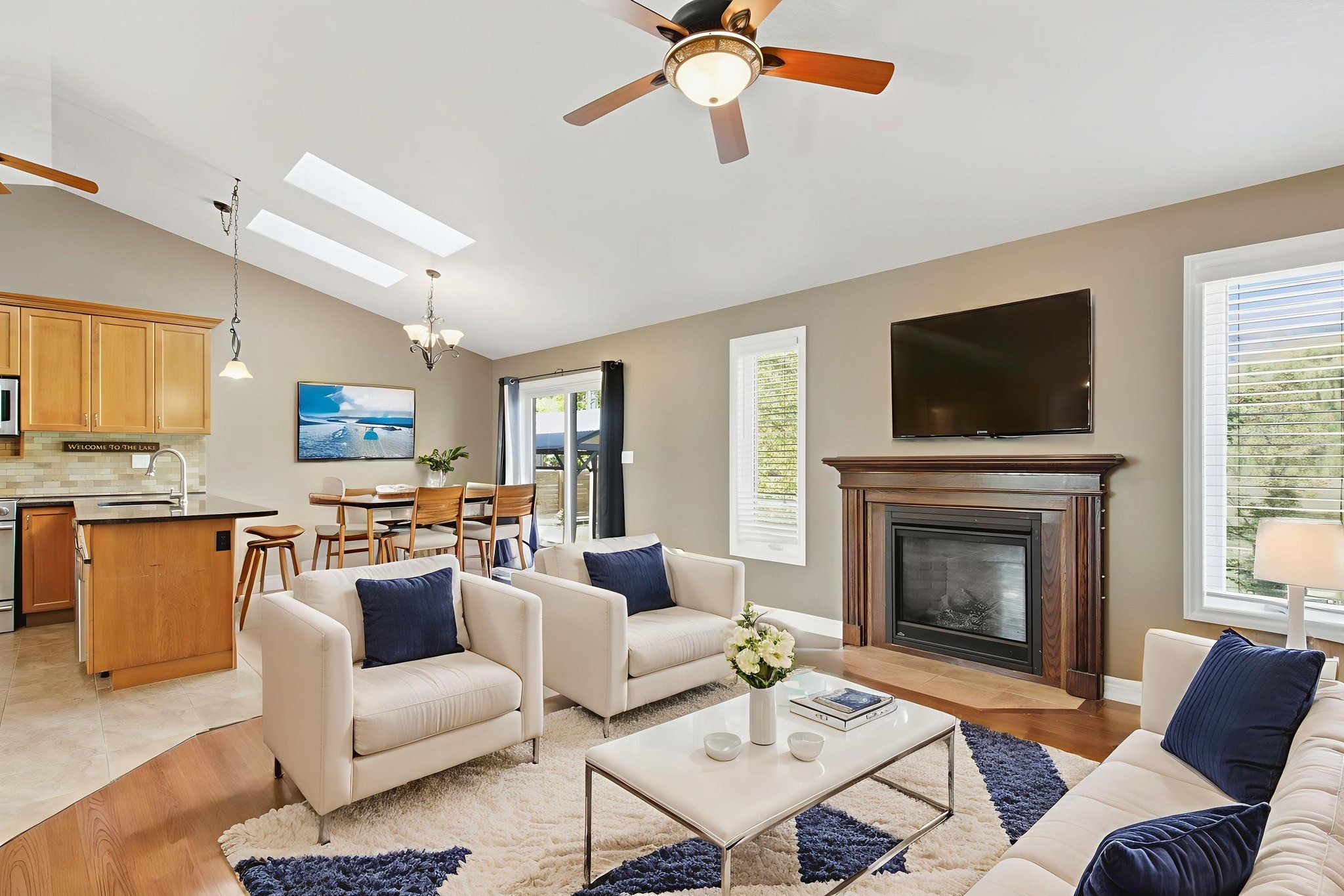 • Open concept main level with gas fireplace and modern kitchen appliances.