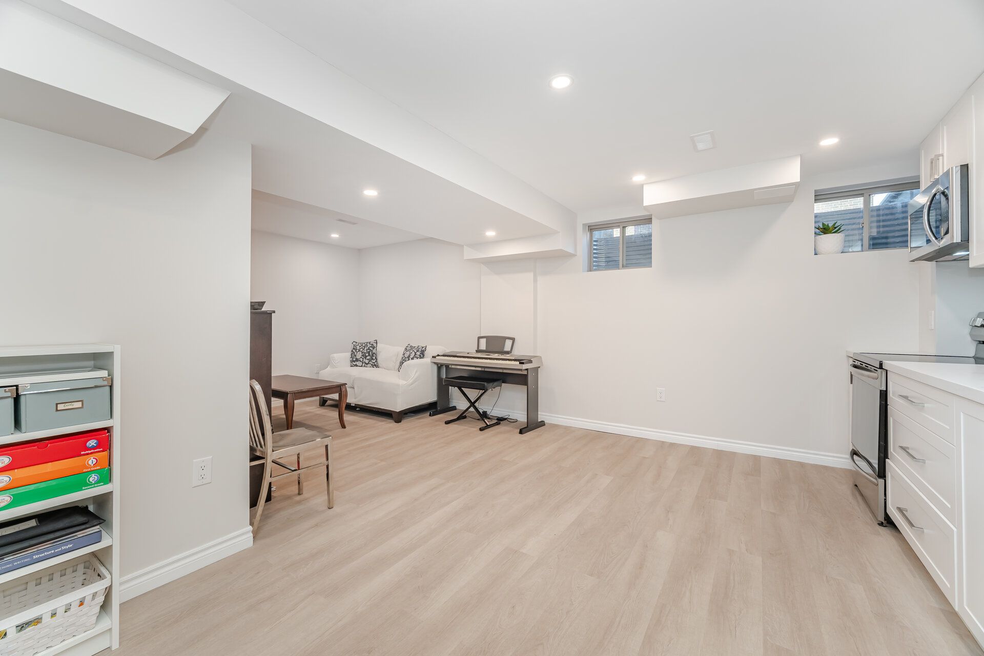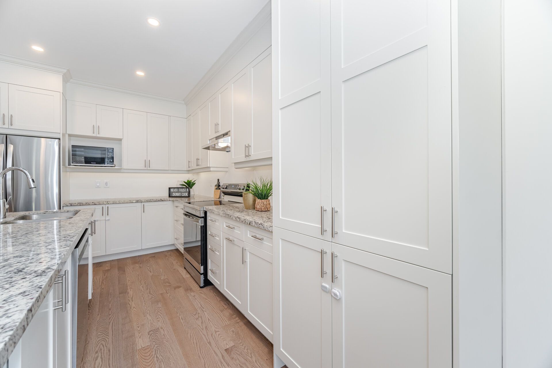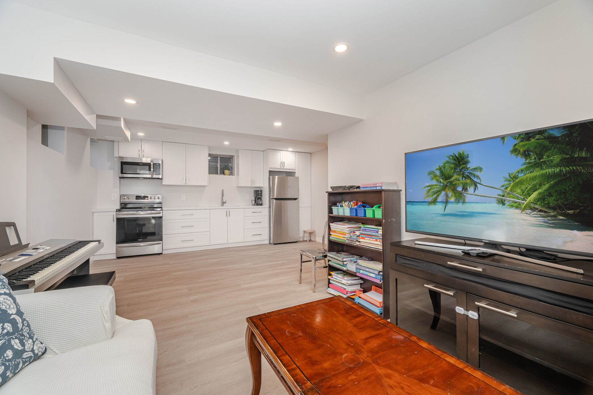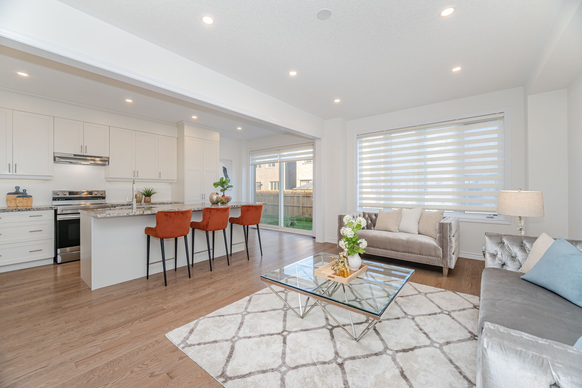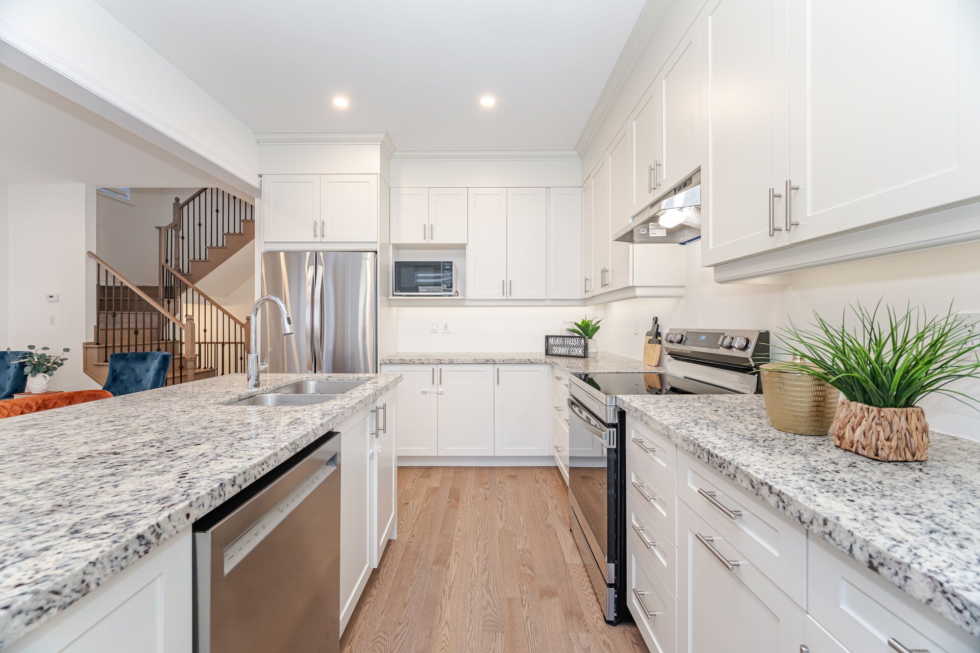 • Open-concept living area with hardwood floors and 9-ft ceilings.