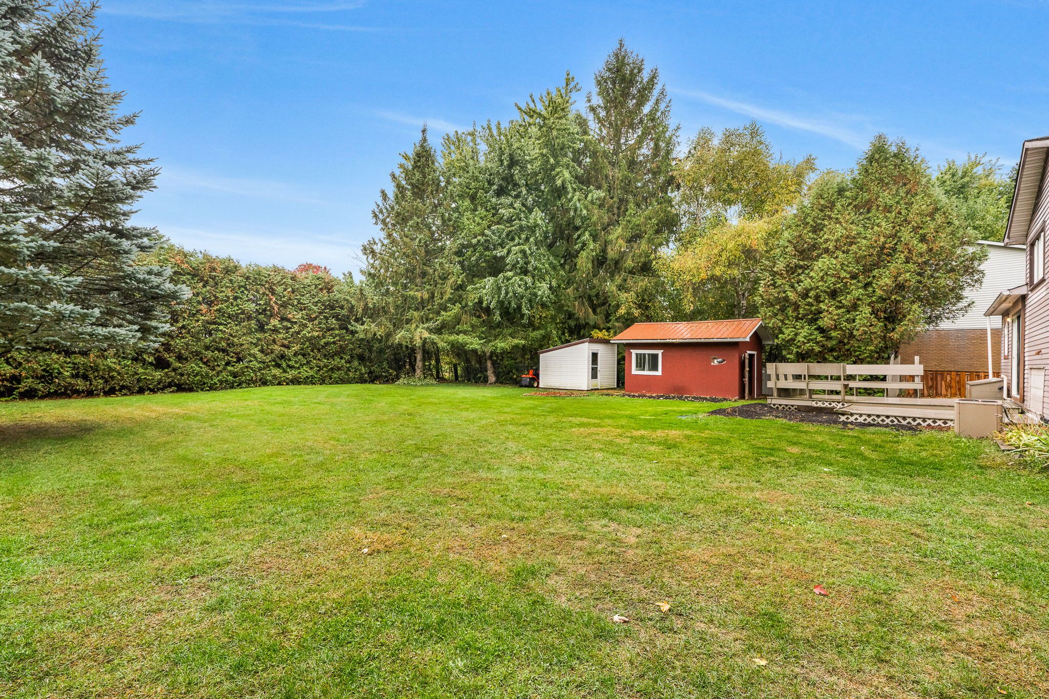 • Private backyard with mature trees and large deck for relaxation.