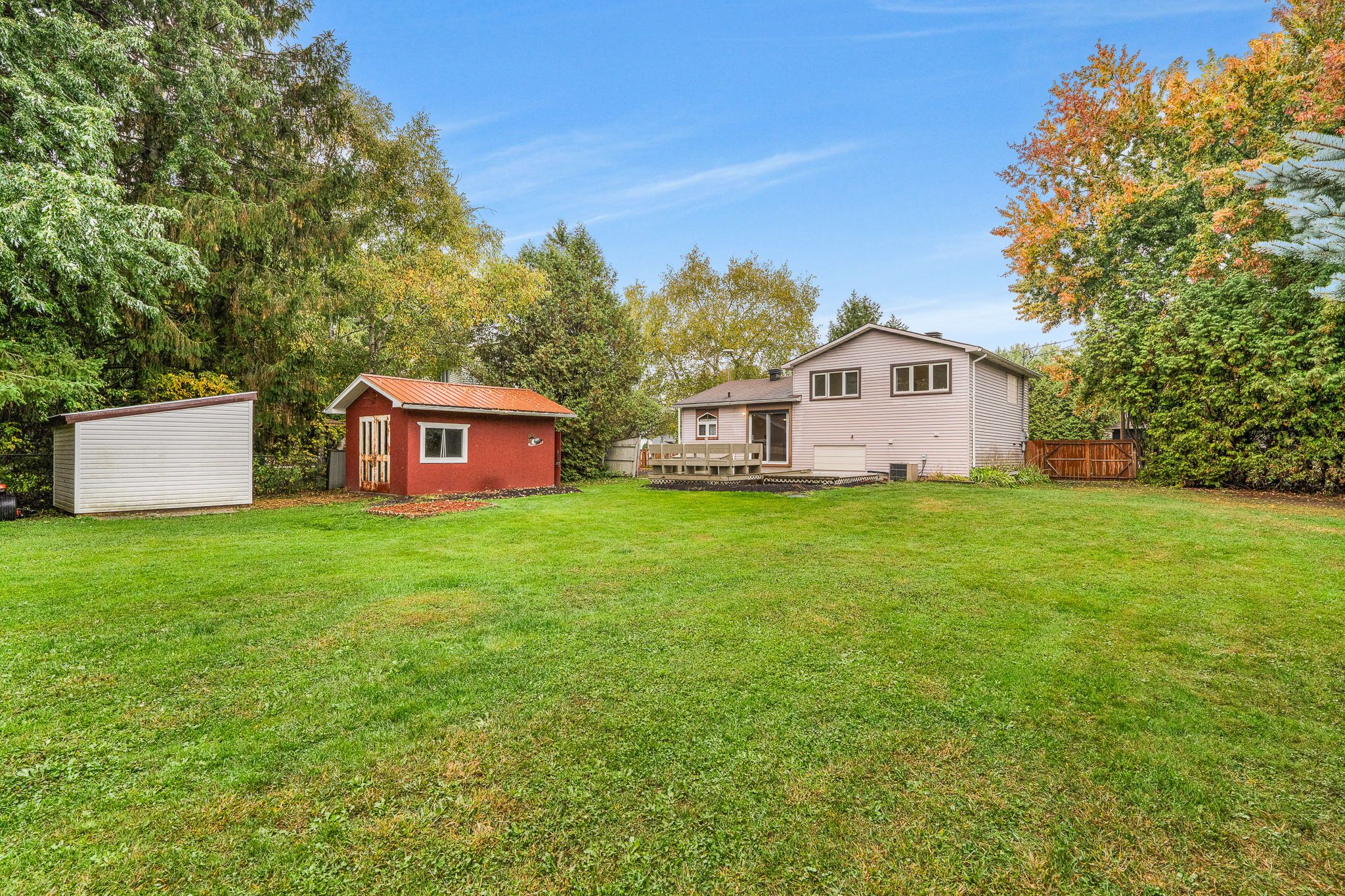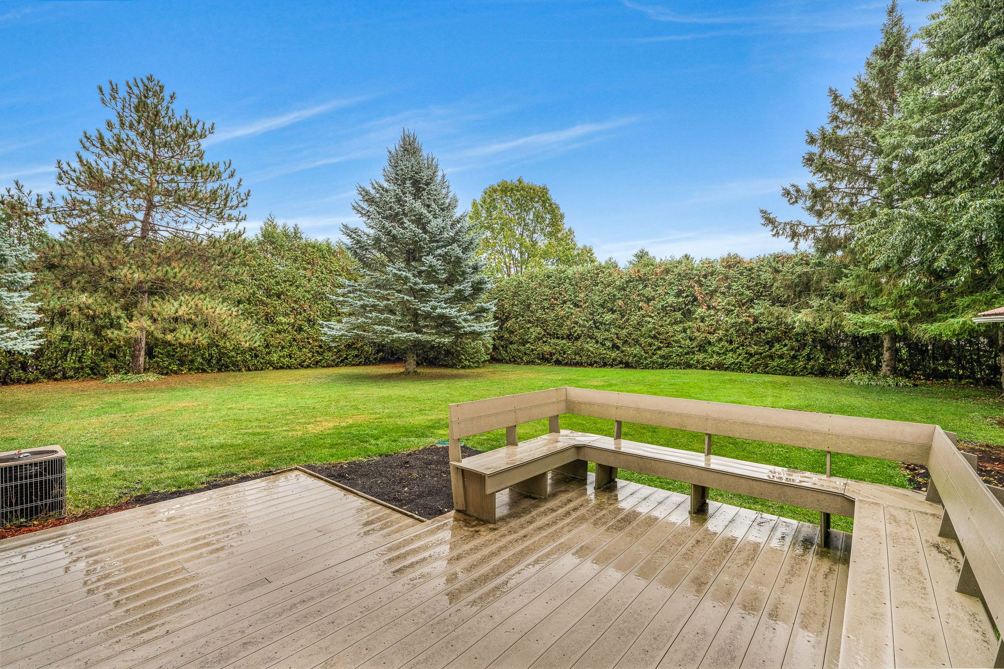 • Private backyard retreat with a large deck and mature trees.