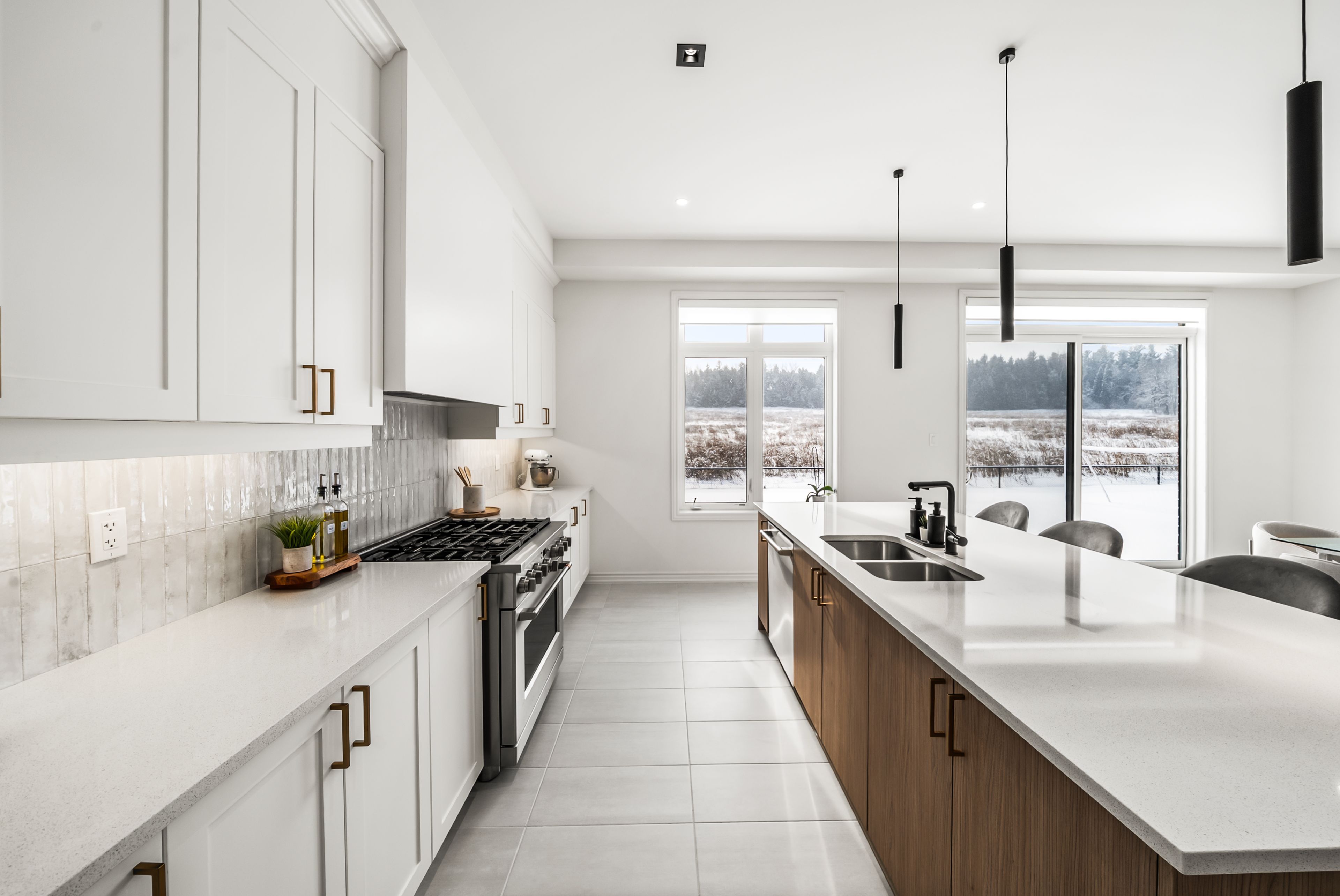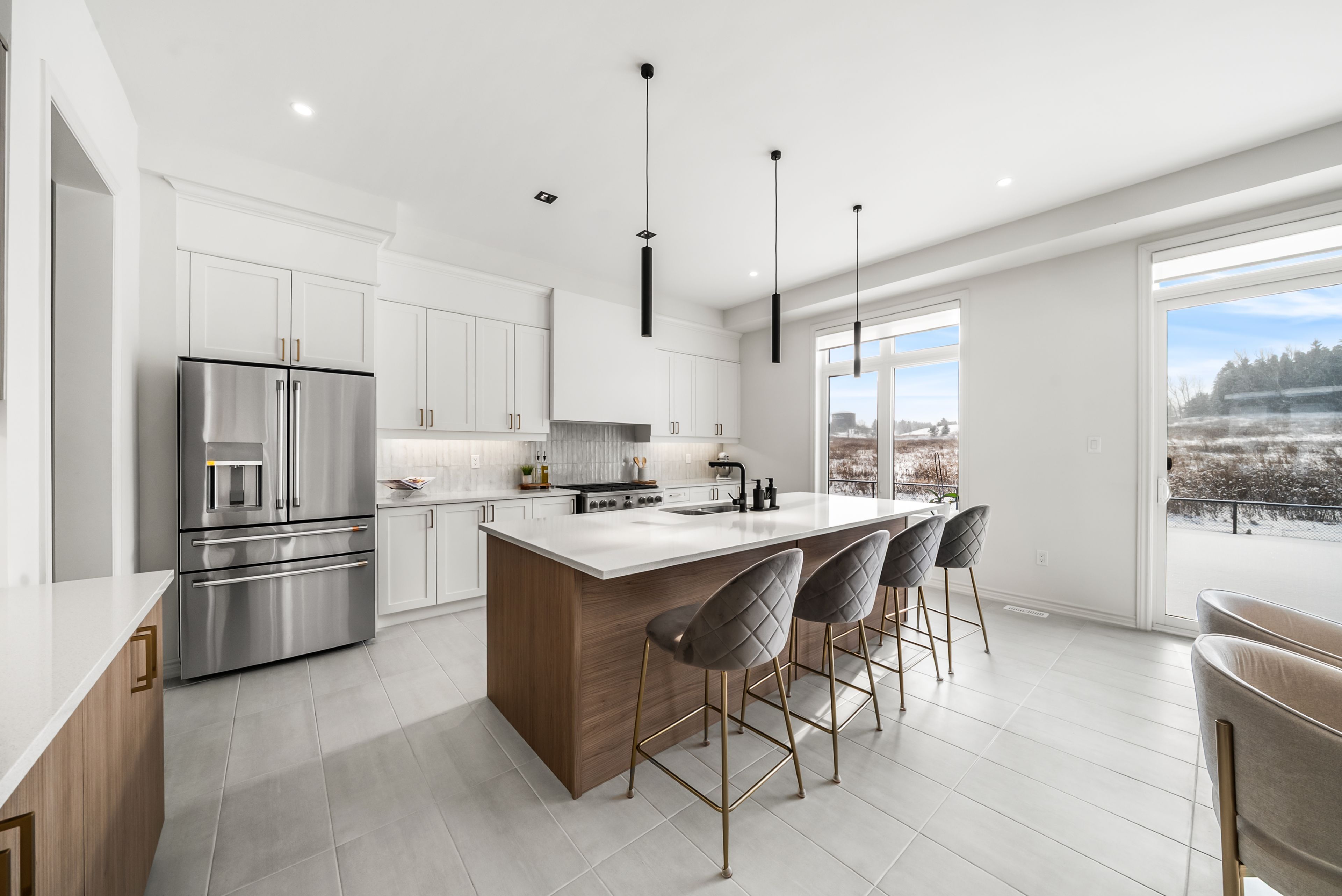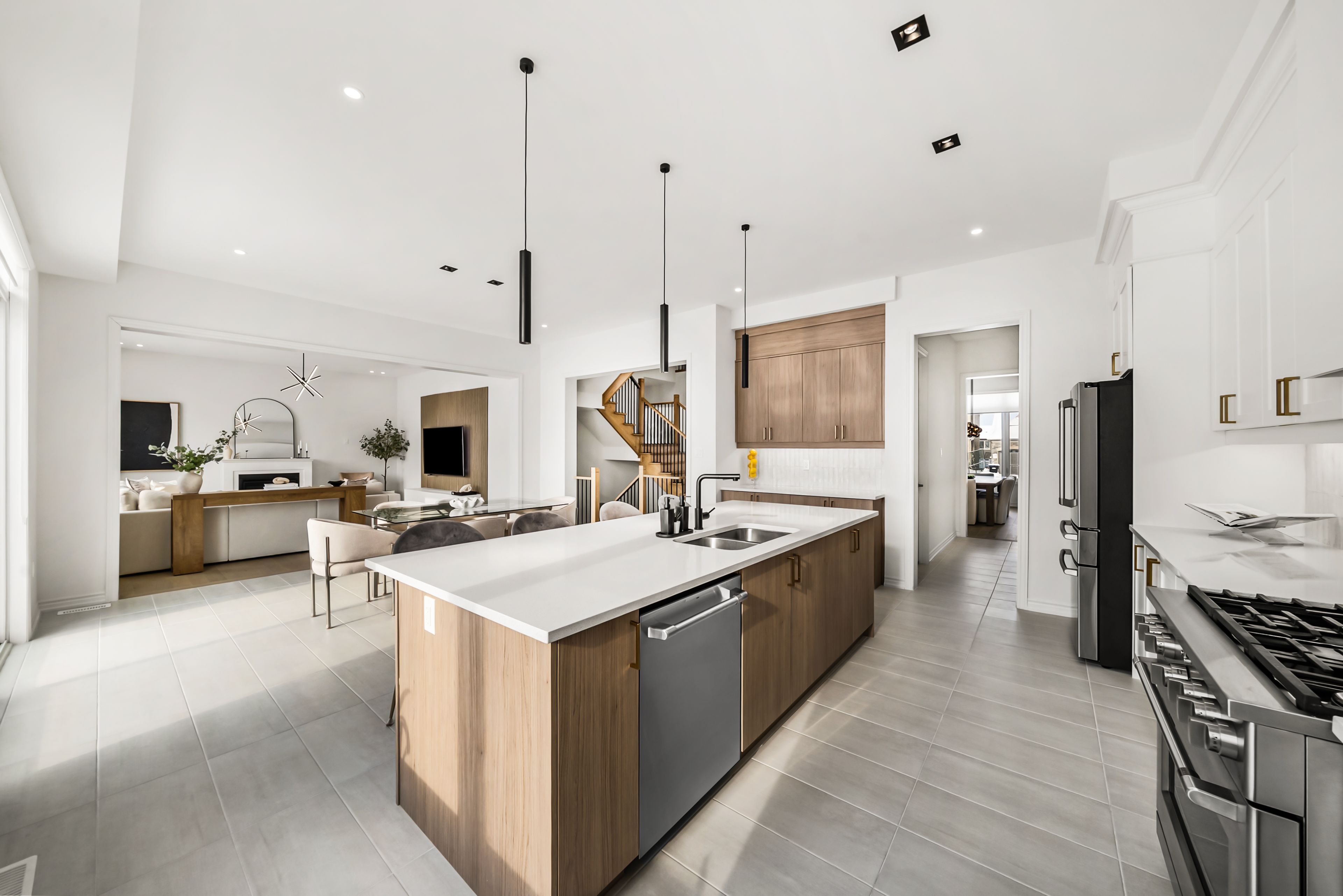• Modern kitchen features quartz countertops, large island, and stainless steel appliances.
