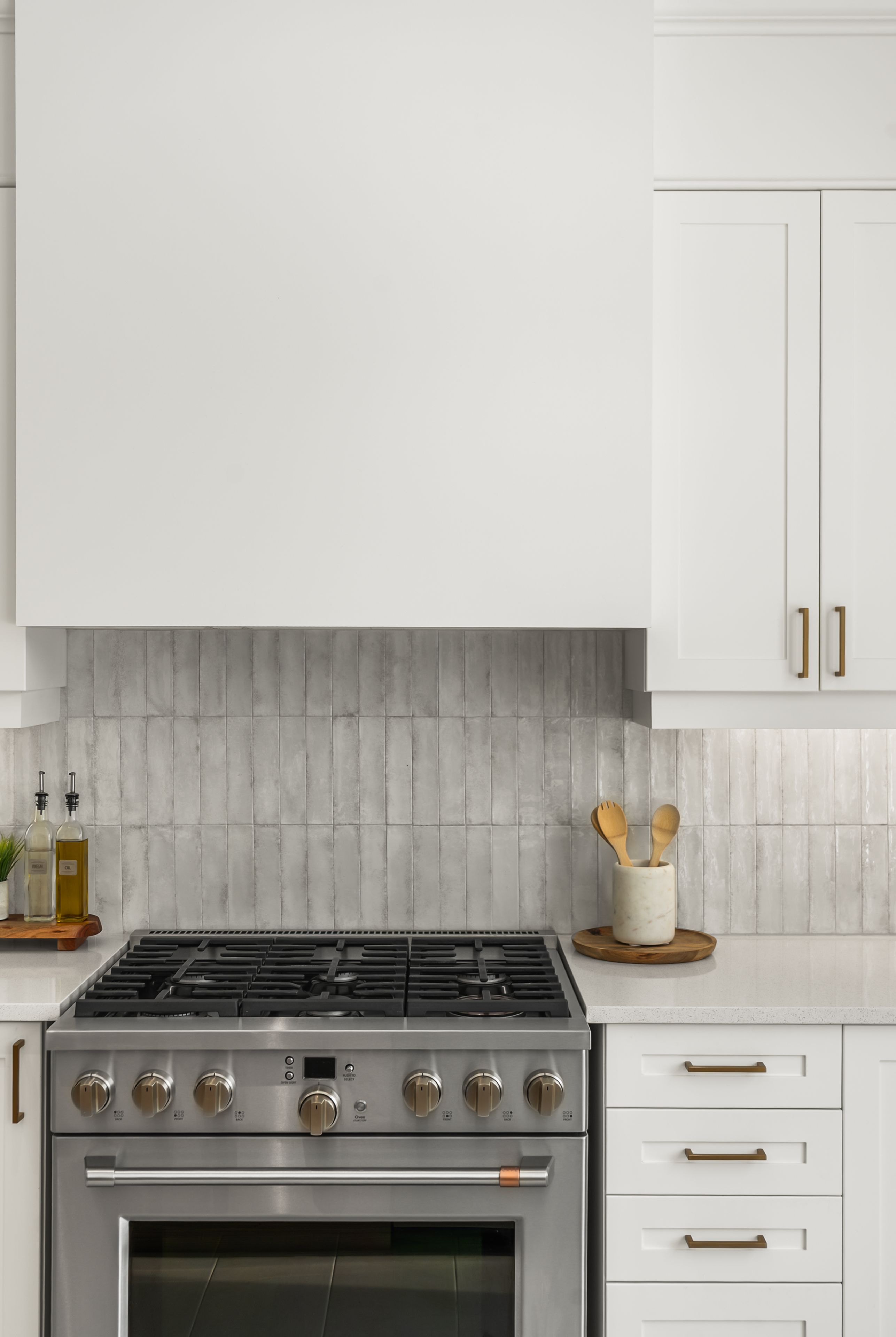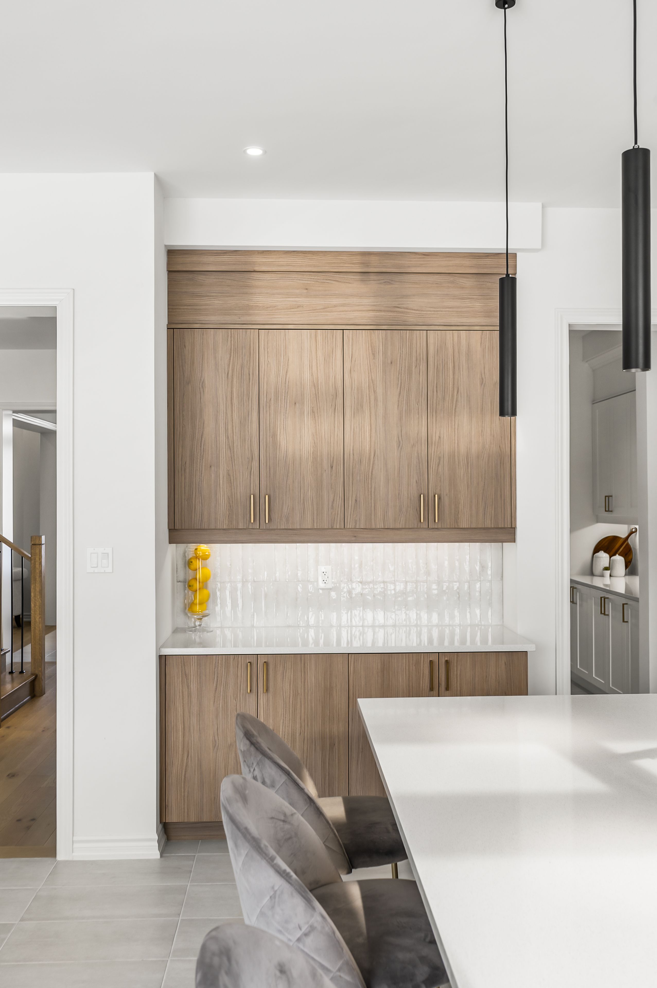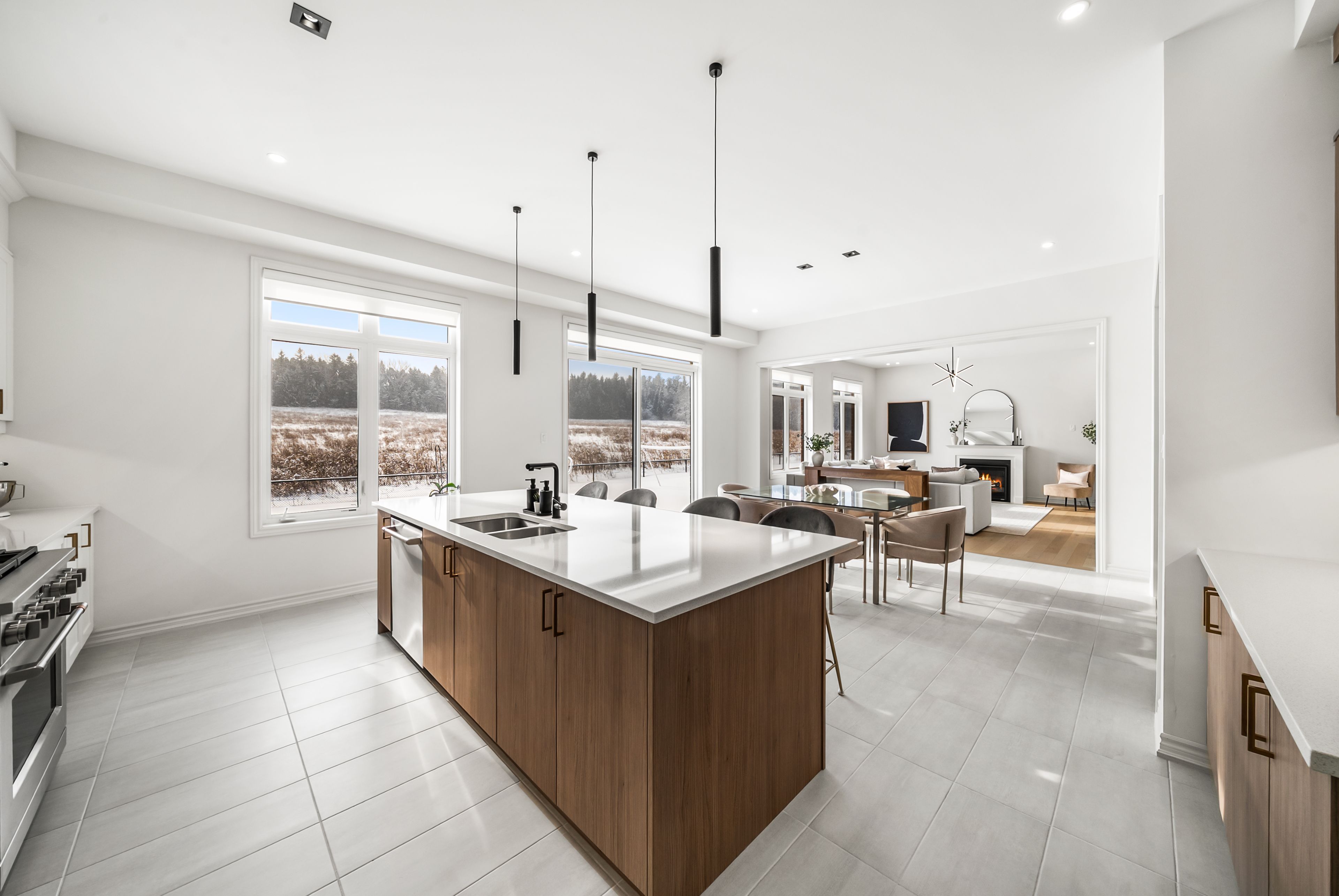 • Modern kitchen features quartz countertops, large island, and stainless steel appliances.