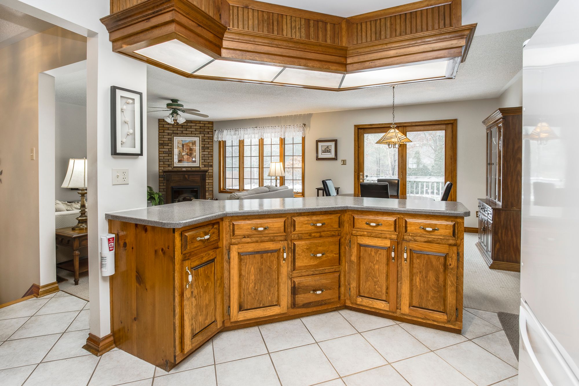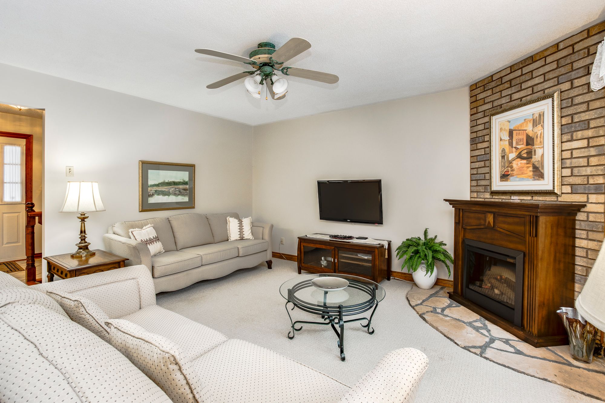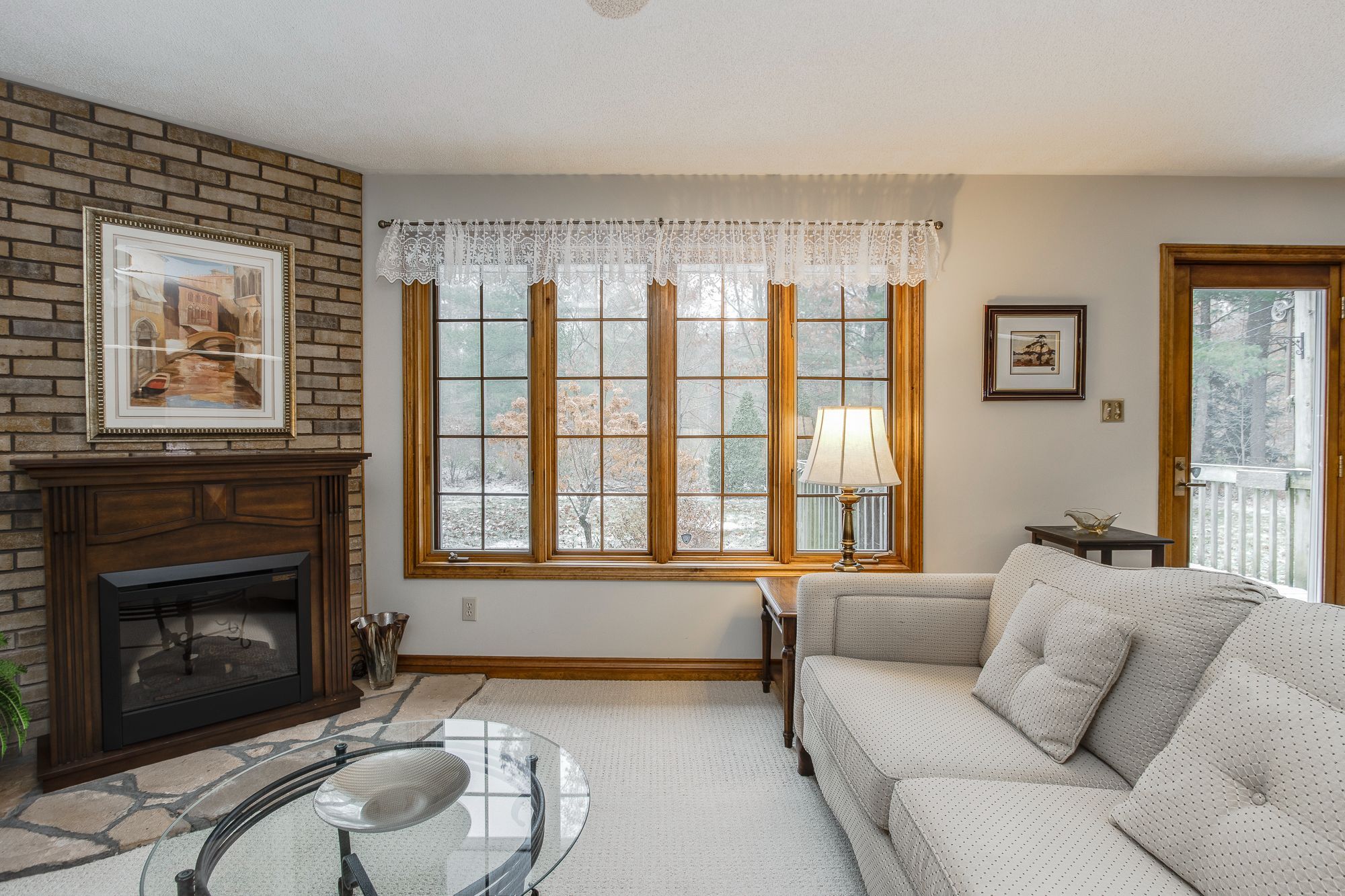 • Open concept living space with electric fireplace and deck access.