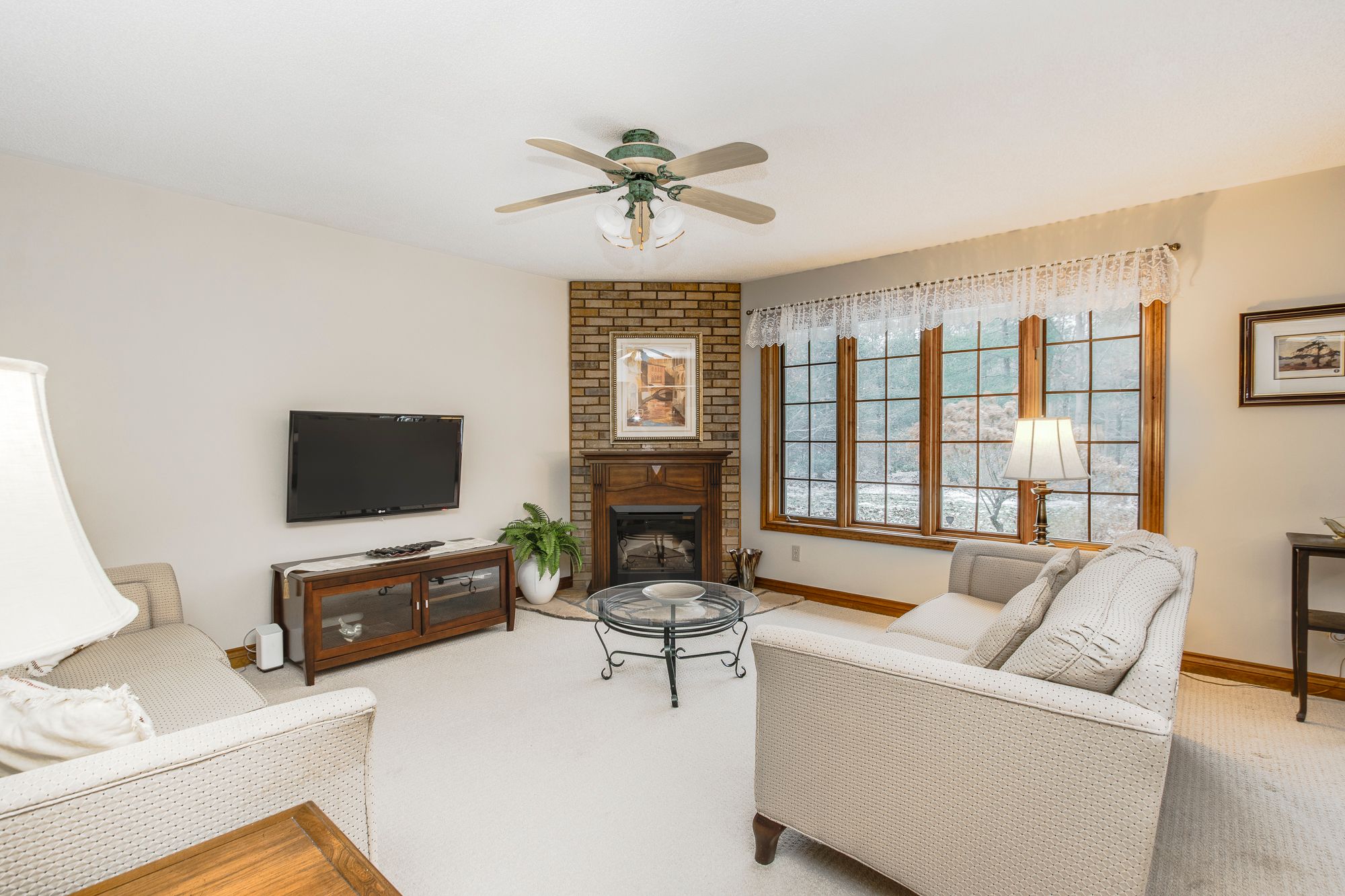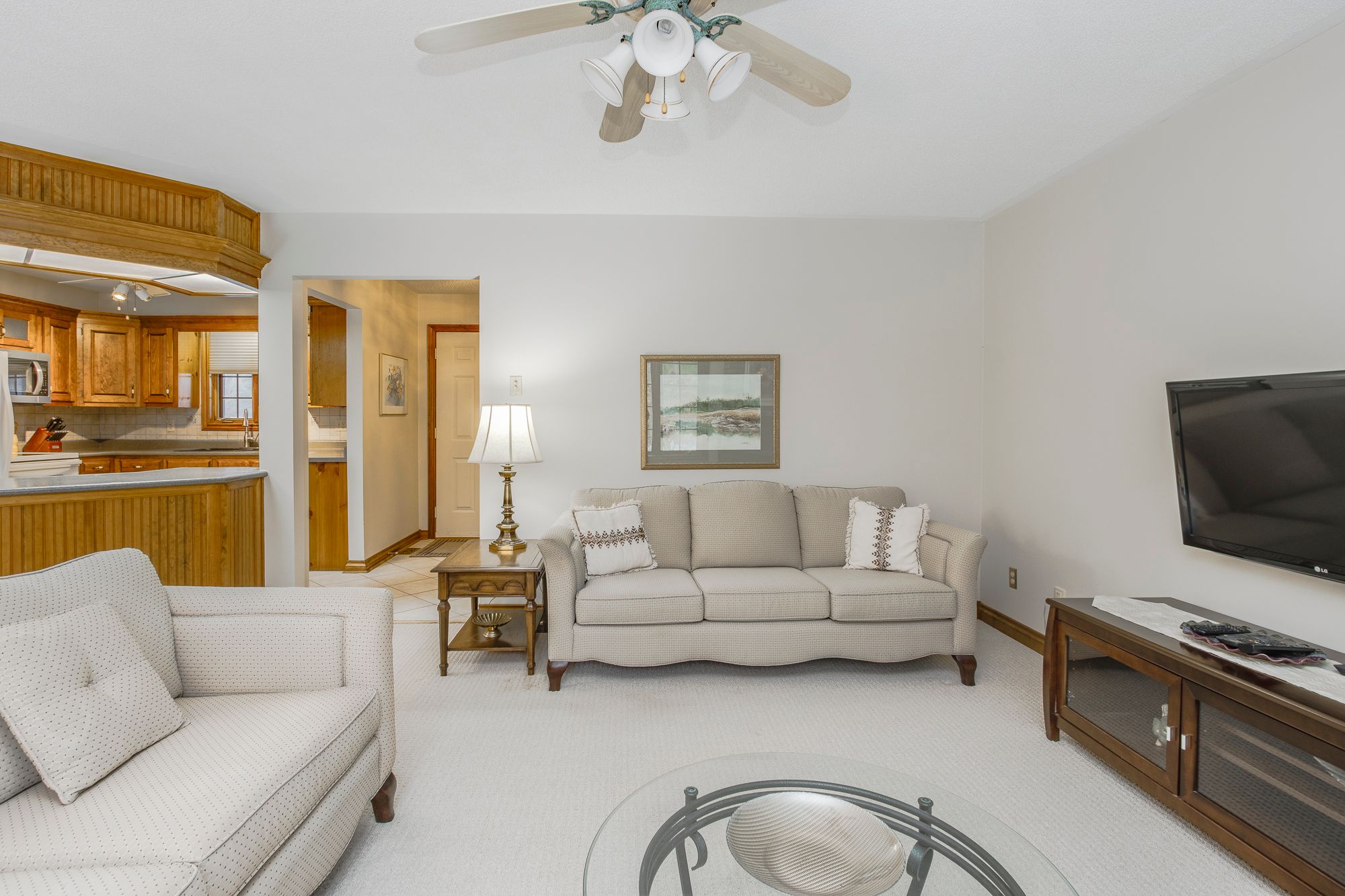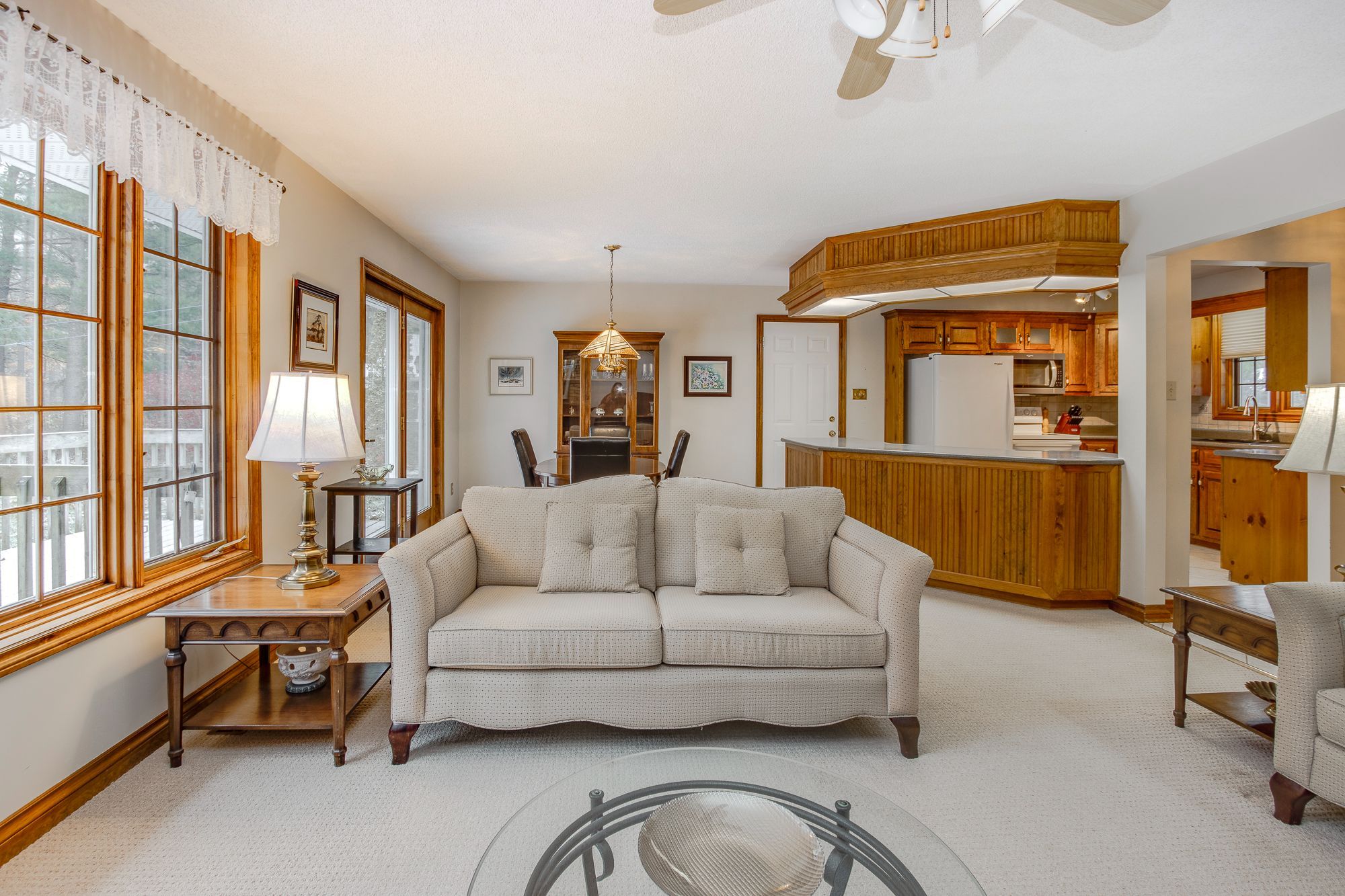 • Open concept living space with electric fireplace and deck access.