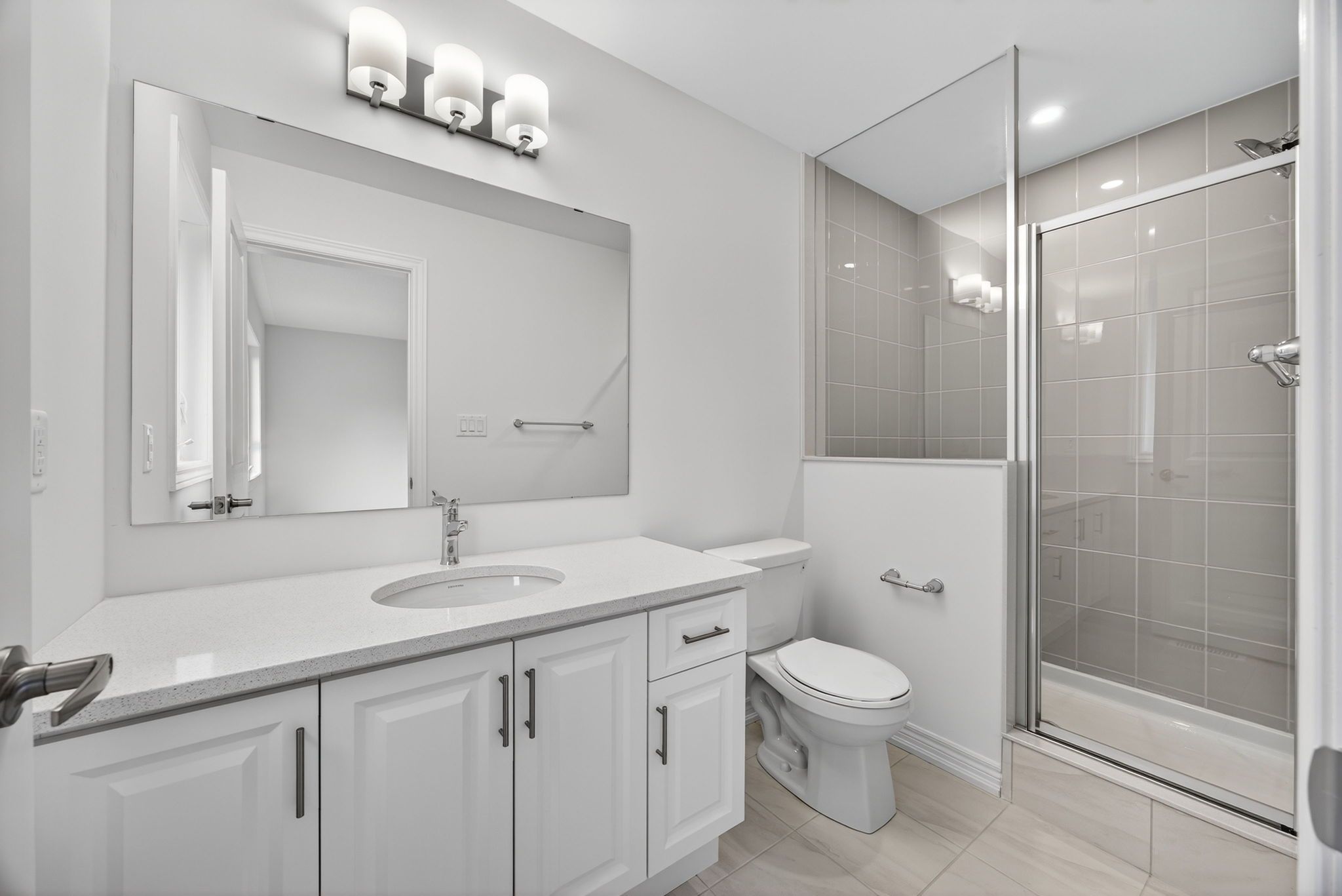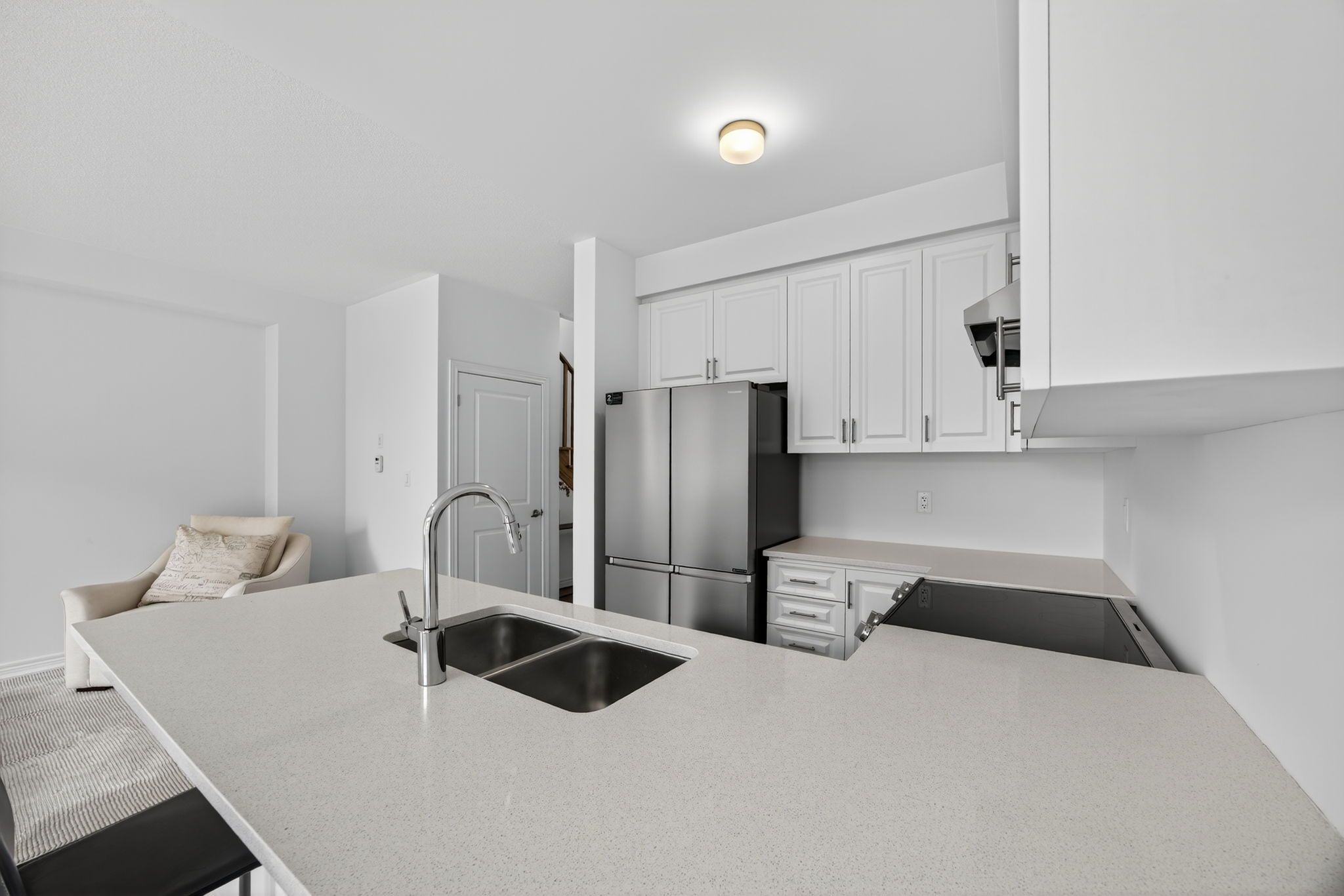 • Stylish kitchen with quartz countertops and stainless steel appliances.