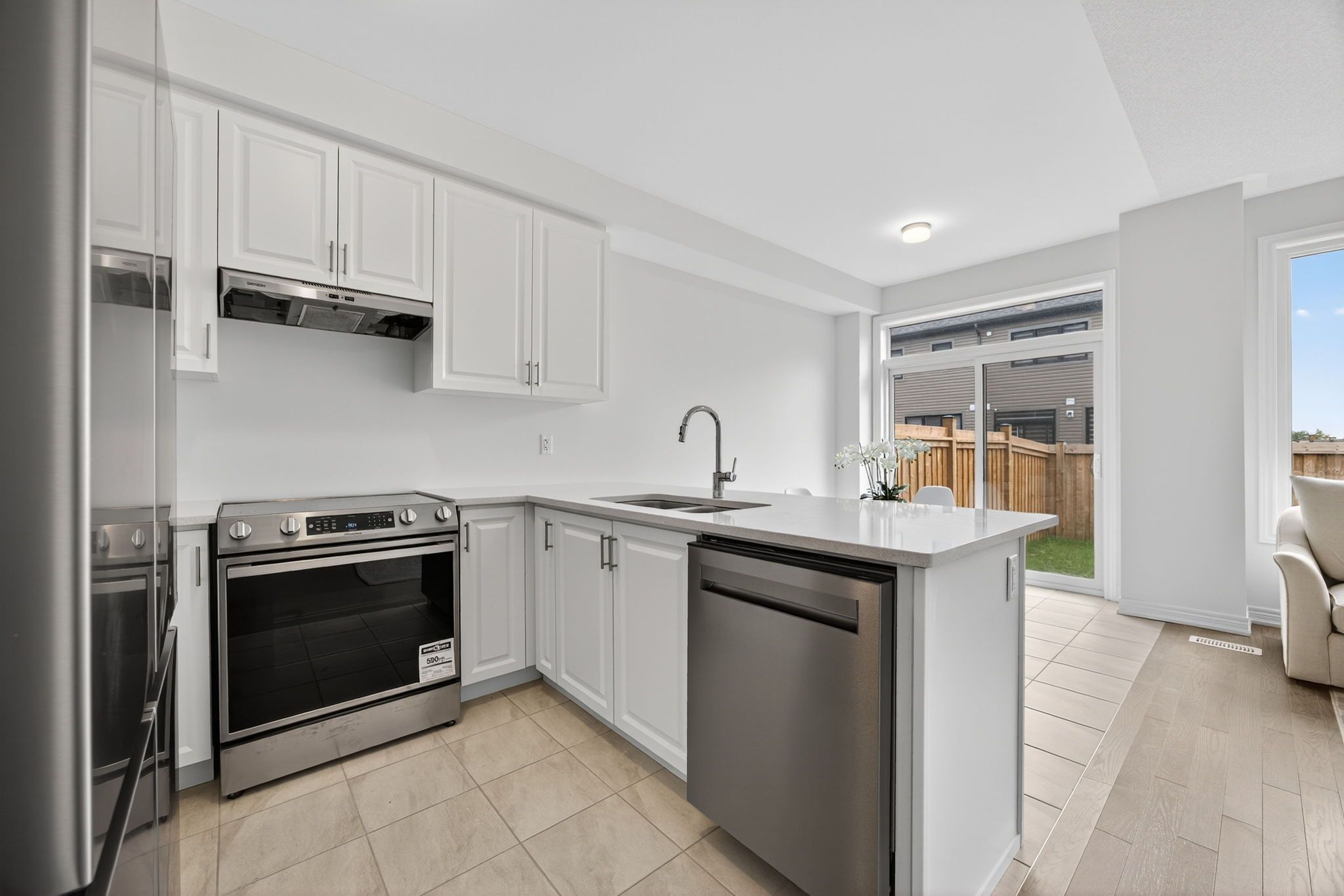 Welcome to this beautifully built end-unit townhome offering the perfect blend of style, space, and comfort! Situated on an oversized, fully fenced lot on a quiet street, this all-brick home with elegant stone detailing provides added privacy and a peaceful setting, along with a private driveway for your exclusive use. Step inside to a bright, open-concept layout designed for modern living, seamlessly connecting the living, dining, and kitchen areas-perfect for entertaining or everyday living. The stylish kitchen is the heart of the home, featuring quartz countertops, timeless white cabinetry, and stainless steel appliances for a clean, contemporary feel. Warm hardwood flooring flows throughout the main level, while the stained staircase adds a touch of sophistication. Upstairs, you'll find 3 spacious bedrooms, 2 bathrooms, and the convenience of second-floor laundry-no more hauling baskets up and down stairs! Located just minutes from the go train, hwy 400, shopping, and dining, this home offers both comfort and convenience in a family-friendly neighbourhood. A fantastic opportunity for a wide range of buyers-don't miss it!