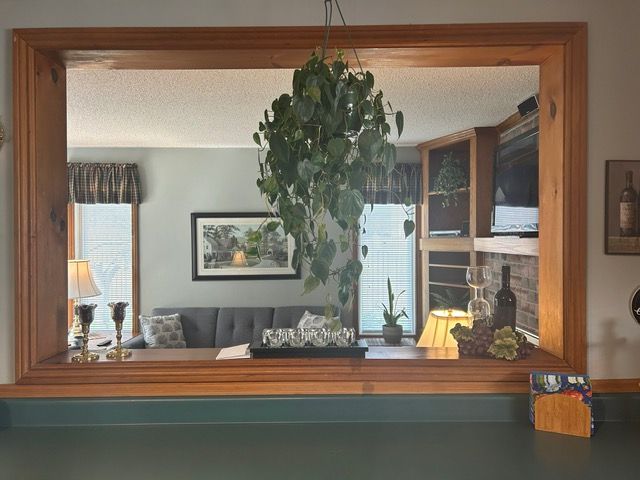 • Charming kitchen with pine glass cabinets overlooking family room.