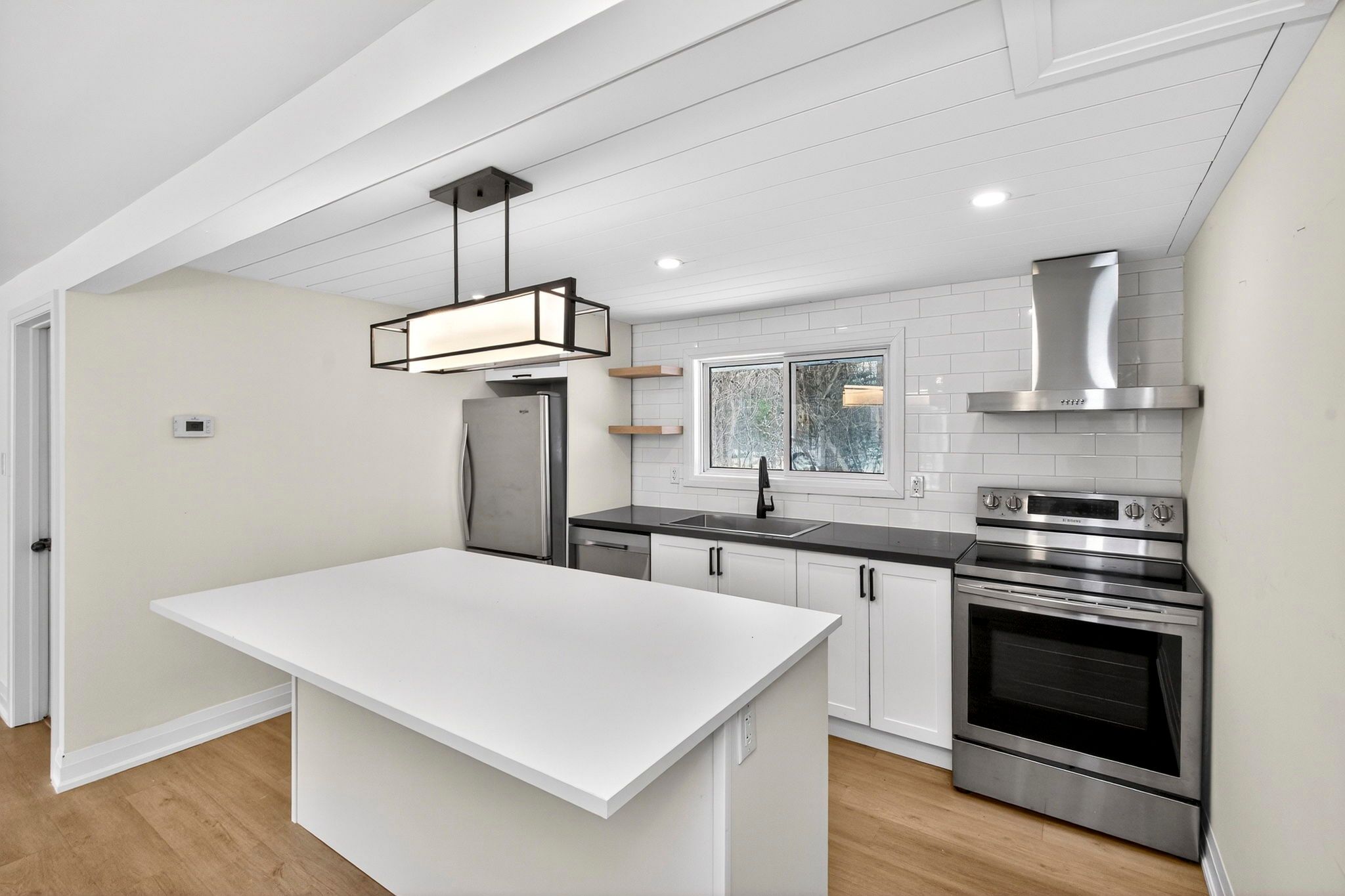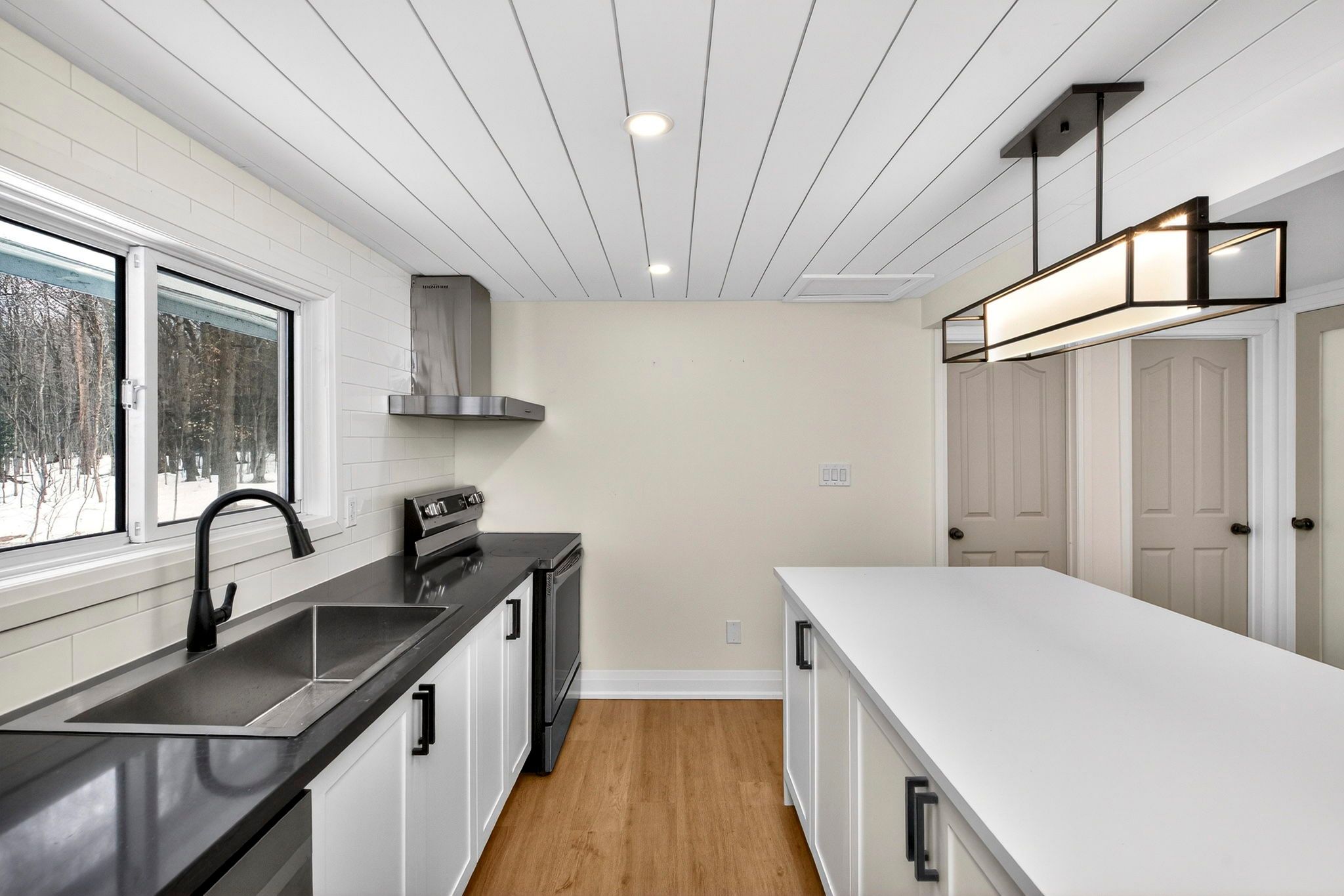 • Inviting kitchen with a large island and view of the backyard.