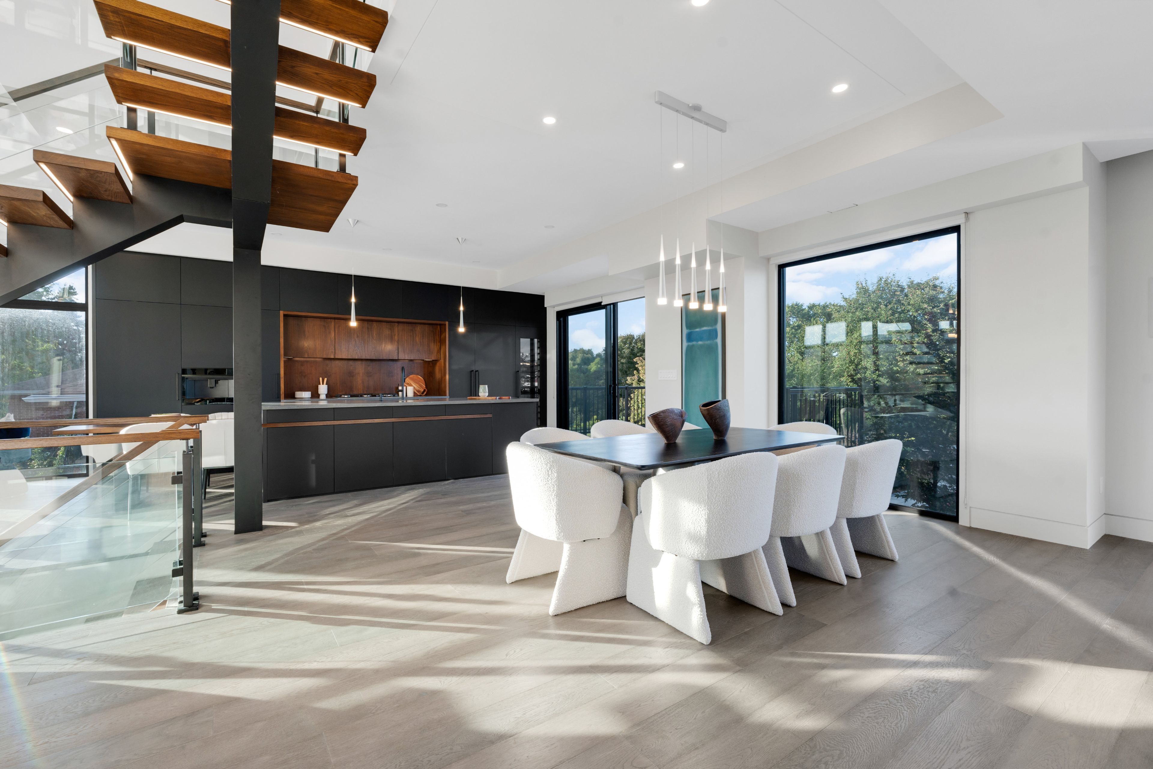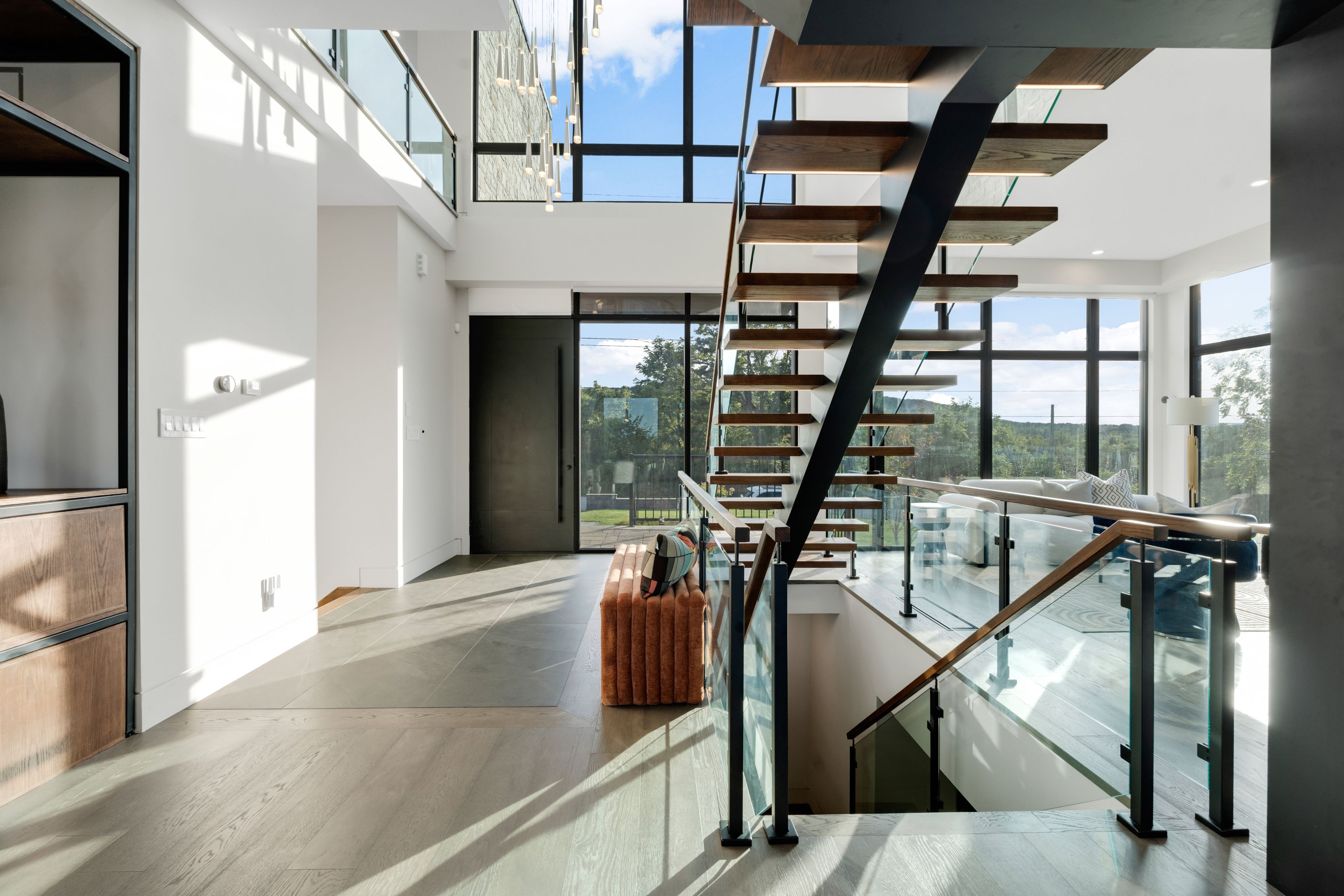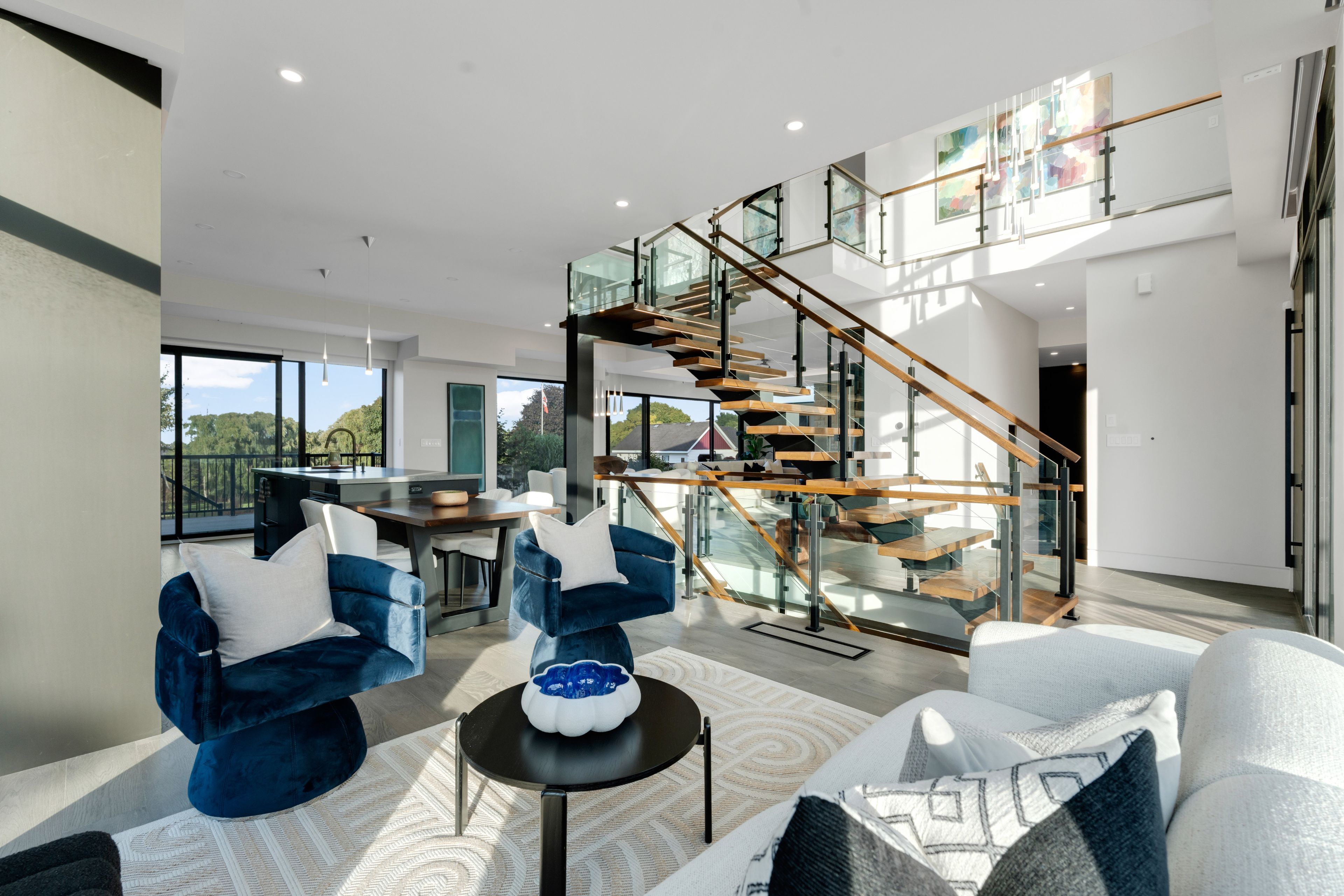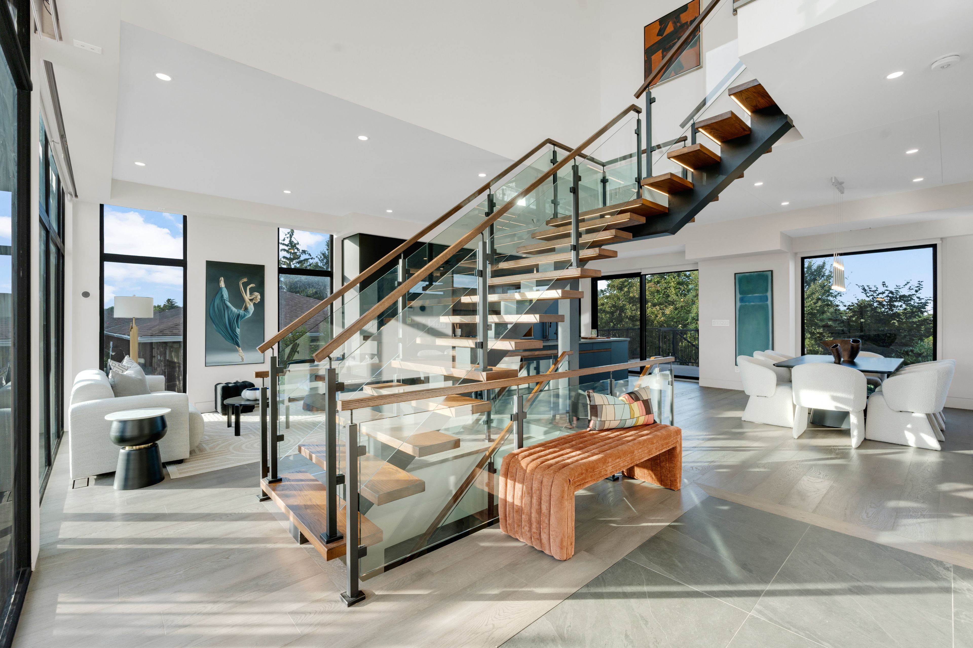 • Dramatic ceilings and floating staircase enhance the modern interior design.