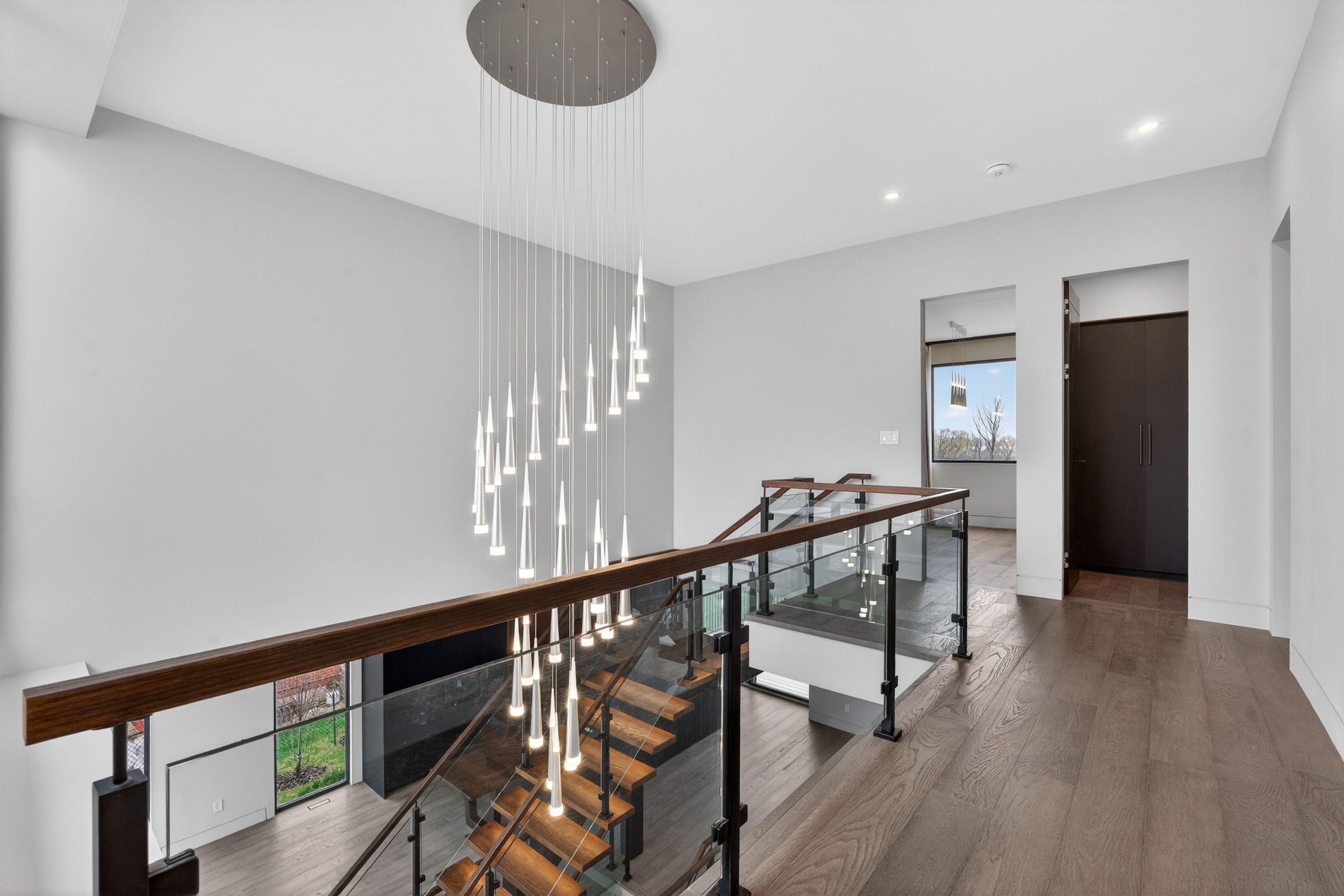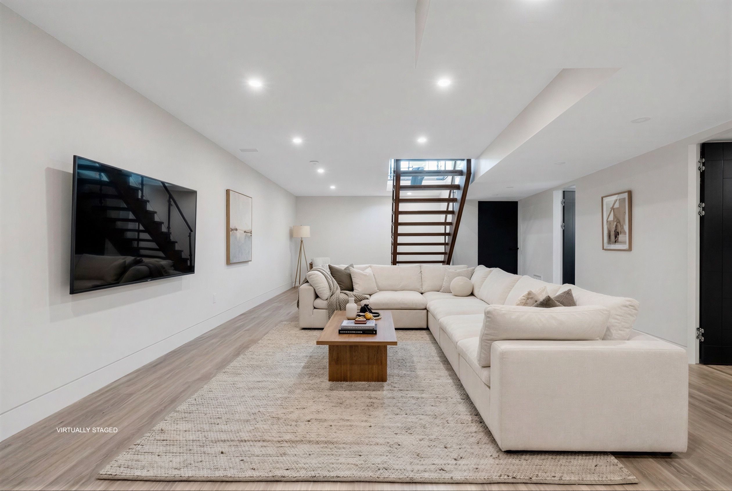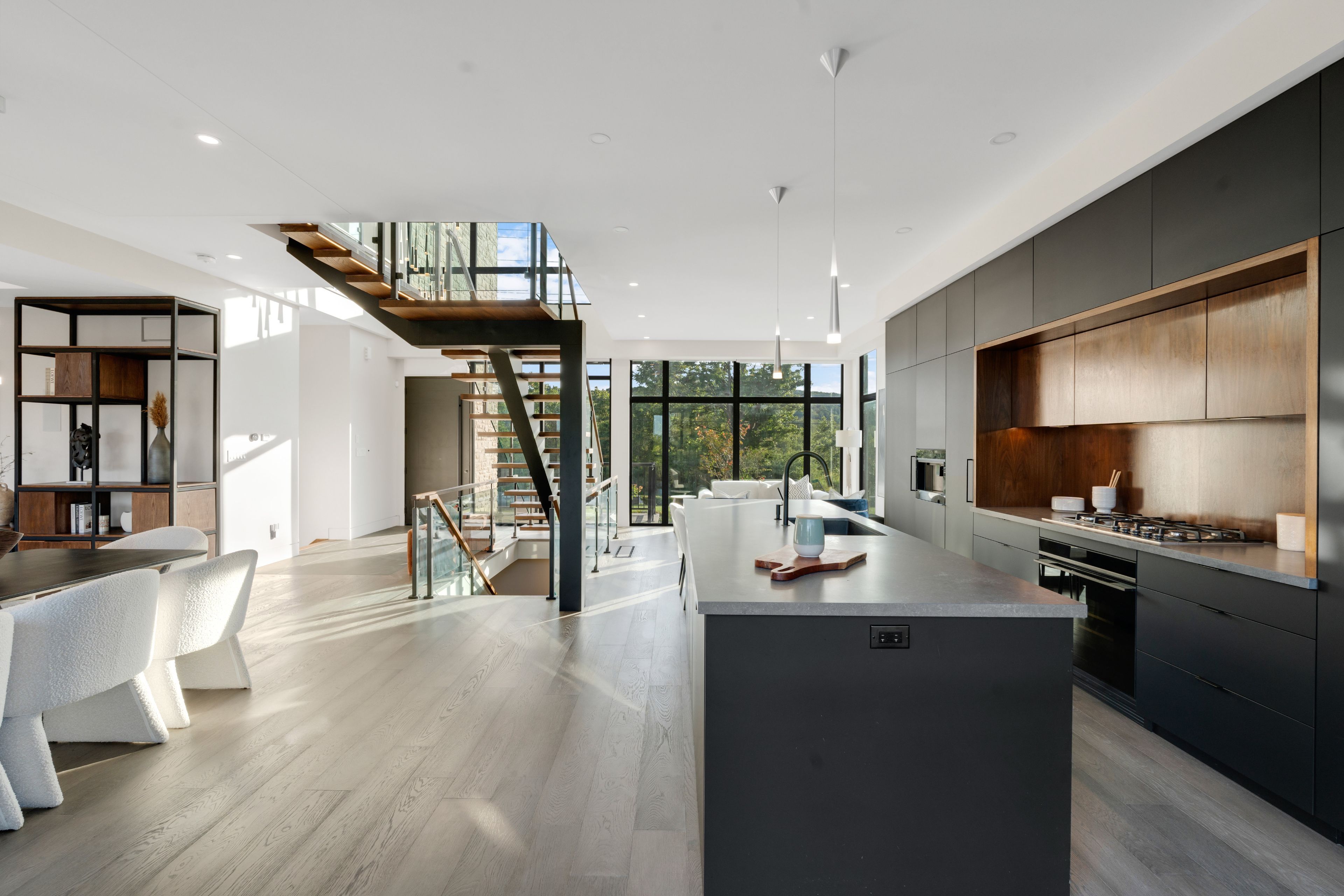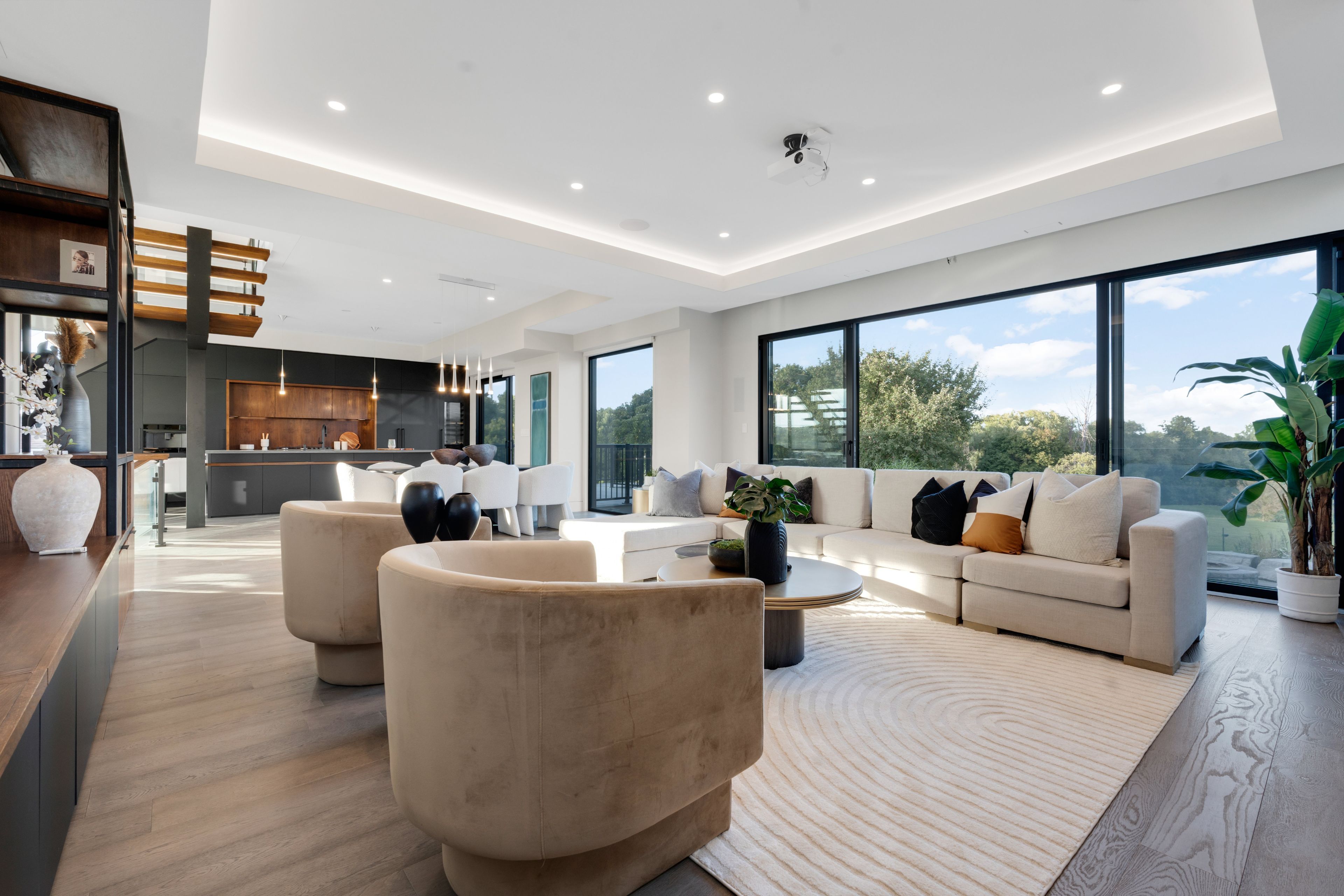 • Dramatic ceilings and floating staircase enhance the modern interior design.