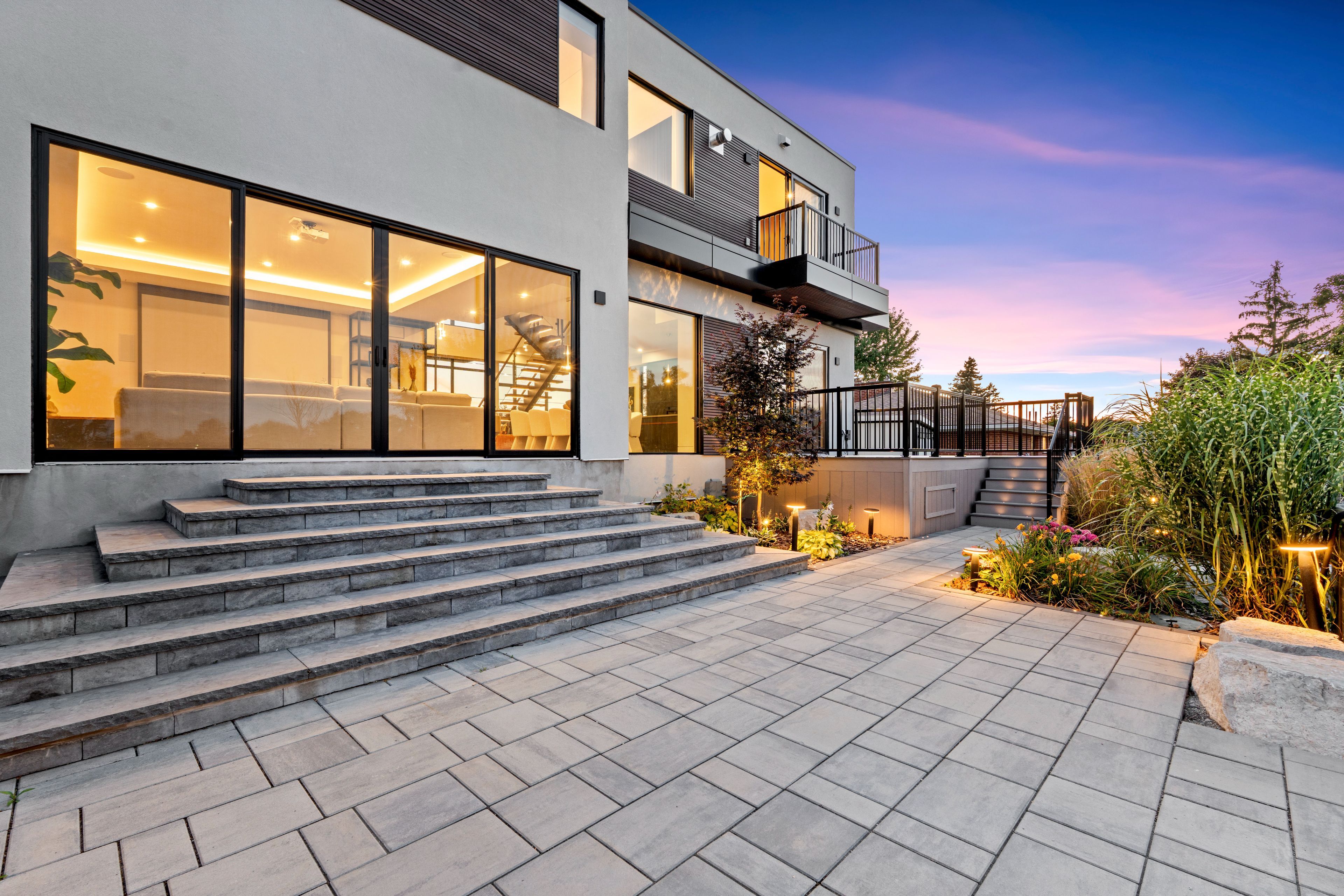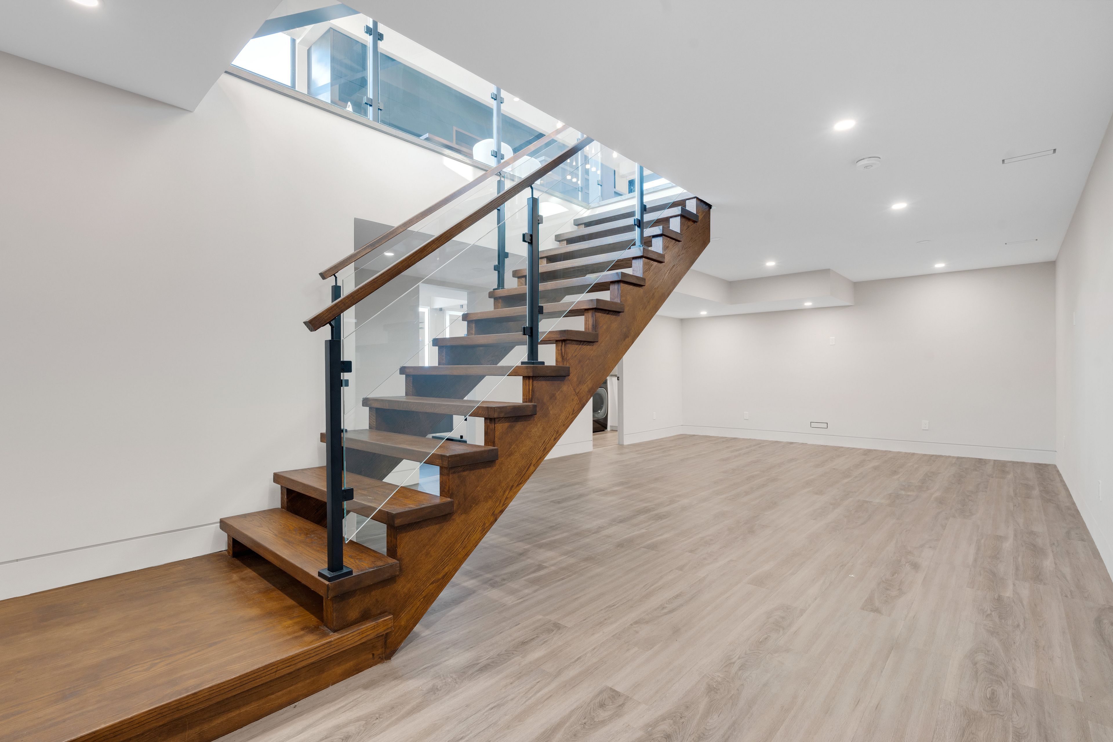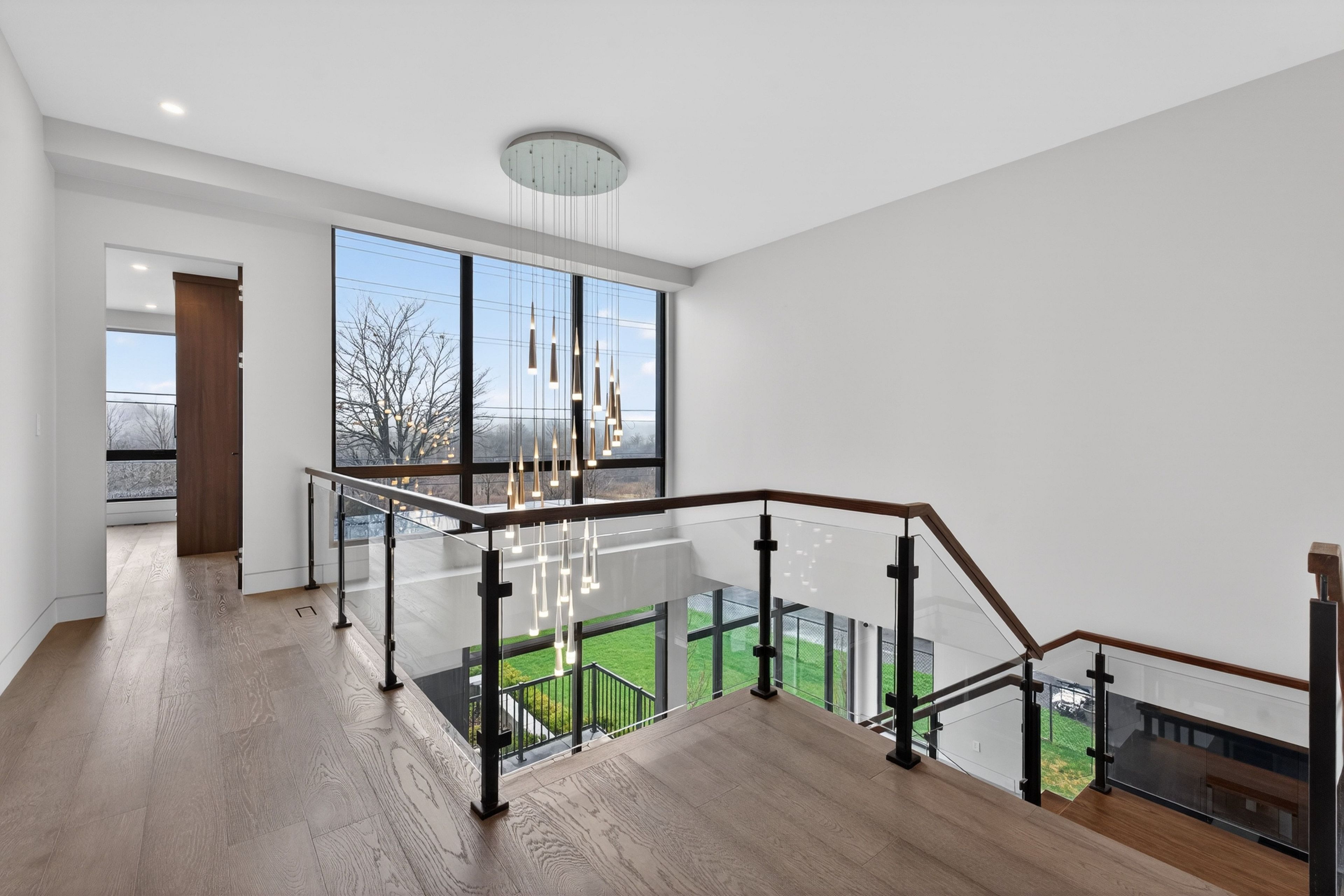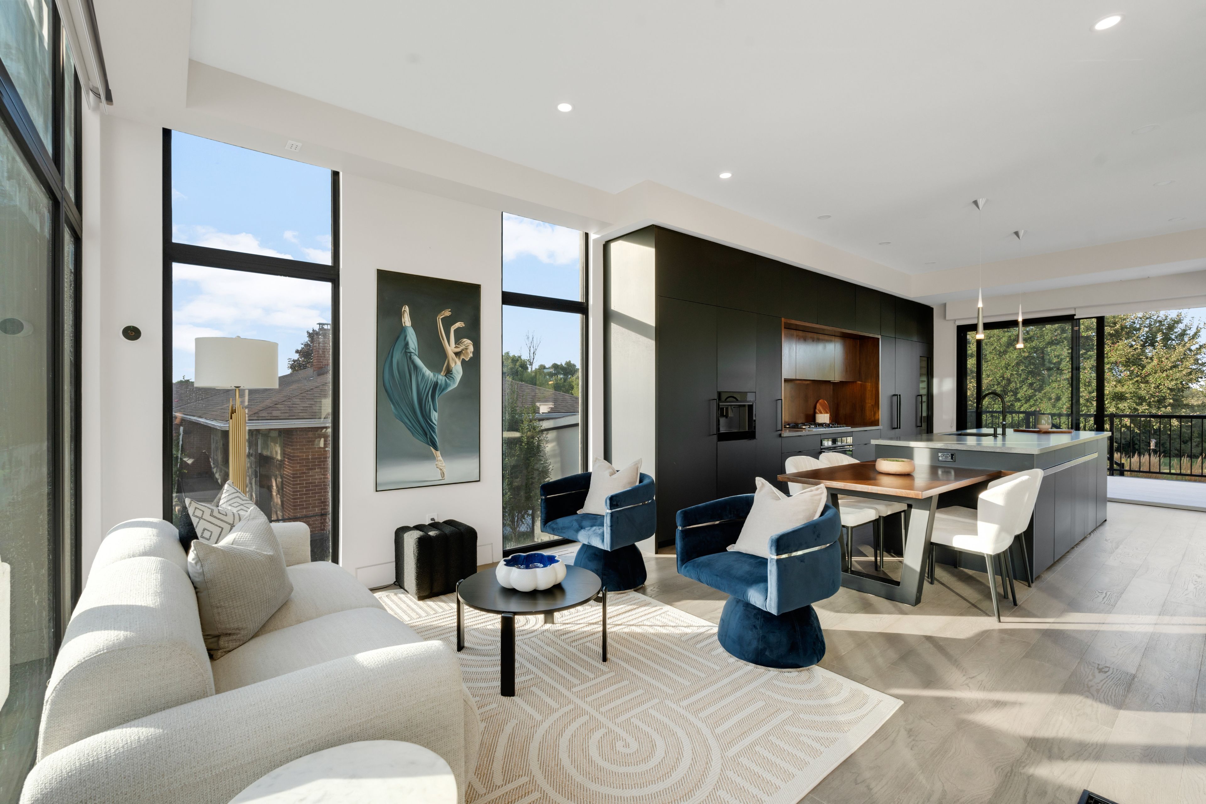 • Dramatic ceilings and floating staircase enhance the modern interior design.