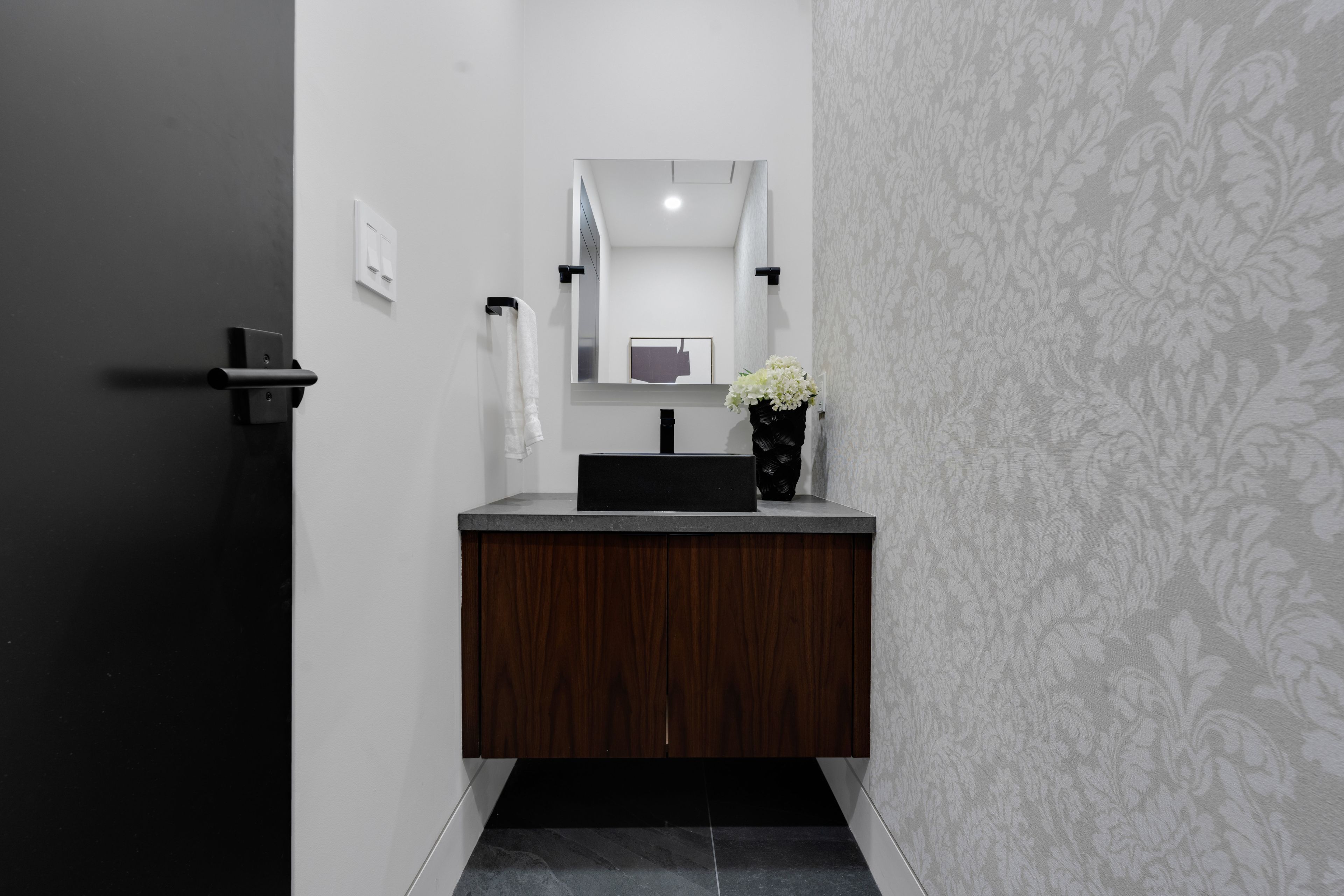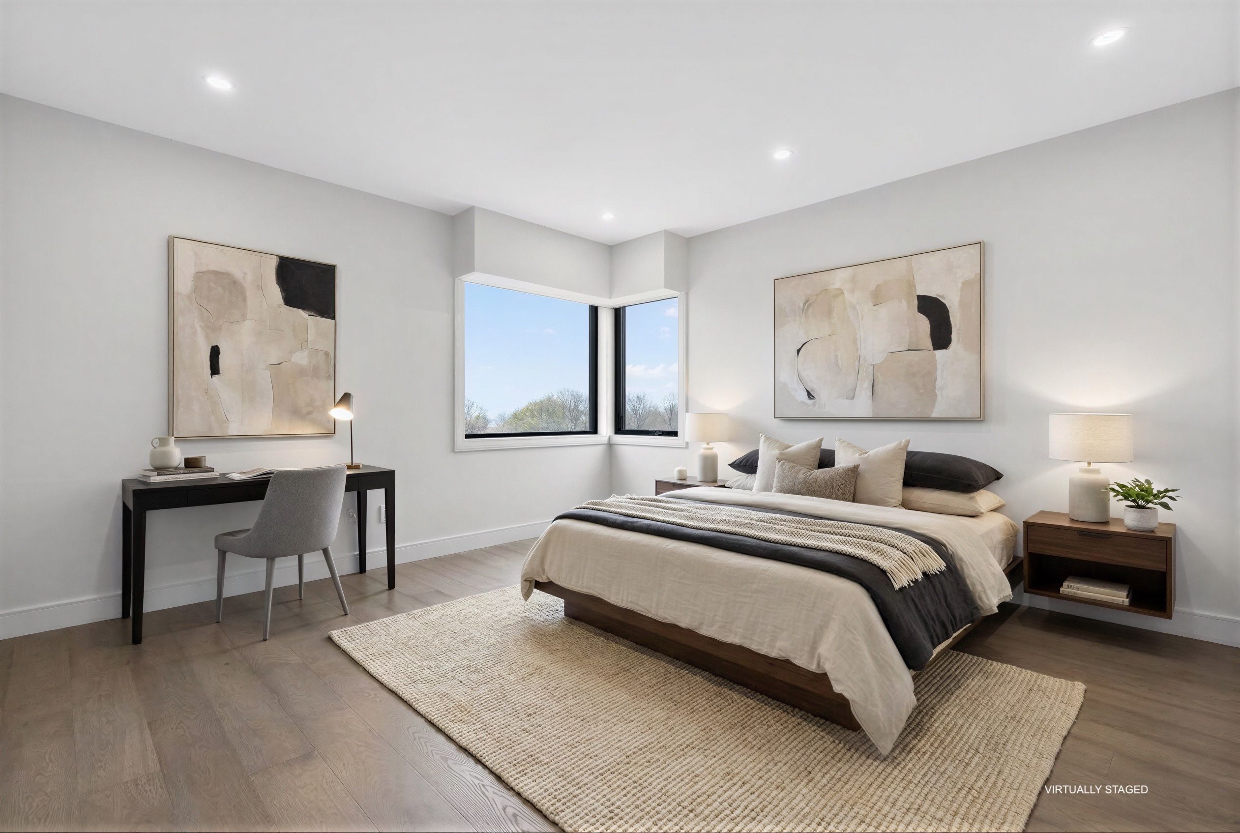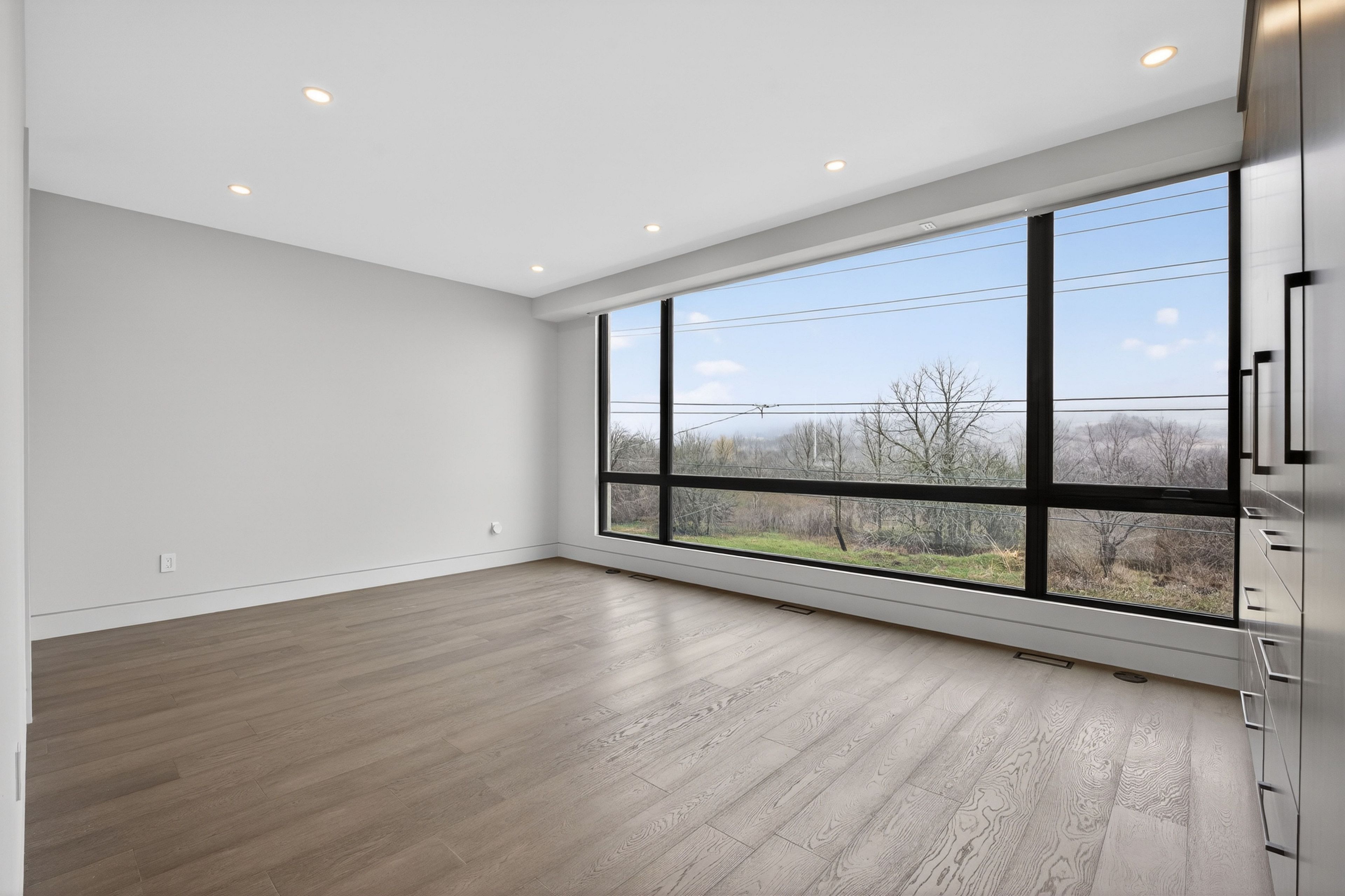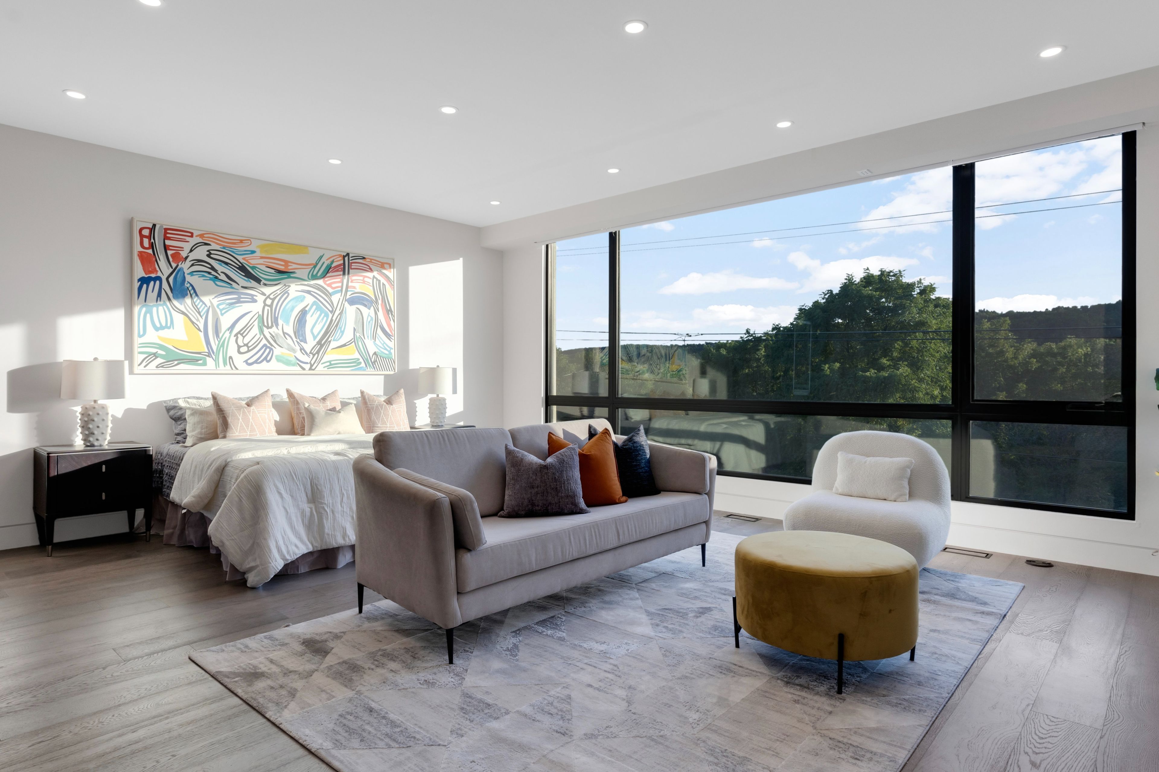 • Dramatic ceilings and floating staircase enhance the modern interior design.