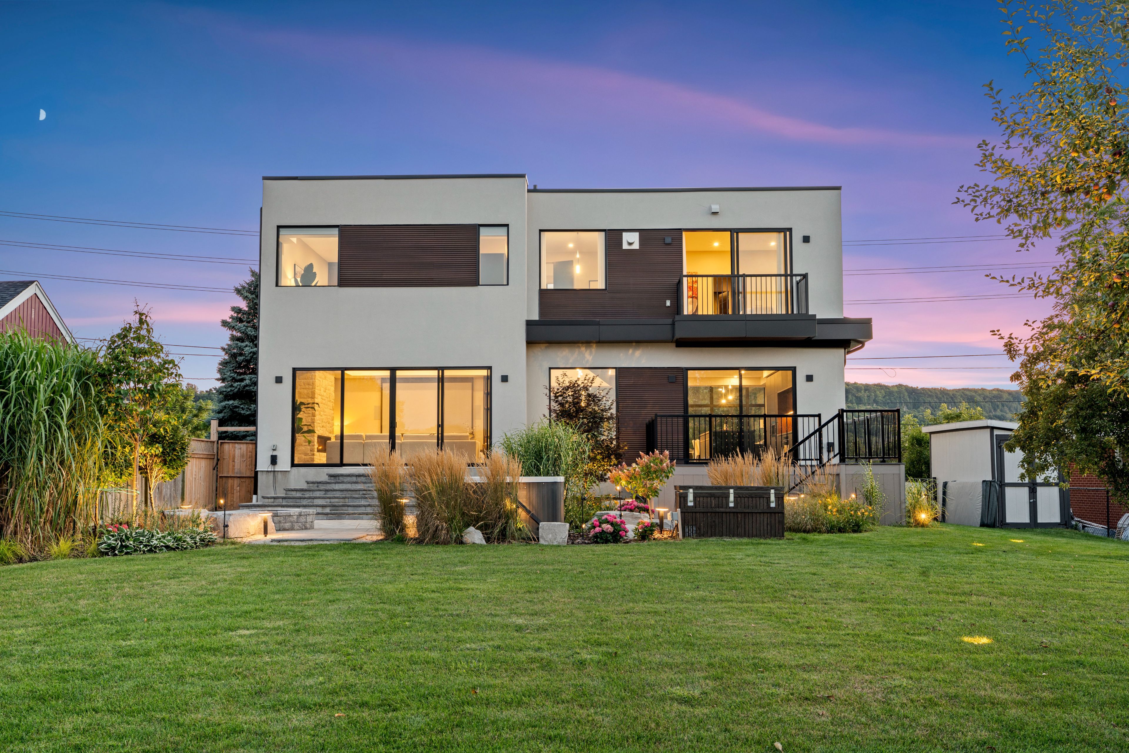 Directly across from the cliff-face of the niagara escarpment, in one of milton's most serene and private settings, sits a newly built contemporary masterpiece designed by award-winning sensus design studio. Resting on a remarkable 60 x 520+ lot backing onto 16 mile creek, this home offers a rare blend of modern architecture and countryside tranquility. With no neighbours in front or behind, walls of windows immerse you in nature, while the expansive backyard invites year-round enjoyment whether relaxing in the hot tub, recovering in the cold plunge, gathering around the fire pit, fishing, tobogganing, or even practicing your short game of golf! Inside, 21 ceilings and a floating staircase set a dramatic tone. A formal living room frames escarpment sunsets, while the sleek custom kitchen features high-end fisher & paykel appliances. The family room, anchored by a soaring stone fireplace, doubles as a home theatre with built-in projector and surround sound. The primary suite rivals a five-star retreat: a sitting area that doubles as the perfect home office overlooking the backyard, a triple-sided fireplace, king-size sleeping area with custom headboard, walk-through closet, and spa-like ensuite. Three additional bedrooms each feature ample built-in closets and lavish ensuite bathrooms. Smart home features include lighting automation, landscape and irrigation systems, ev charger, and more. A perfect fusion of luxury design and natural beauty, this home is truly one-of-a-kind and must be experienced in person.