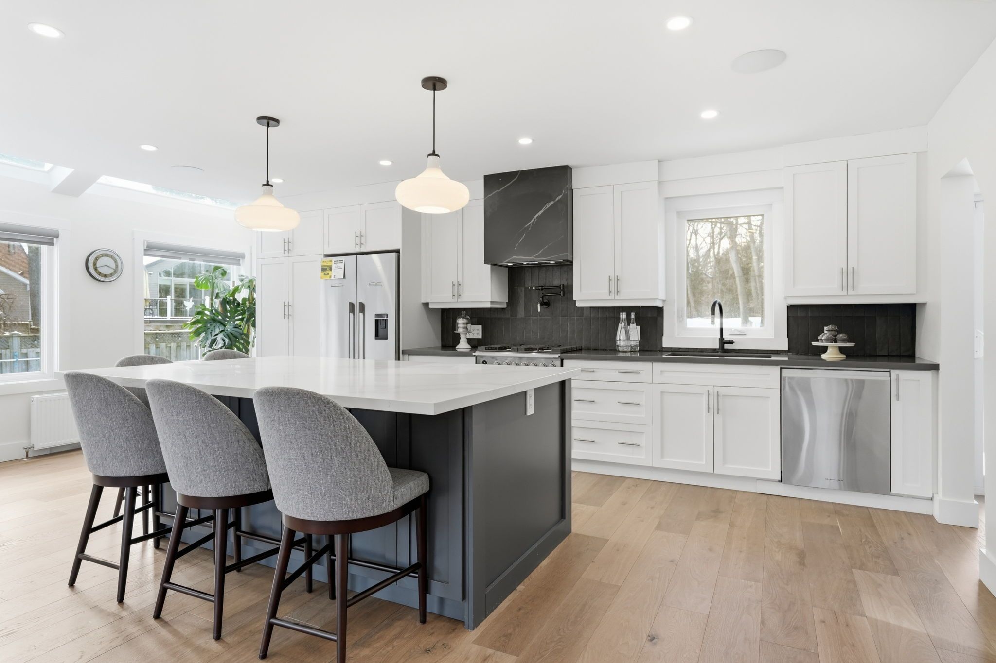 Step inside a residence where modern design and craftsman inspired detailing come together in perfect balance. Thoughtfully finished and designed for both elevated entertaining and everyday comfort, this home blends architectural character with contemporary refinement. At its heart, the chef inspired kitchen features quartz countertops, a contrasting waterfall island with seating, skylights that flood the space with natural light, premium appliances, and seamless flow into the surrounding living areas. It is a space designed not only for cooking, but for gathering. The family room showcases a custom board and batten accent wall, integrated klipsch sound system, and expansive sliding doors that create effortless indoor outdoor connection. The adjoining living room is anchored by a detailed wood burning fireplace, adding warmth and depth. Upstairs, solid wood doors and tailored finishes continue throughout. The primary suite offers a calm retreat with decorative wall mouldings, sconces, generous windows, a spacious walk in closet, and a spa inspired ensuite featuring a standalone soaking tub, rain shower, and quartz vanity. Additional bedrooms are bright and well proportioned, complemented by a beautifully finished main bath and organized laundry room with quartz counters and custom cabinetry. The fully finished lower level extends the living space with luxury vinyl flooring, a brick fireplace, recessed lighting, and flexible recreation space. Outdoors, the fully fenced backyard features a generous entertaining patio and an impressive 18 by 36 pool with true resort scale presence. Major 2024 mechanical upgrades include enhanced plumbing and electrical, a viessmann boiler, upgraded ventilation, and hardwired ethernet throughout.