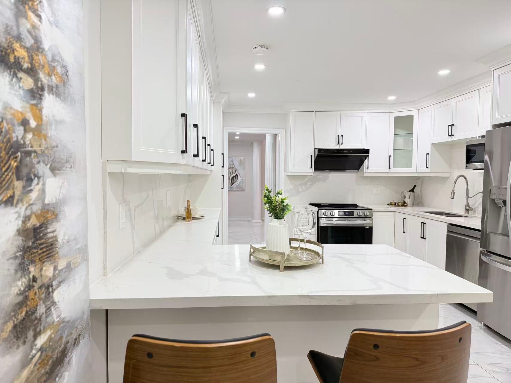 Stunning detached home on a premium 63' lot in a highly desirable neighborhood! Recently upgraded with new professional interior painting (2026), interlocking stone driveway (2026), freshly painted deck (2026), furnace (2025), and central air conditioning (2024). Renovated kitchen featuring modern cabinets, stone countertops & appliances (2024). Bright & spacious layout with hardwood floors, skylight, pot lights & california shutters throughout. Finished basement ideal for extended family living. Convenient indoor access to garage. Fully fenced backyard with a large deck, perfect for outdoor entertaining. Excellent location! Steps to transit, park & school. Minutes to hwy 407. Close to pacific mall and all amenities.