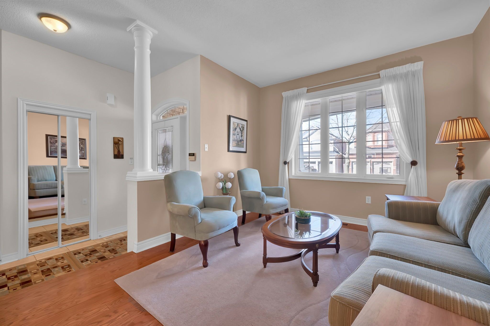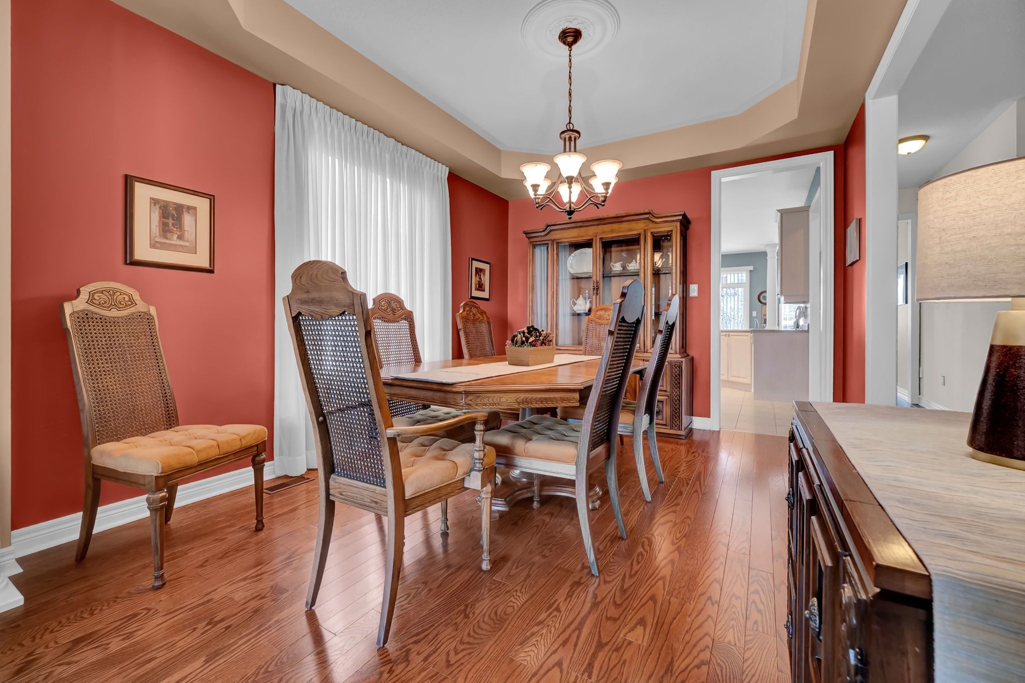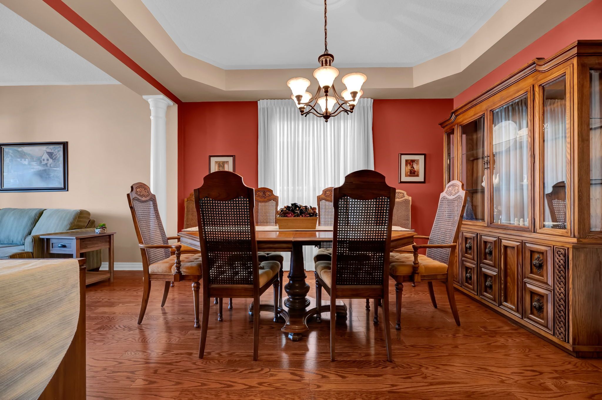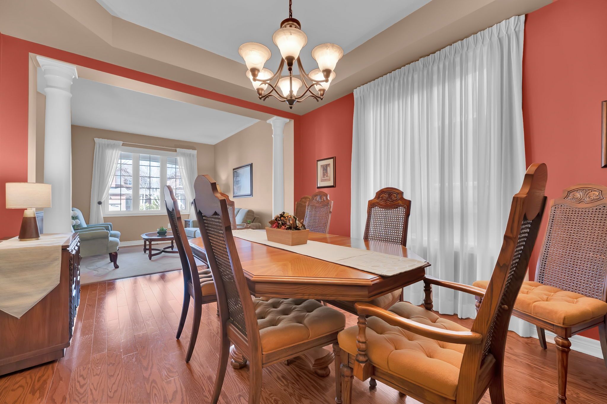 • Bright living and dining rooms with elegant coffered ceiling.