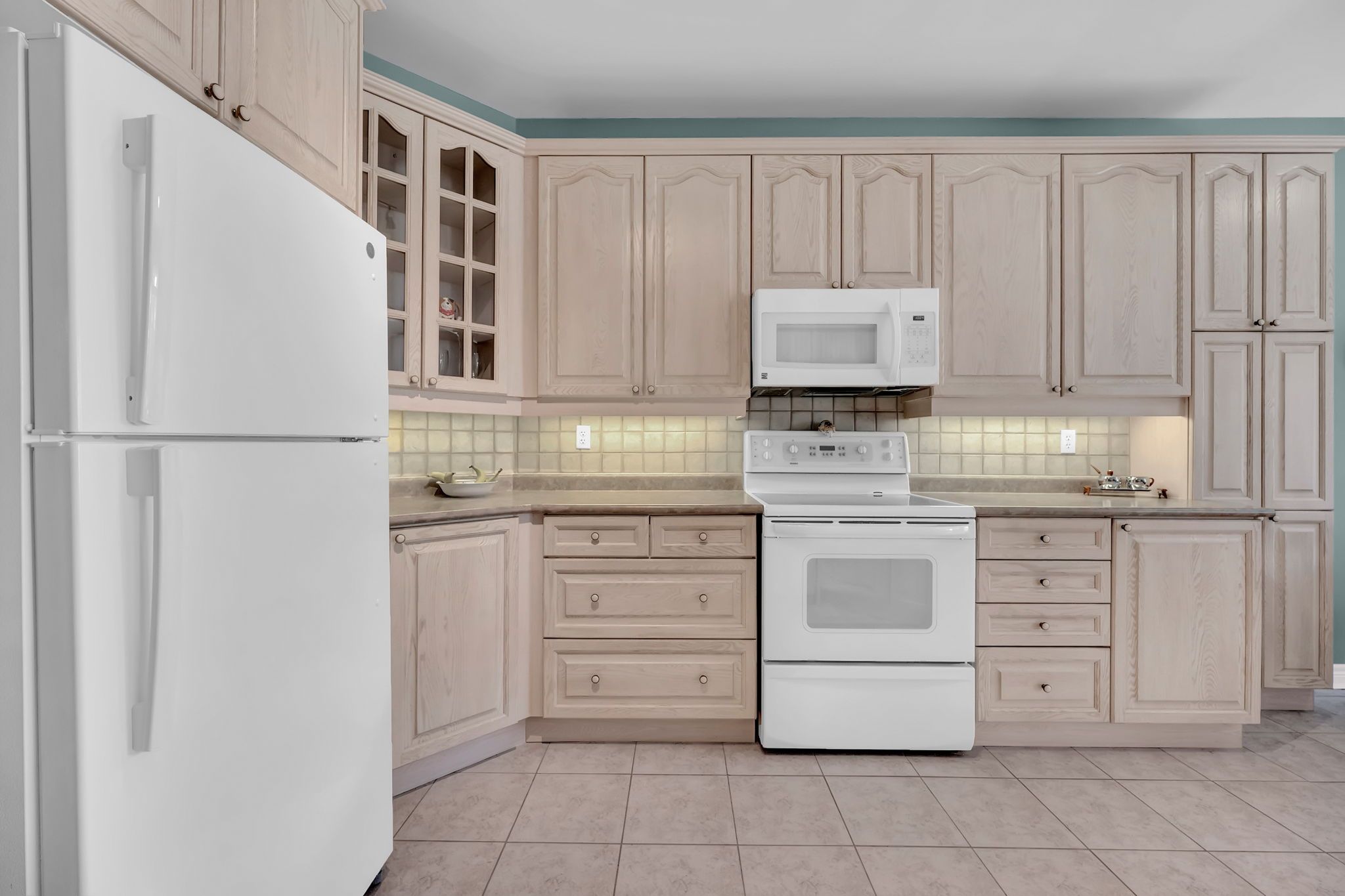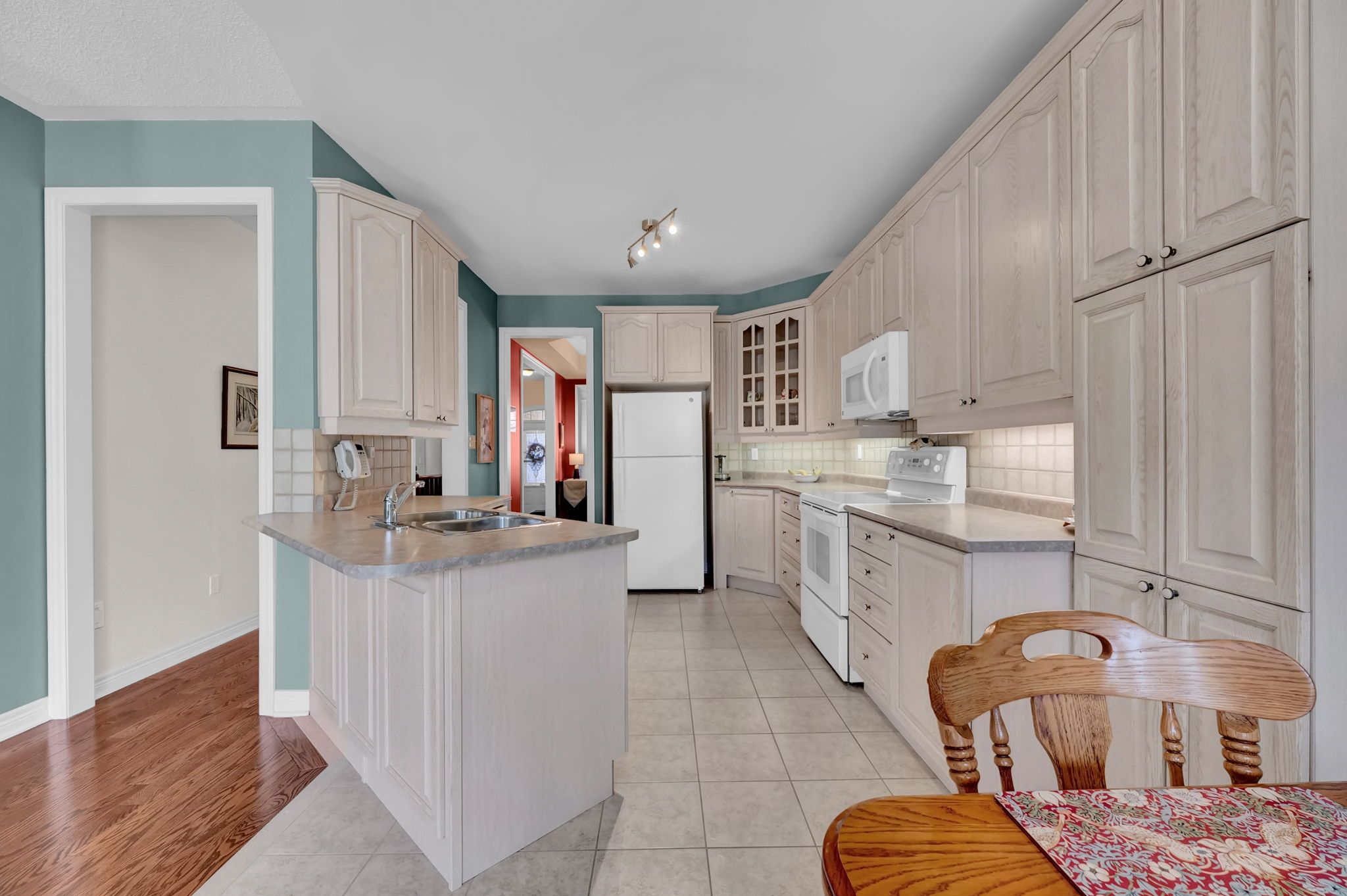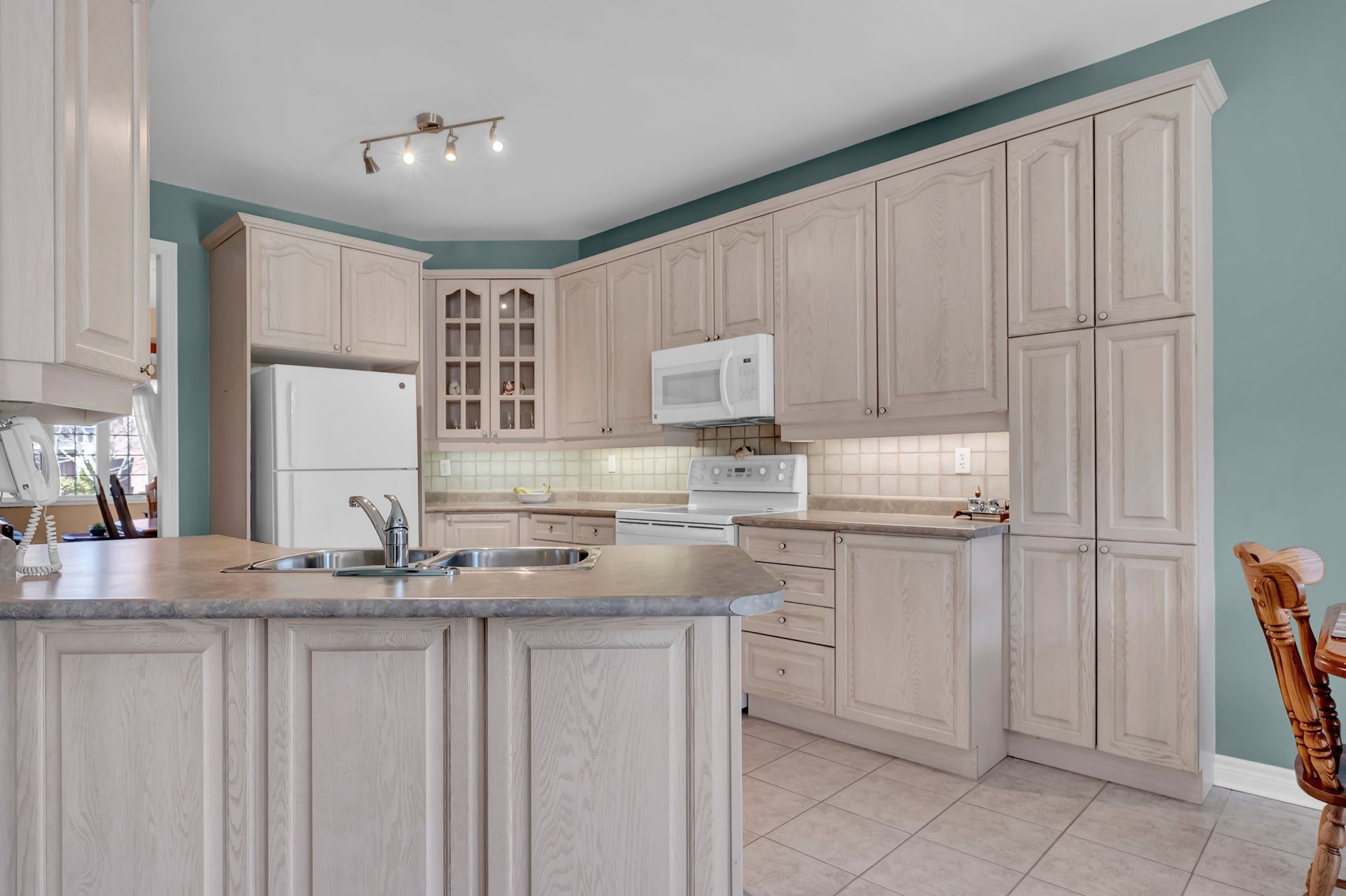 • Large kitchen with under-cabinet lighting and peninsula island.