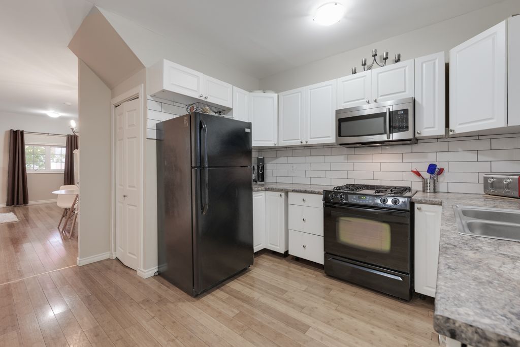 • Main floor unit has two bedrooms and a modern kitchen with stainless steel appliances.