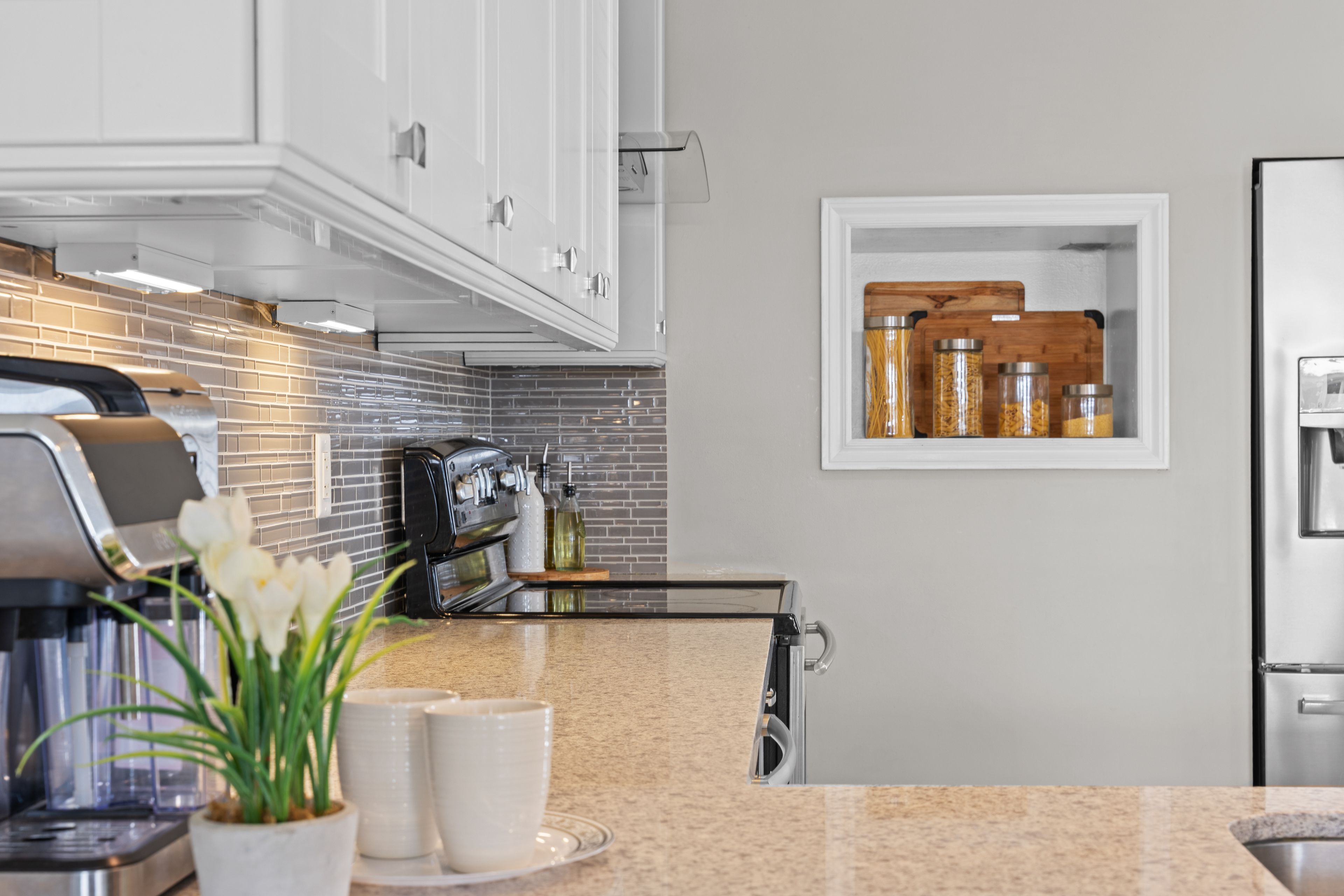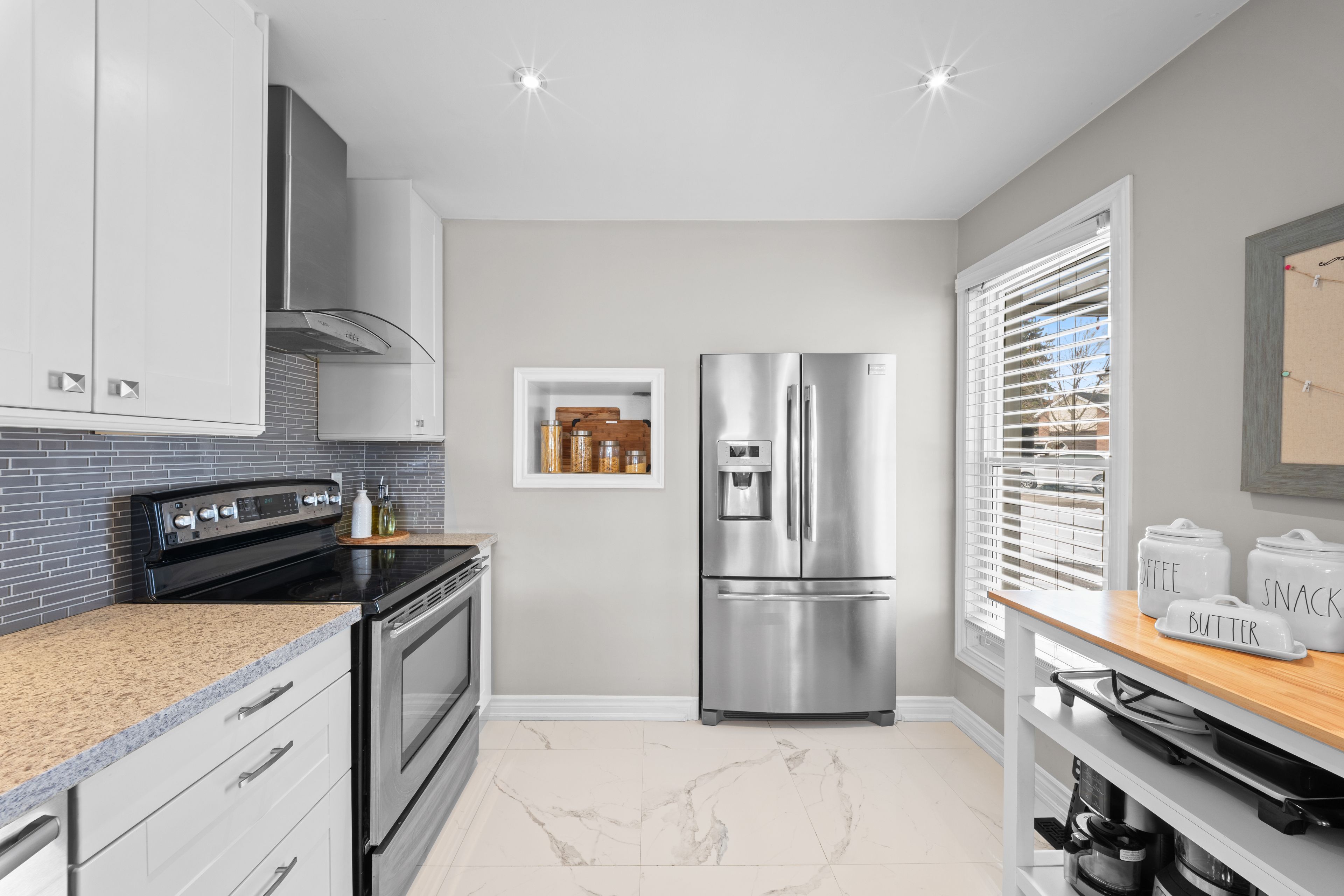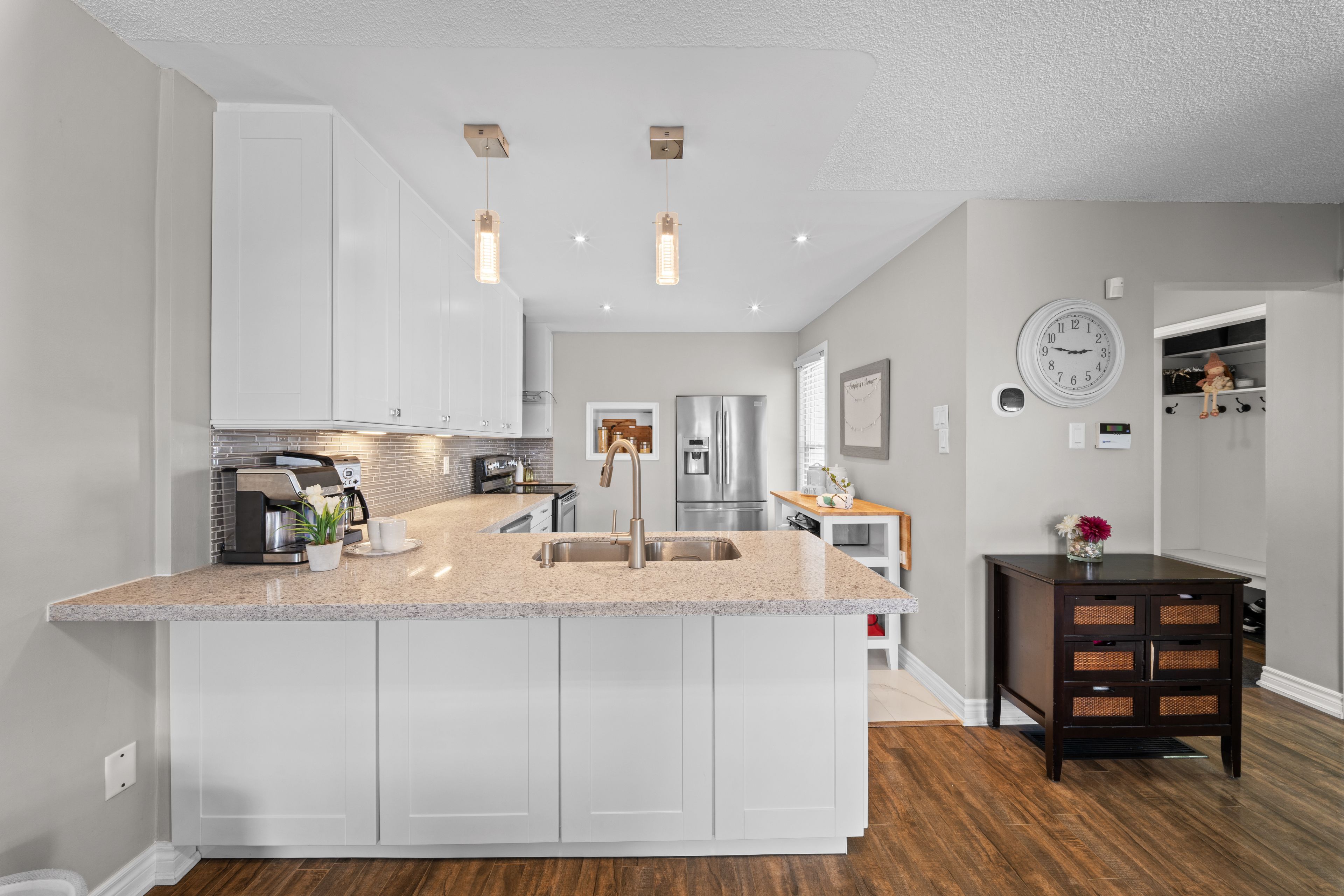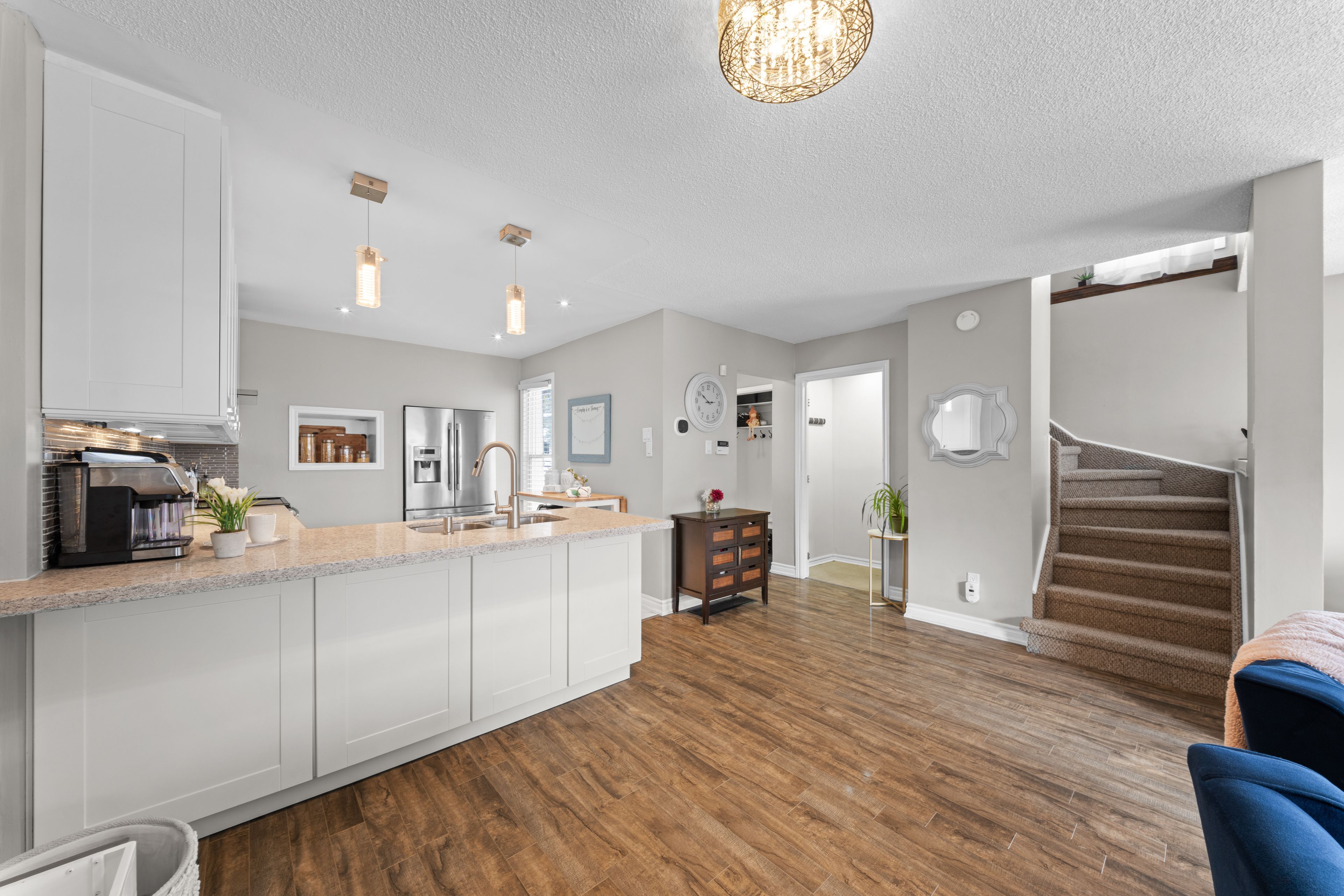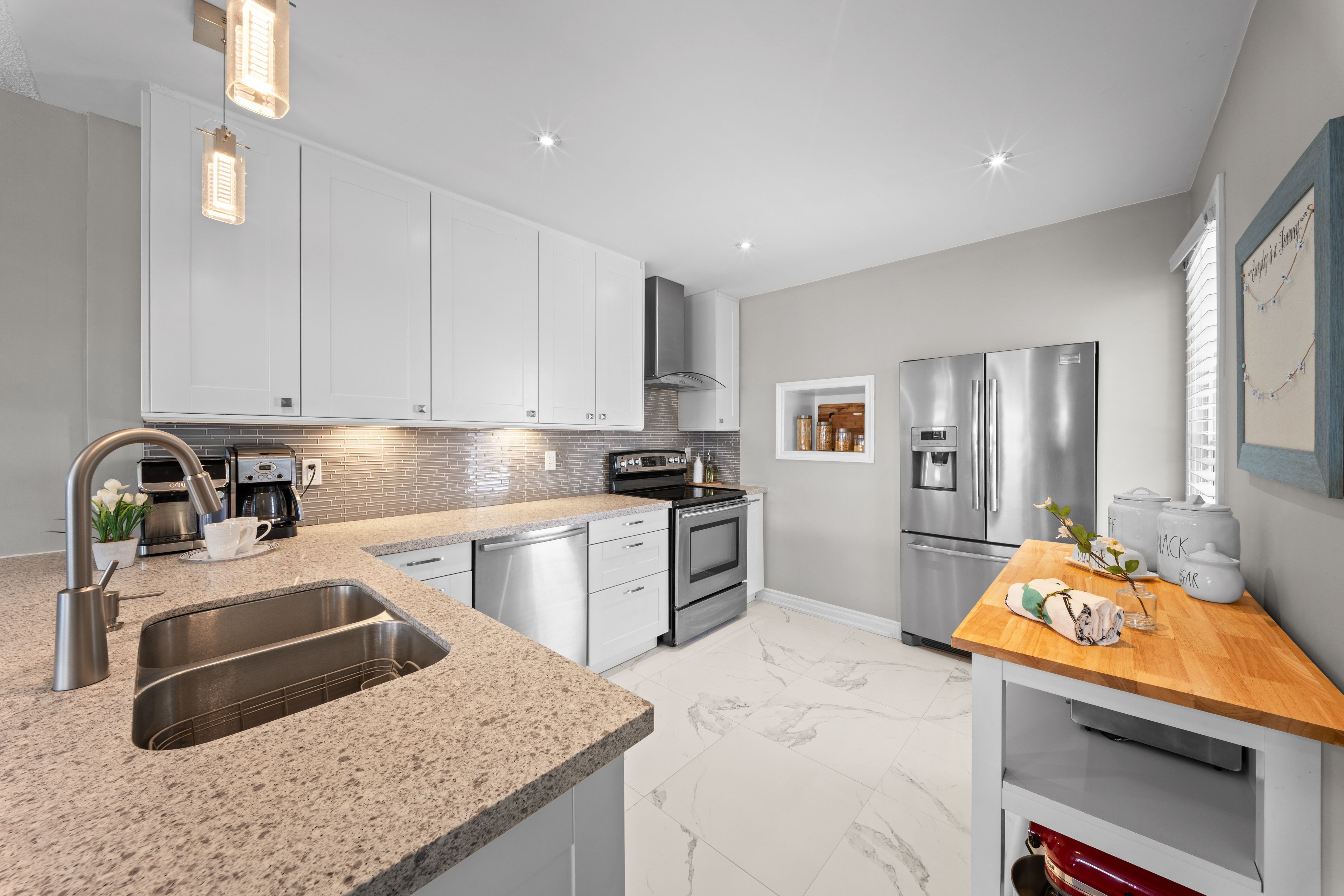 • Renovated kitchen with stainless steel appliances and breakfast bar.