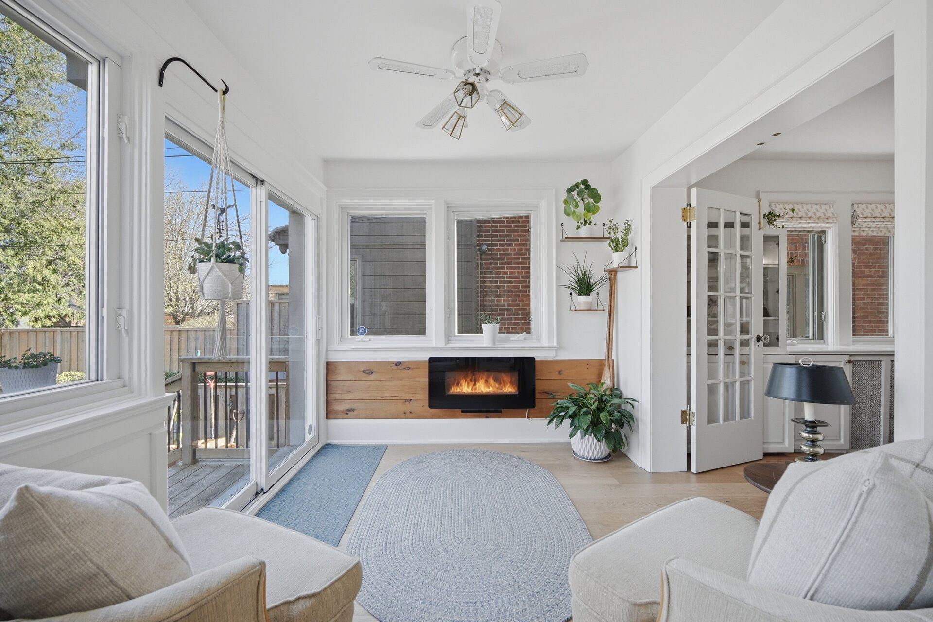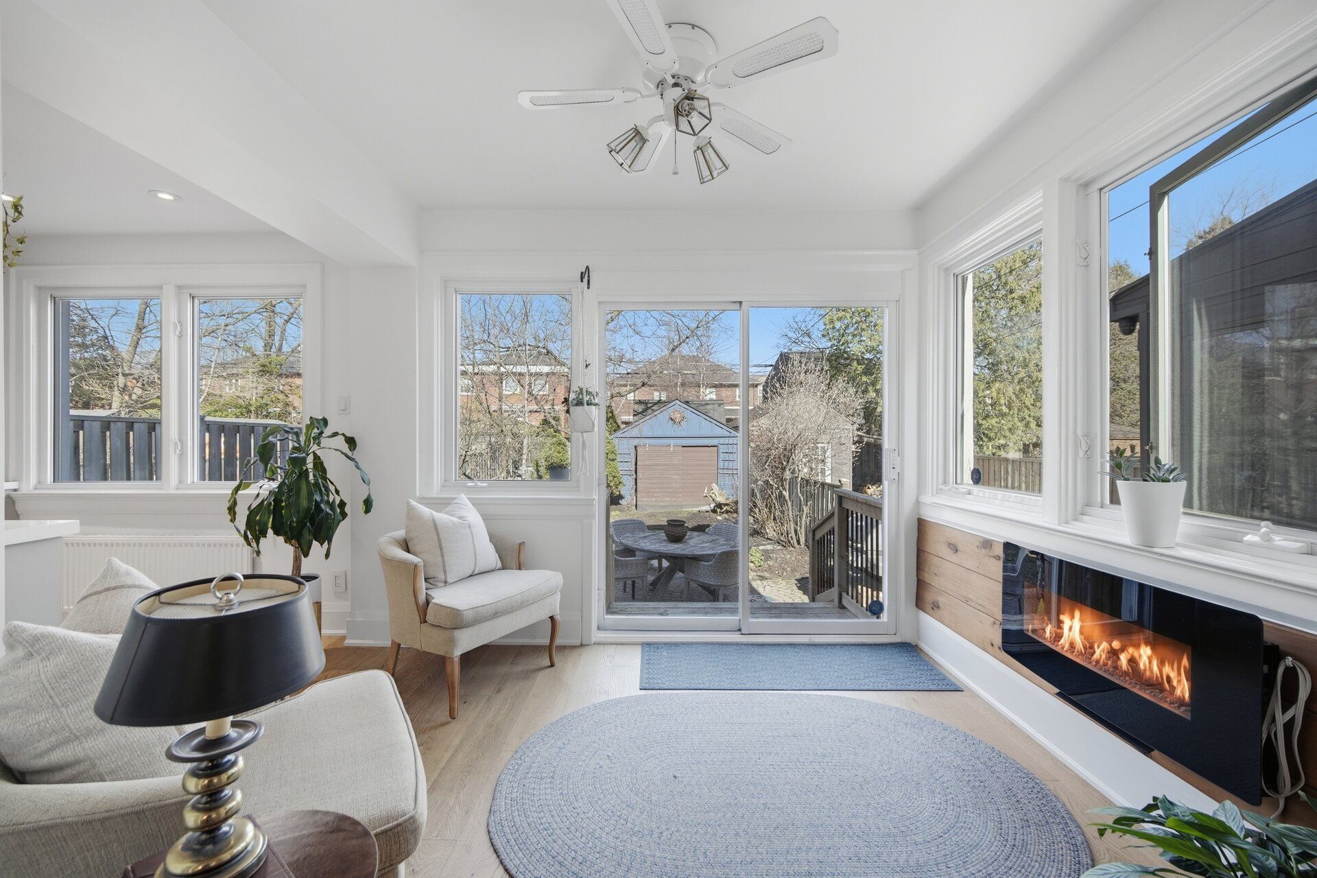 • Welcoming family room with wood-burning fireplace and natural light.