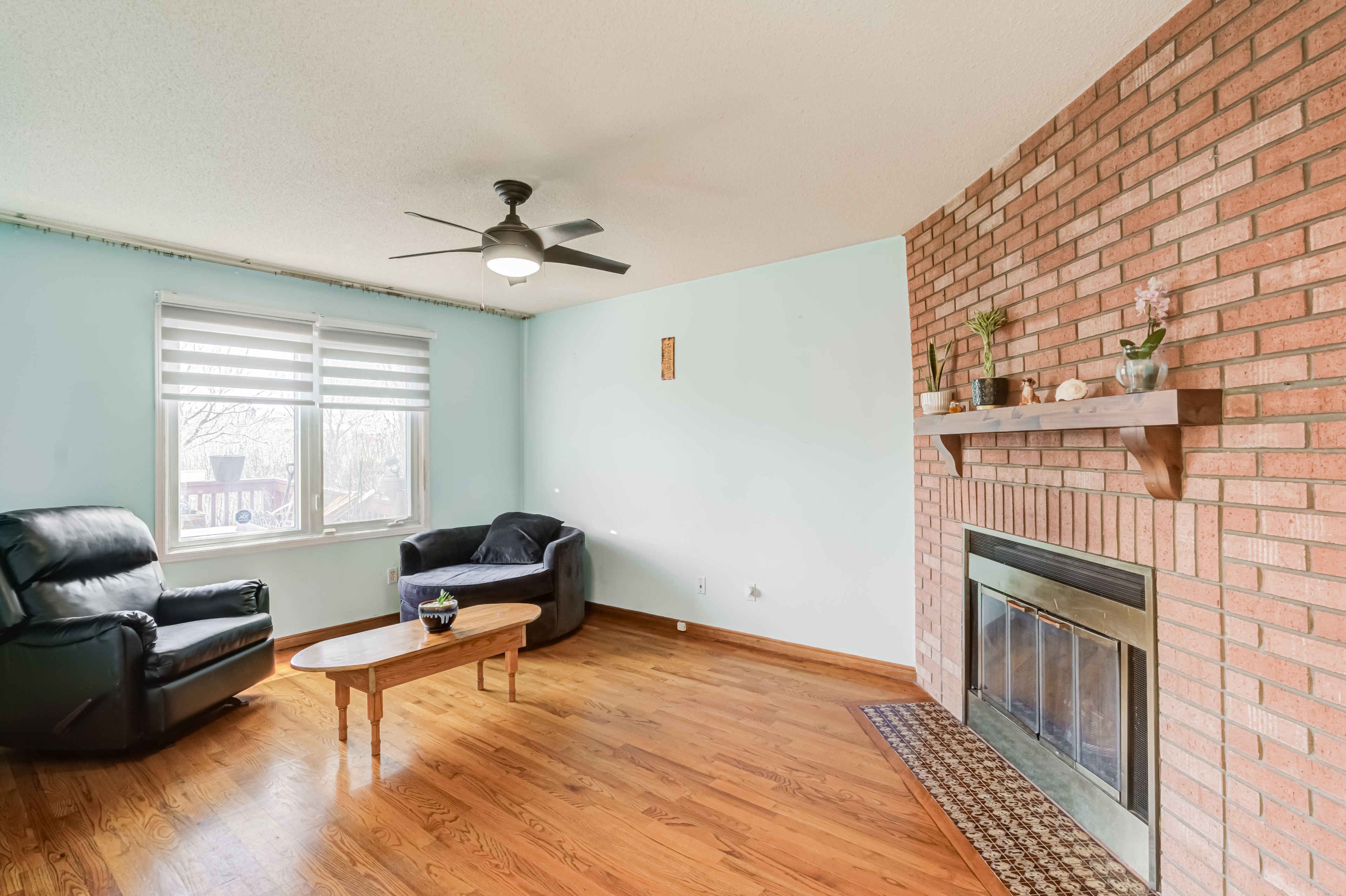 • Large family room with high ceilings, big windows, and a cozy fireplace.