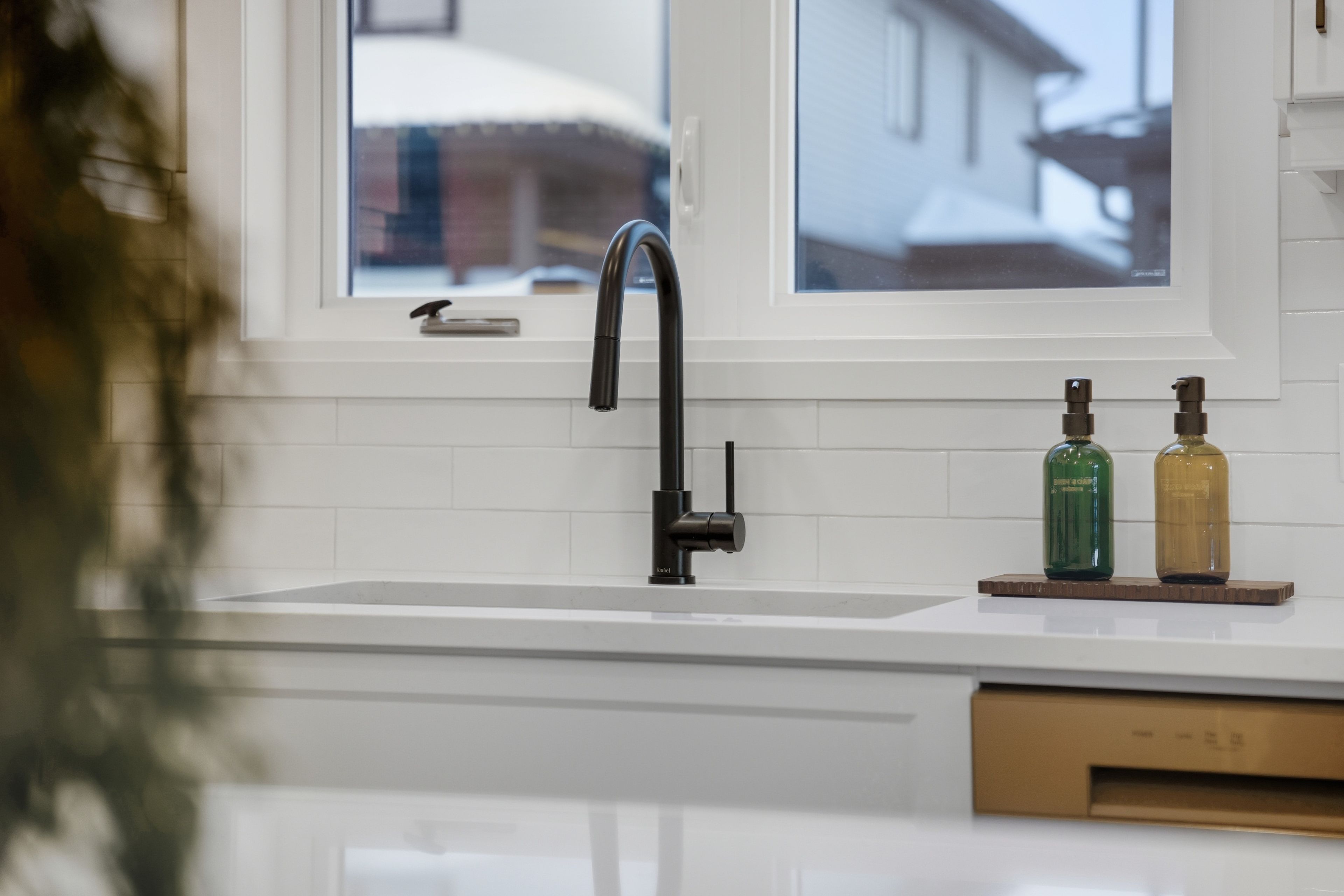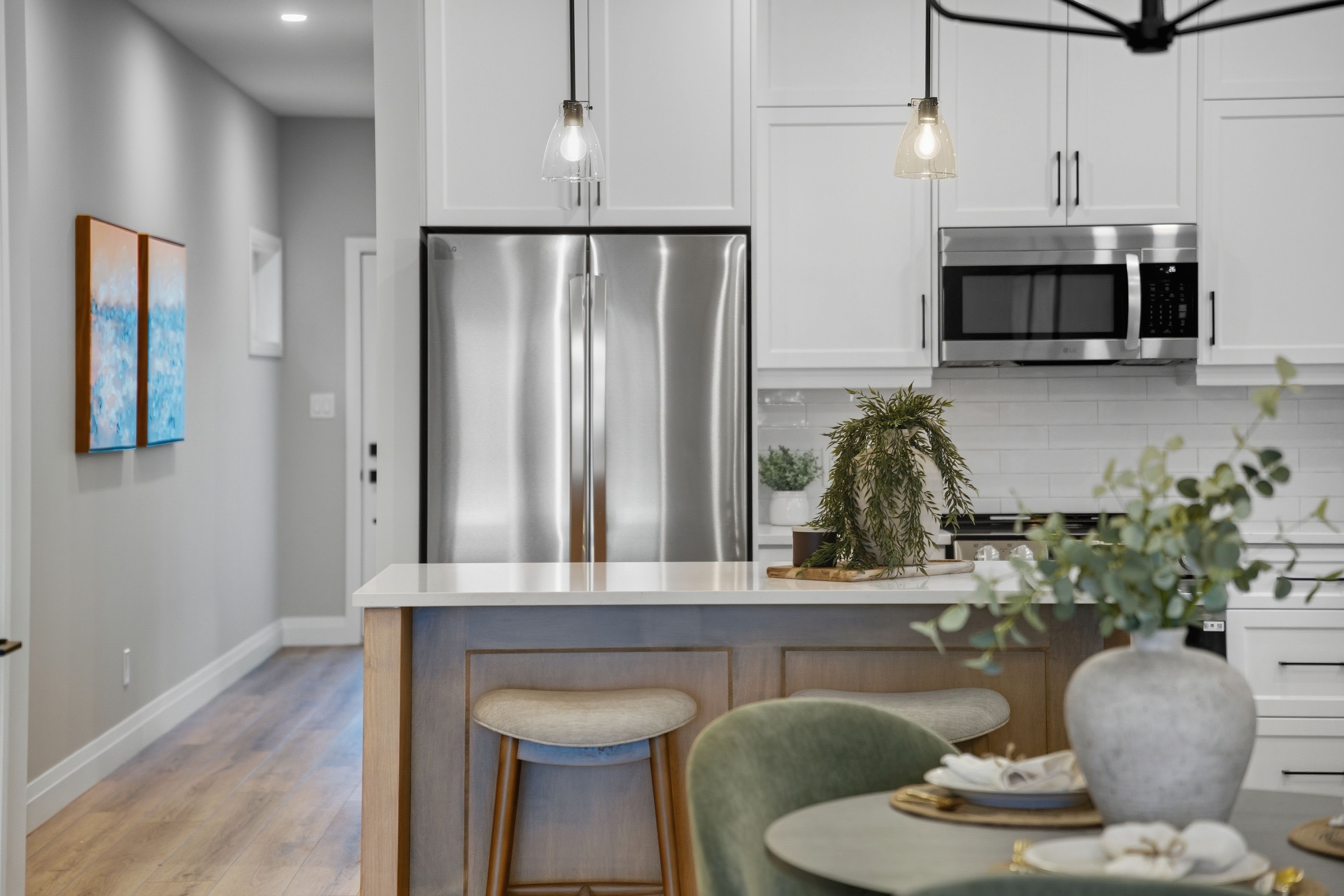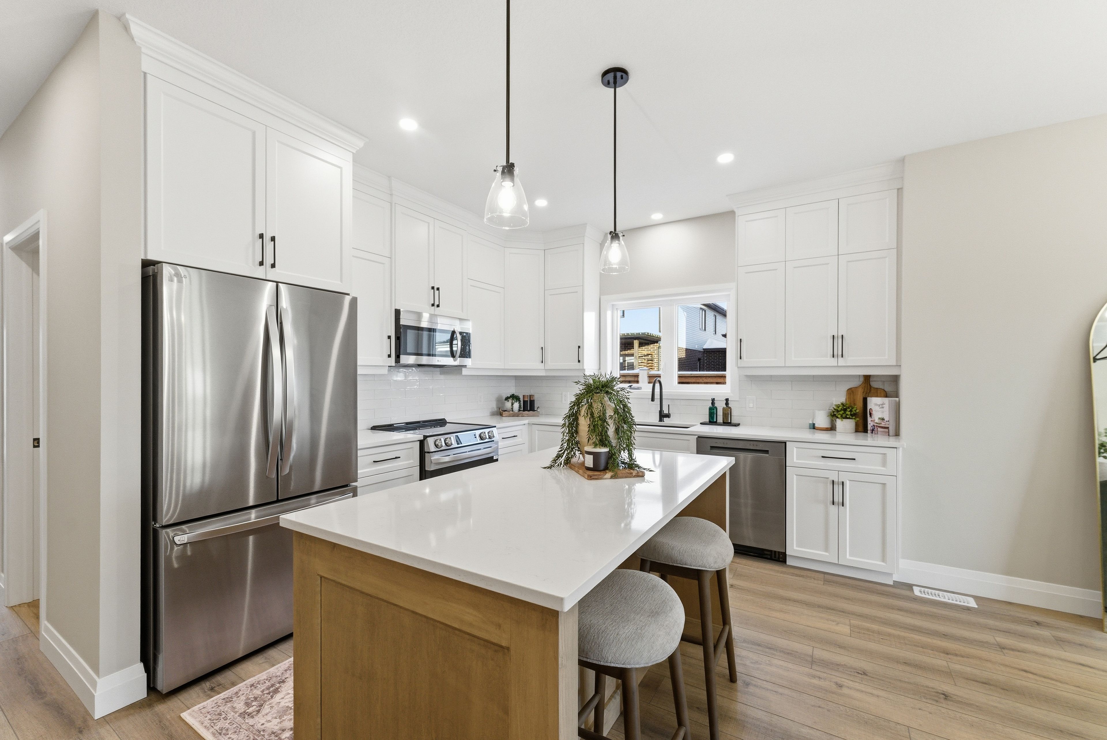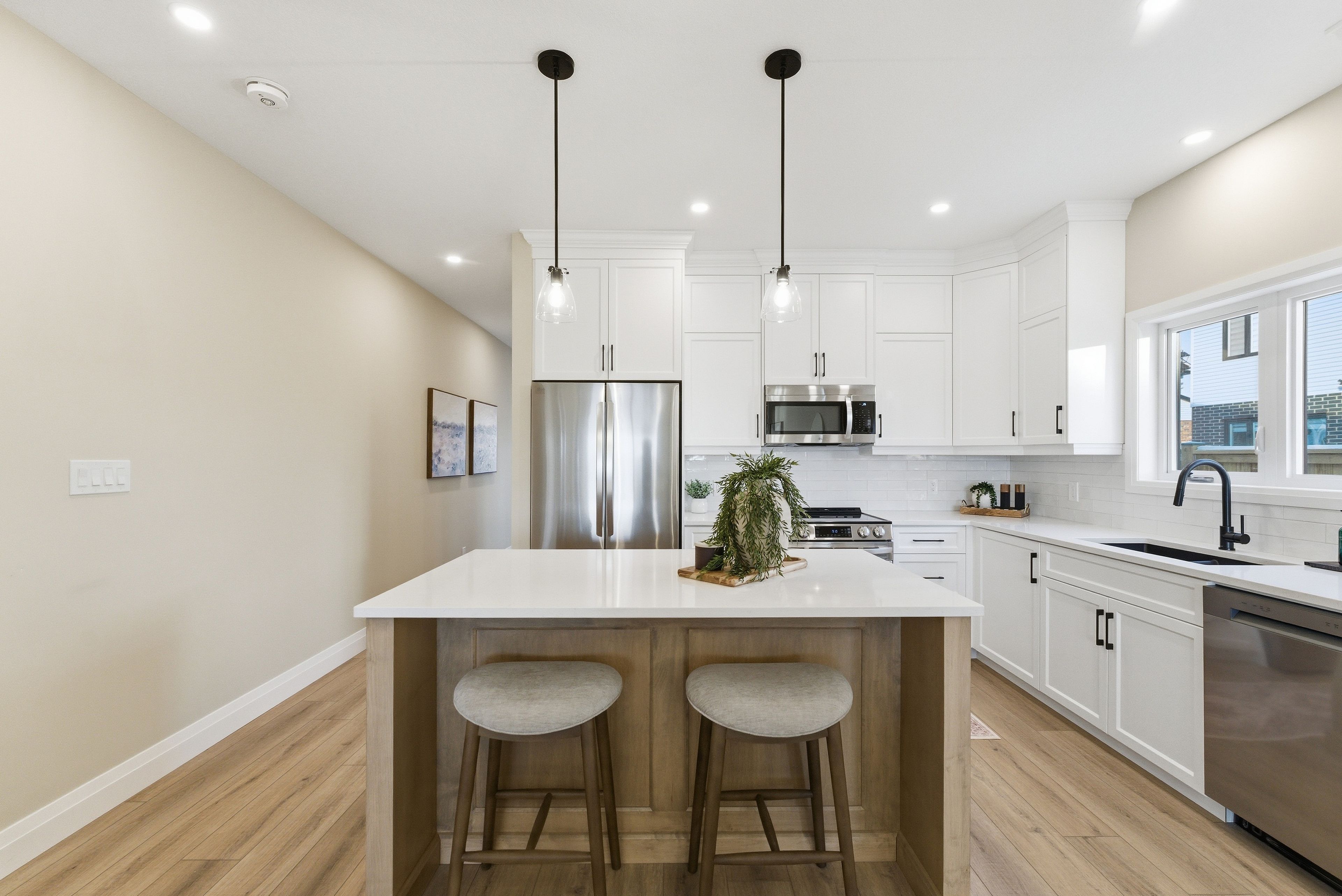 • Open-concept main floor features quartz countertops and custom cabinetry.