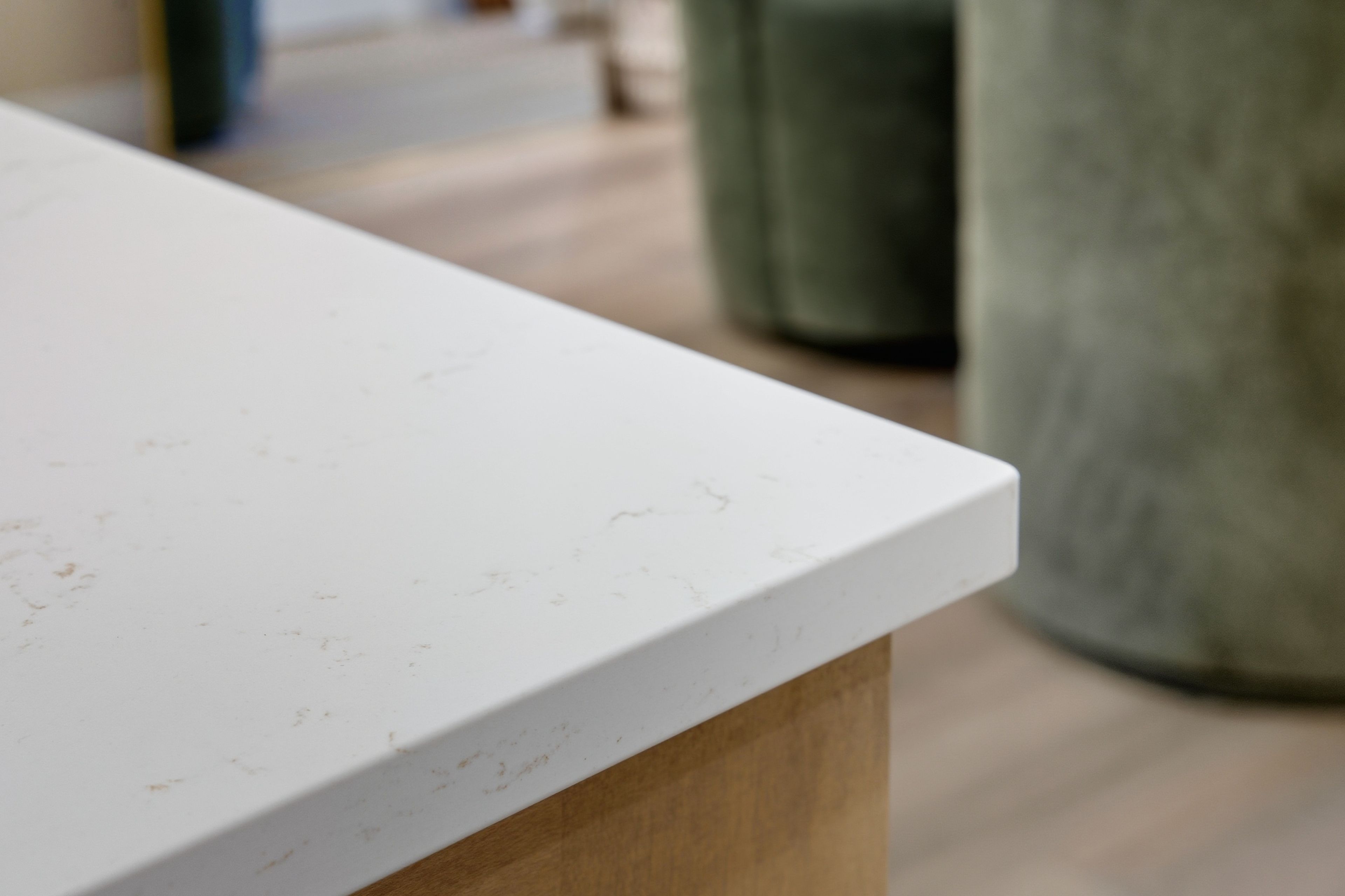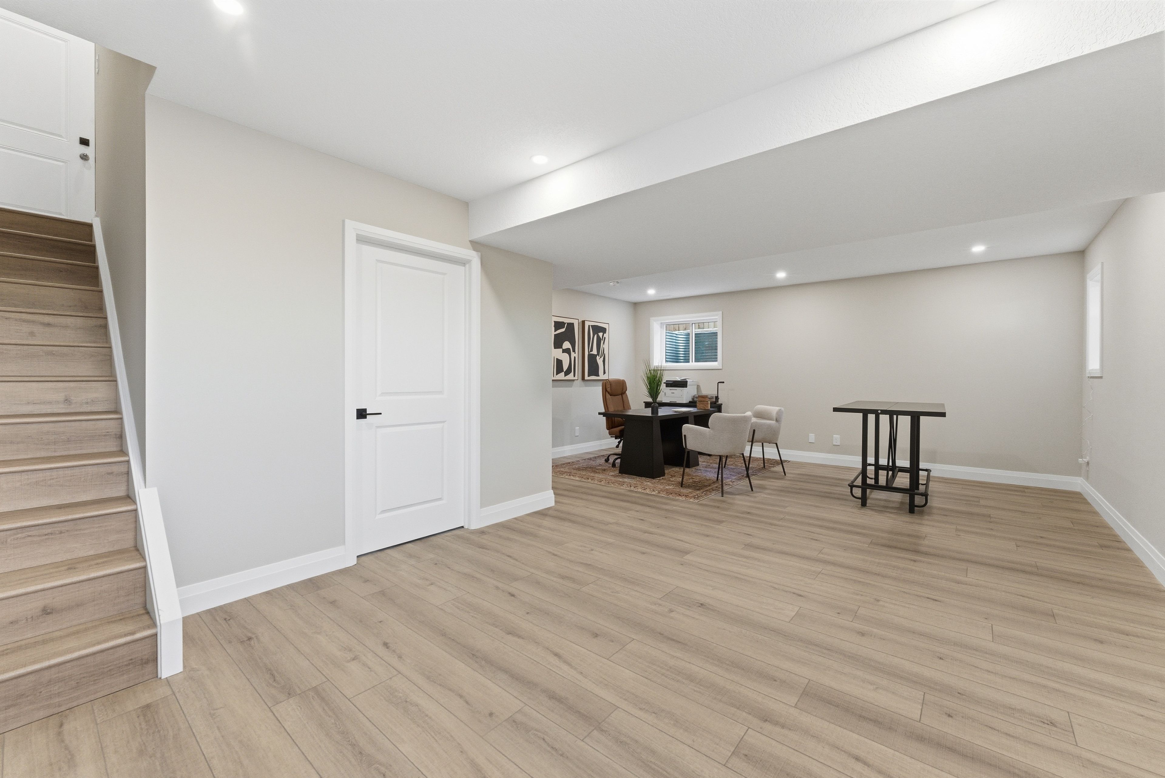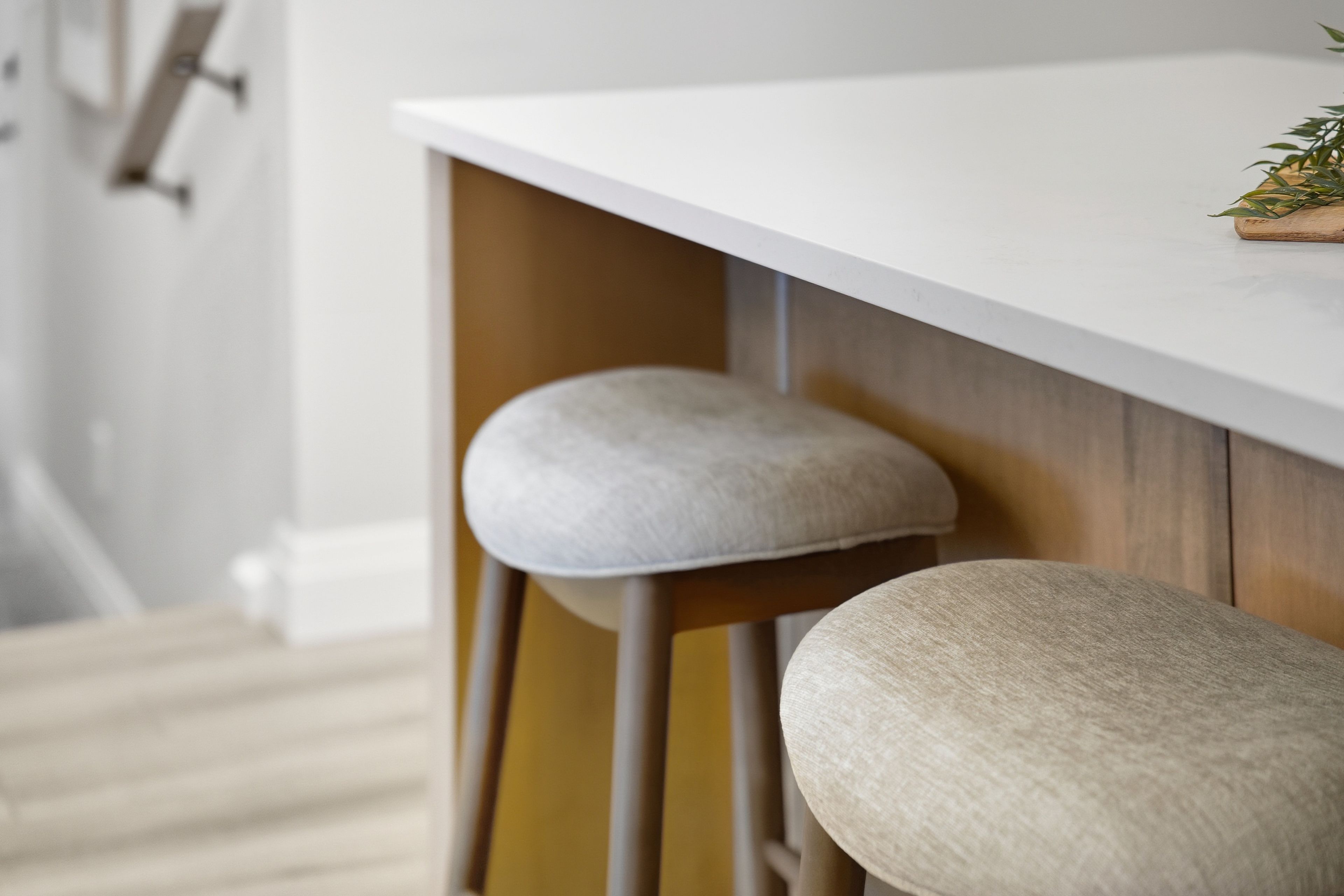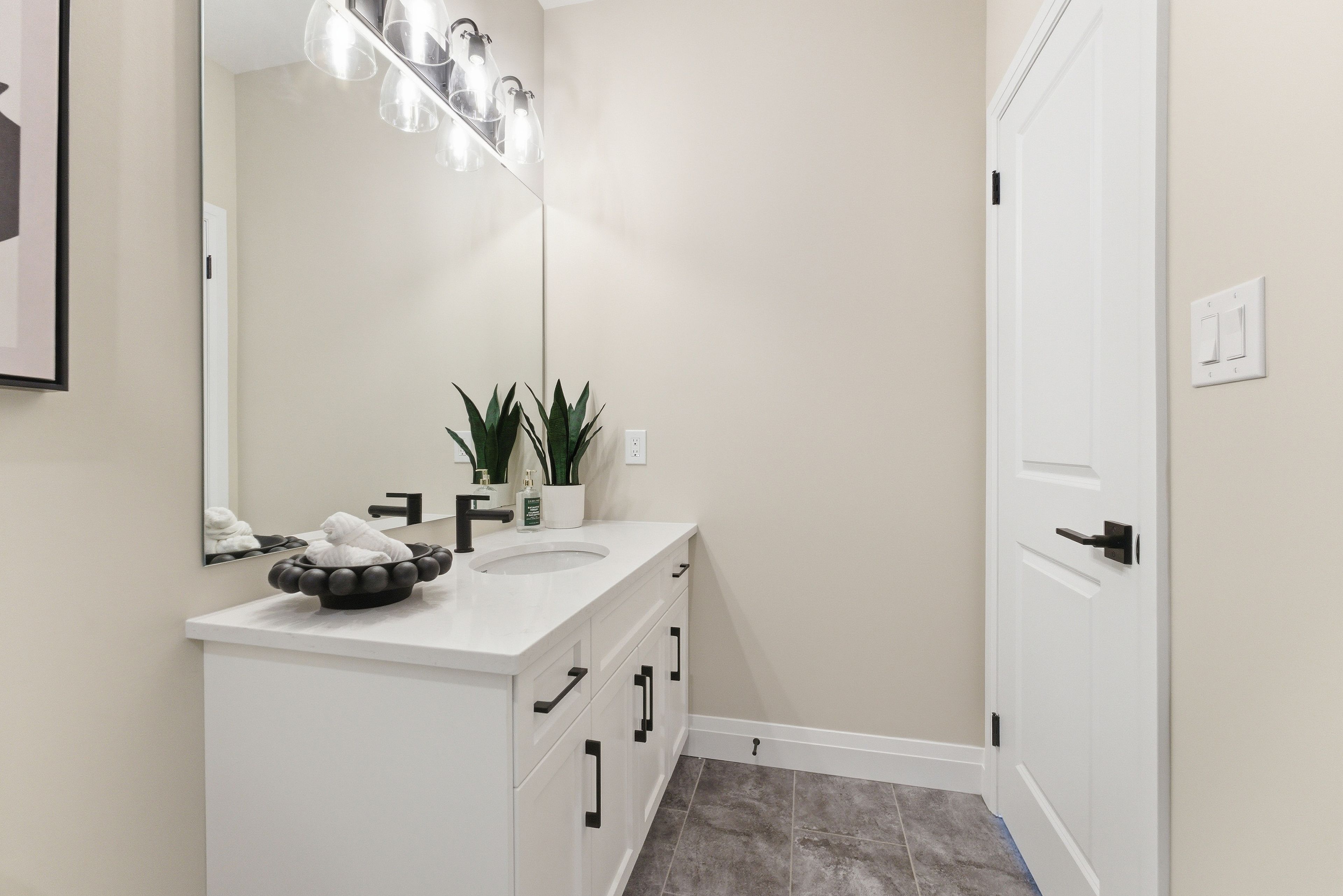 • Open-concept main floor features quartz countertops and custom cabinetry.