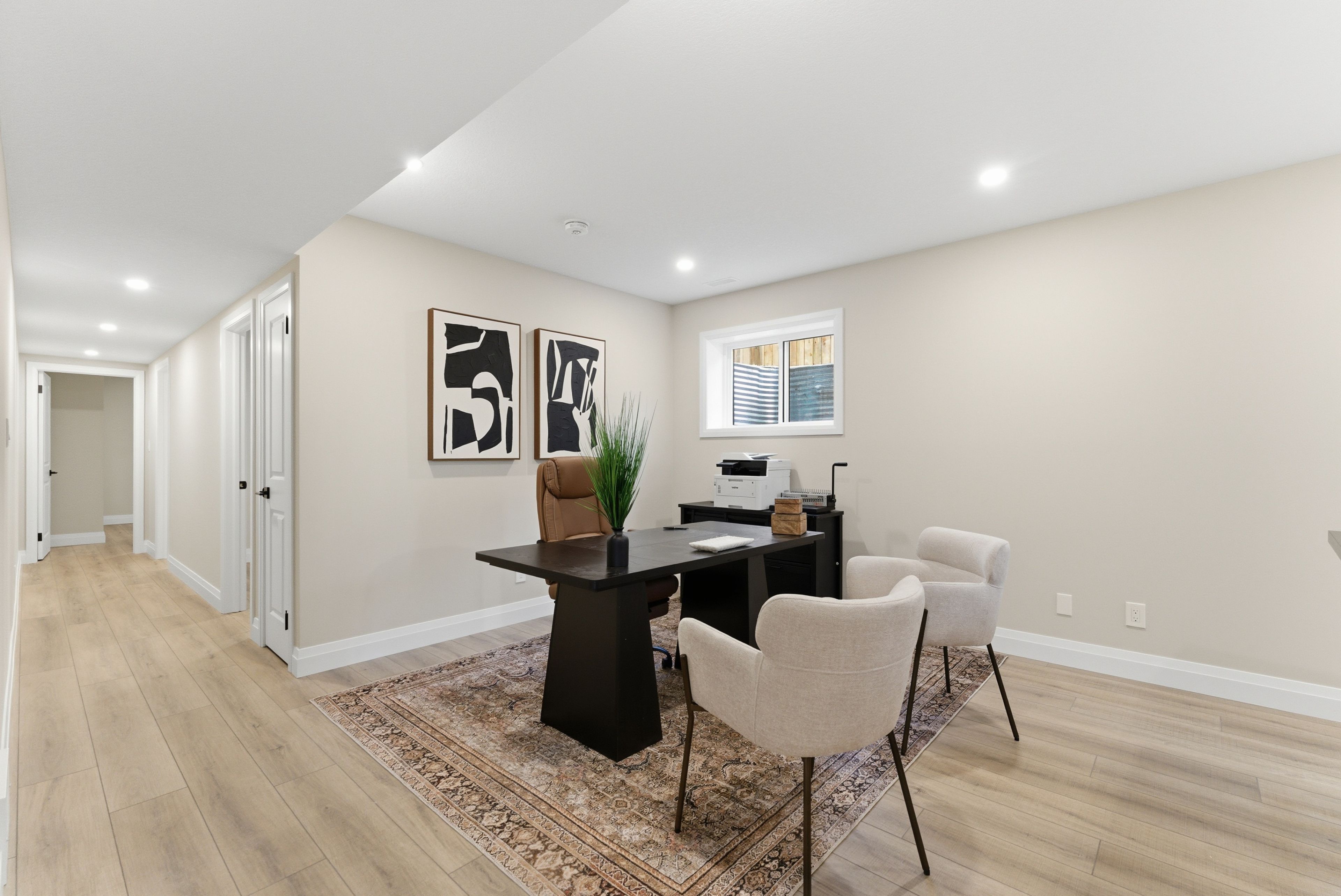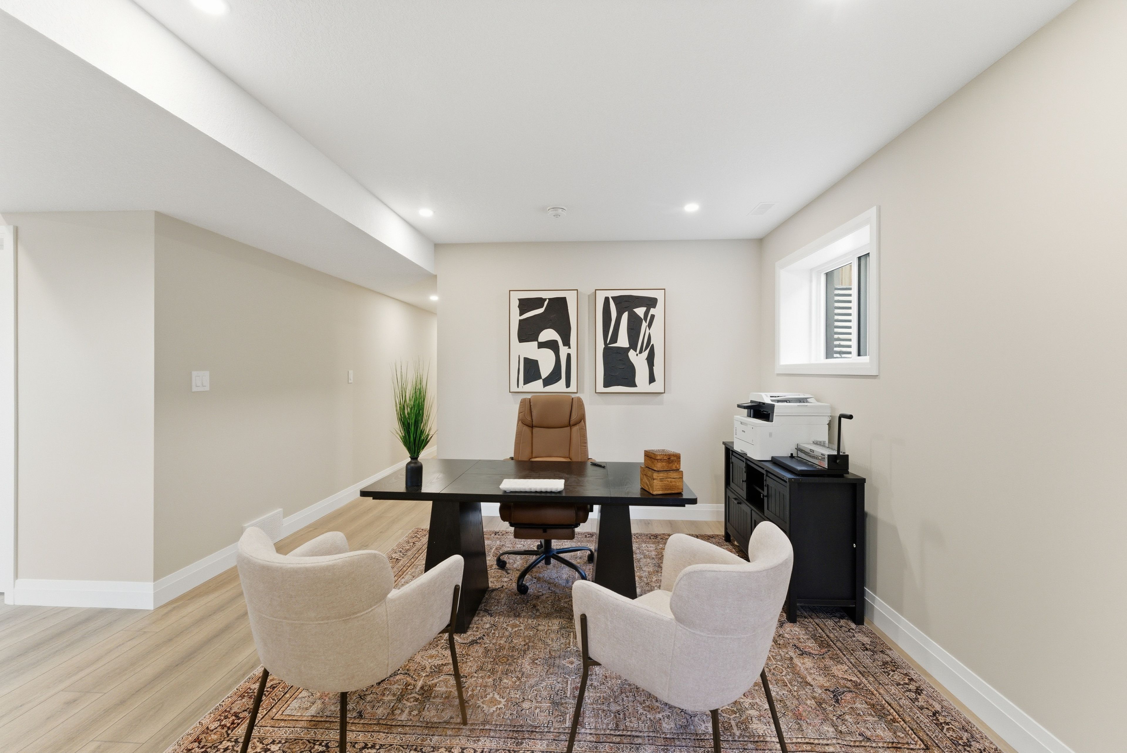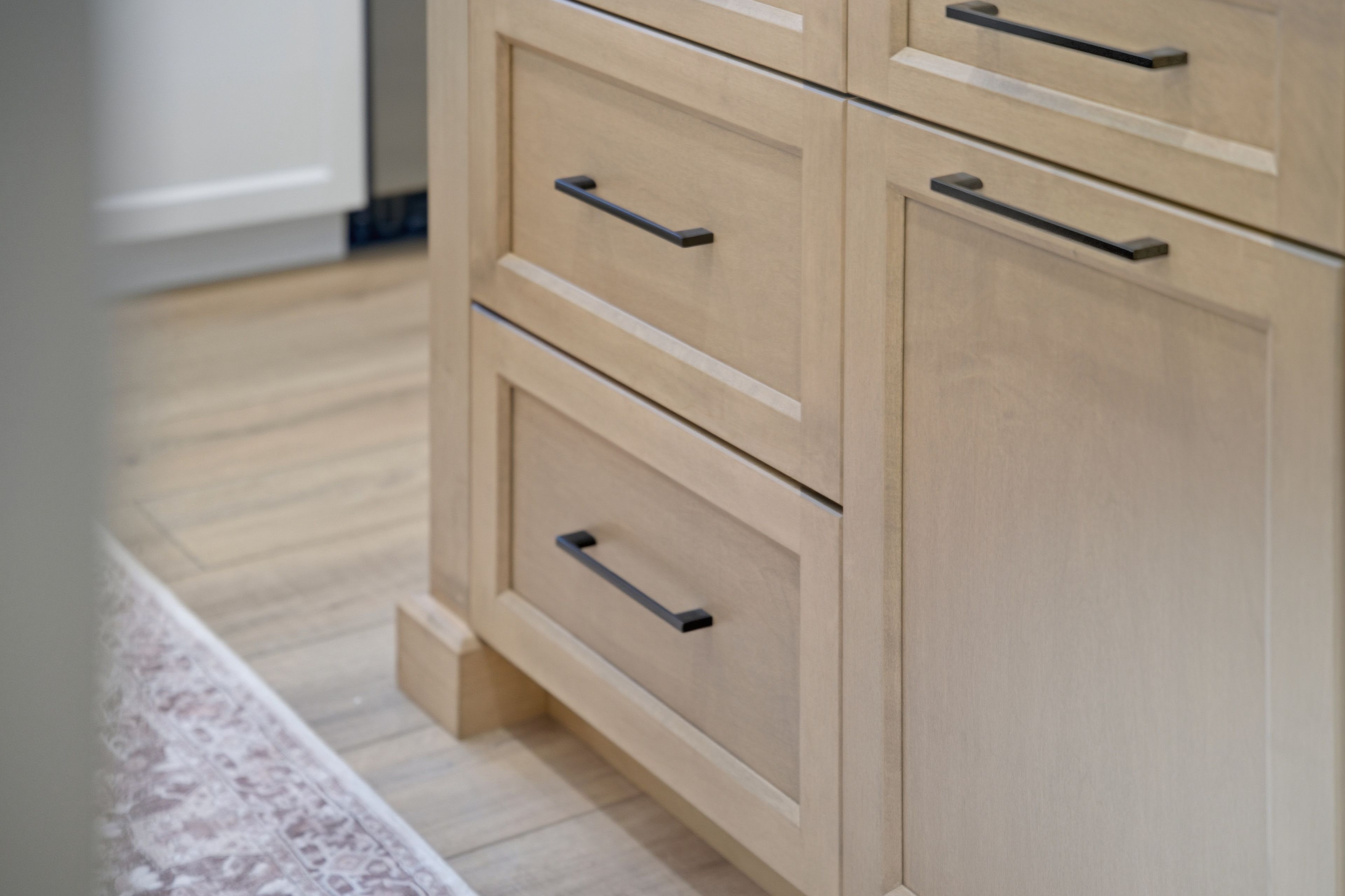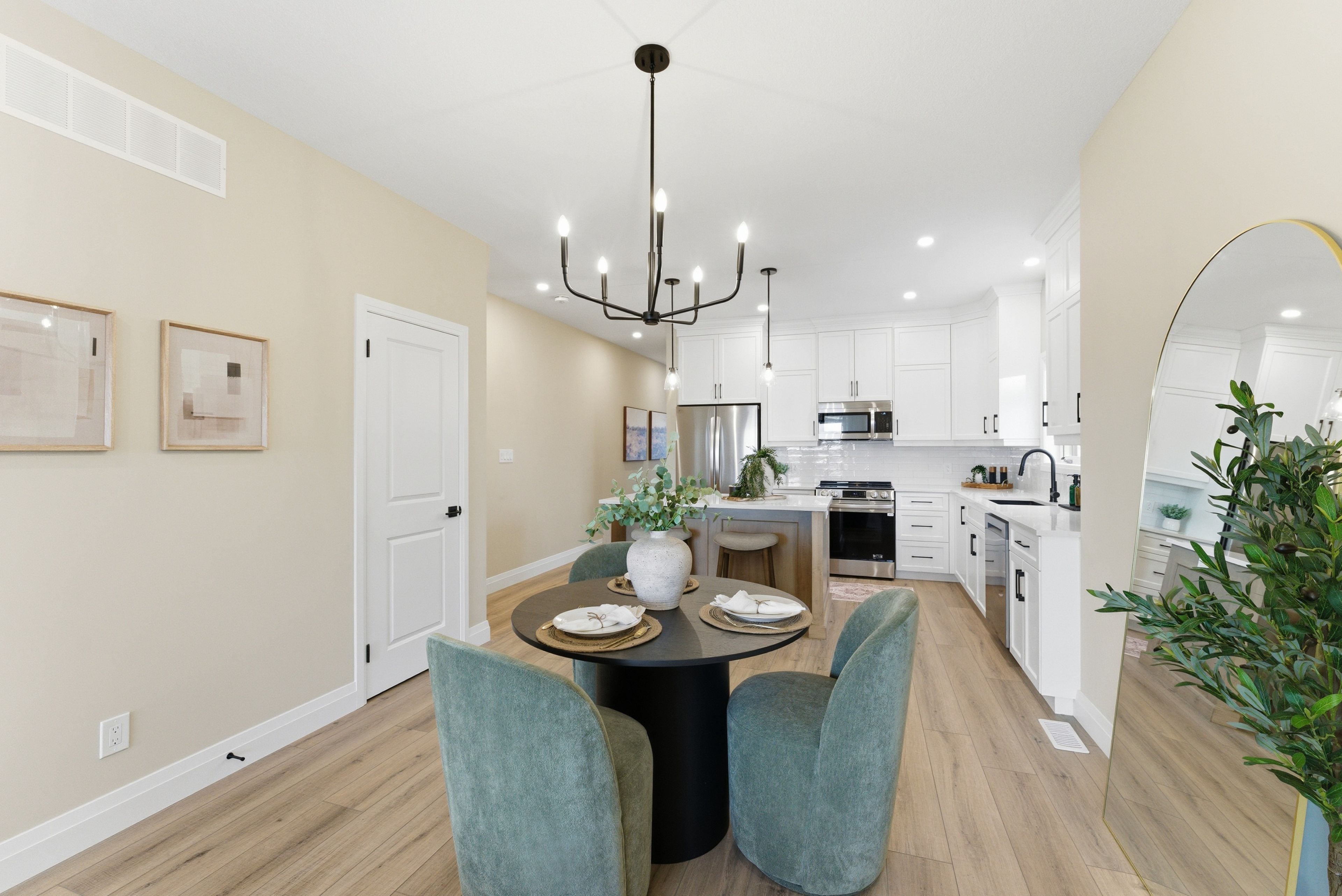 • Open-concept main floor features quartz countertops and custom cabinetry.