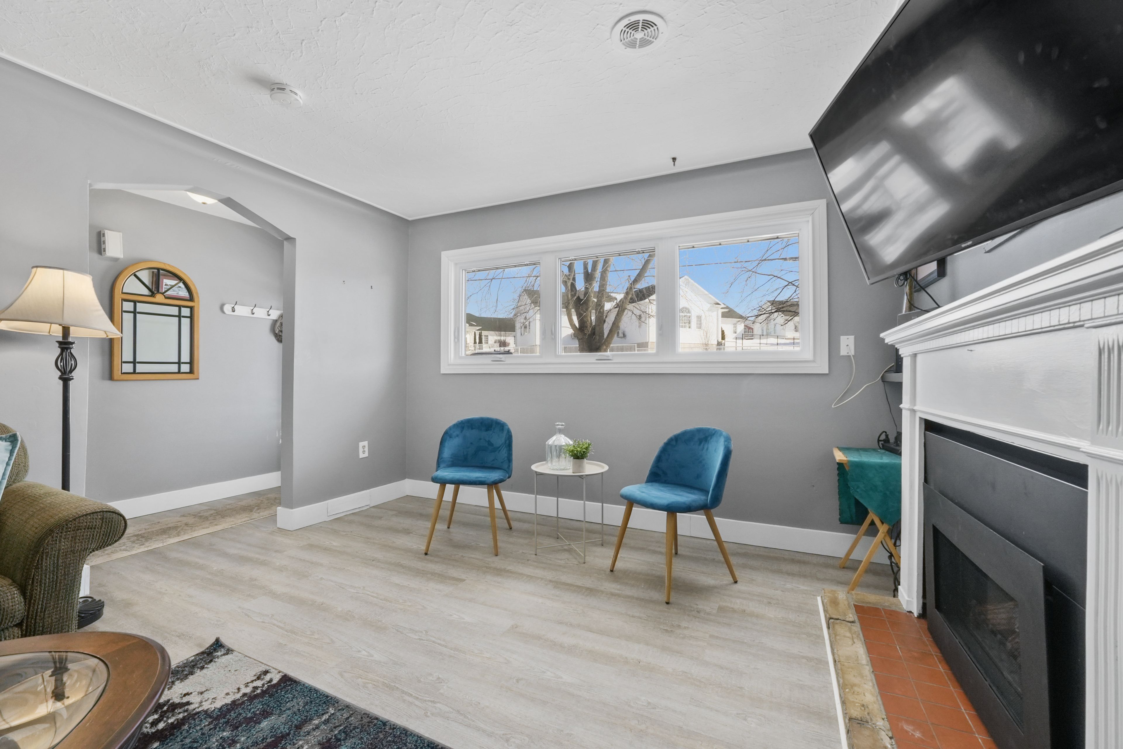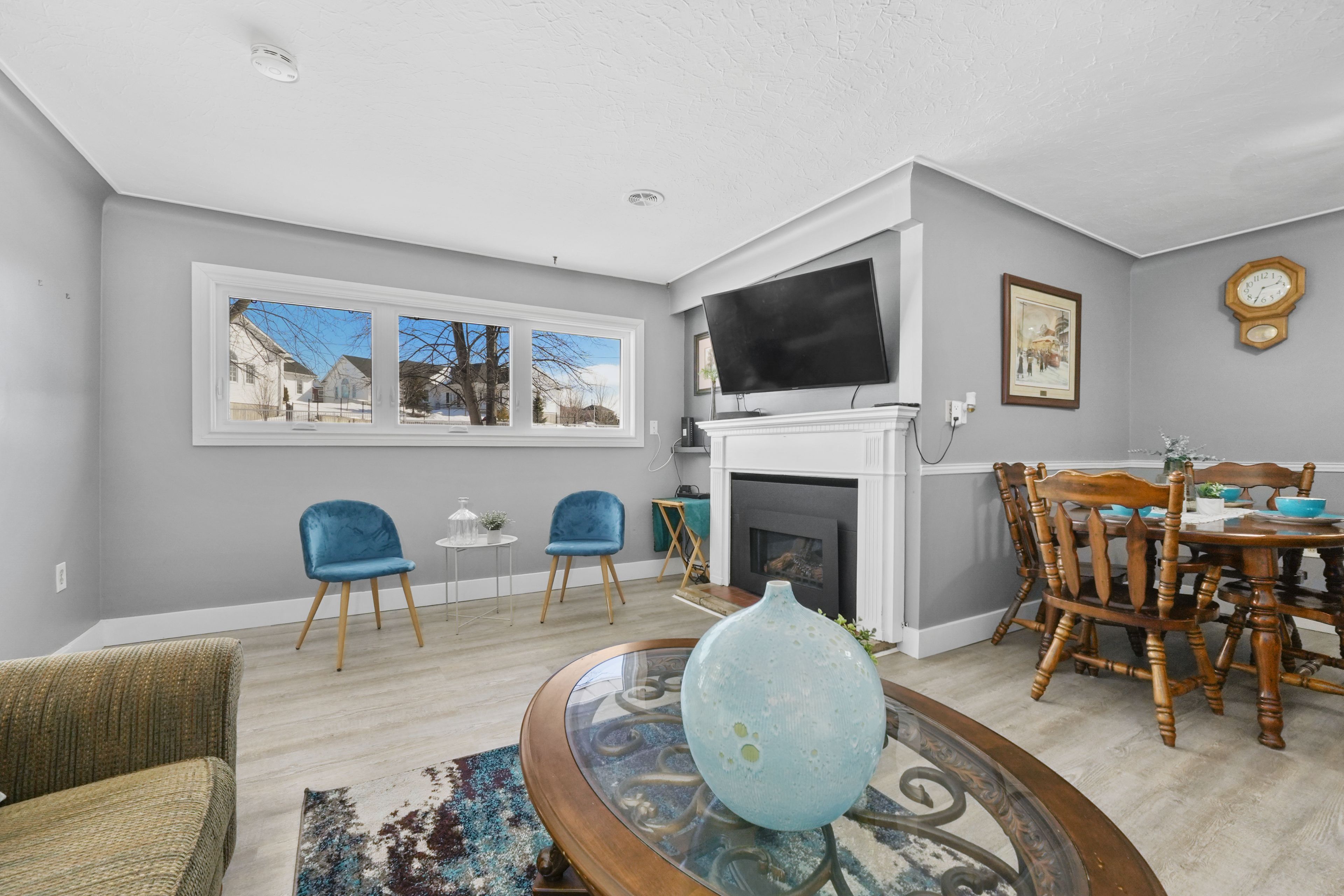 • Bright open living area with large windows and a cozy fireplace.