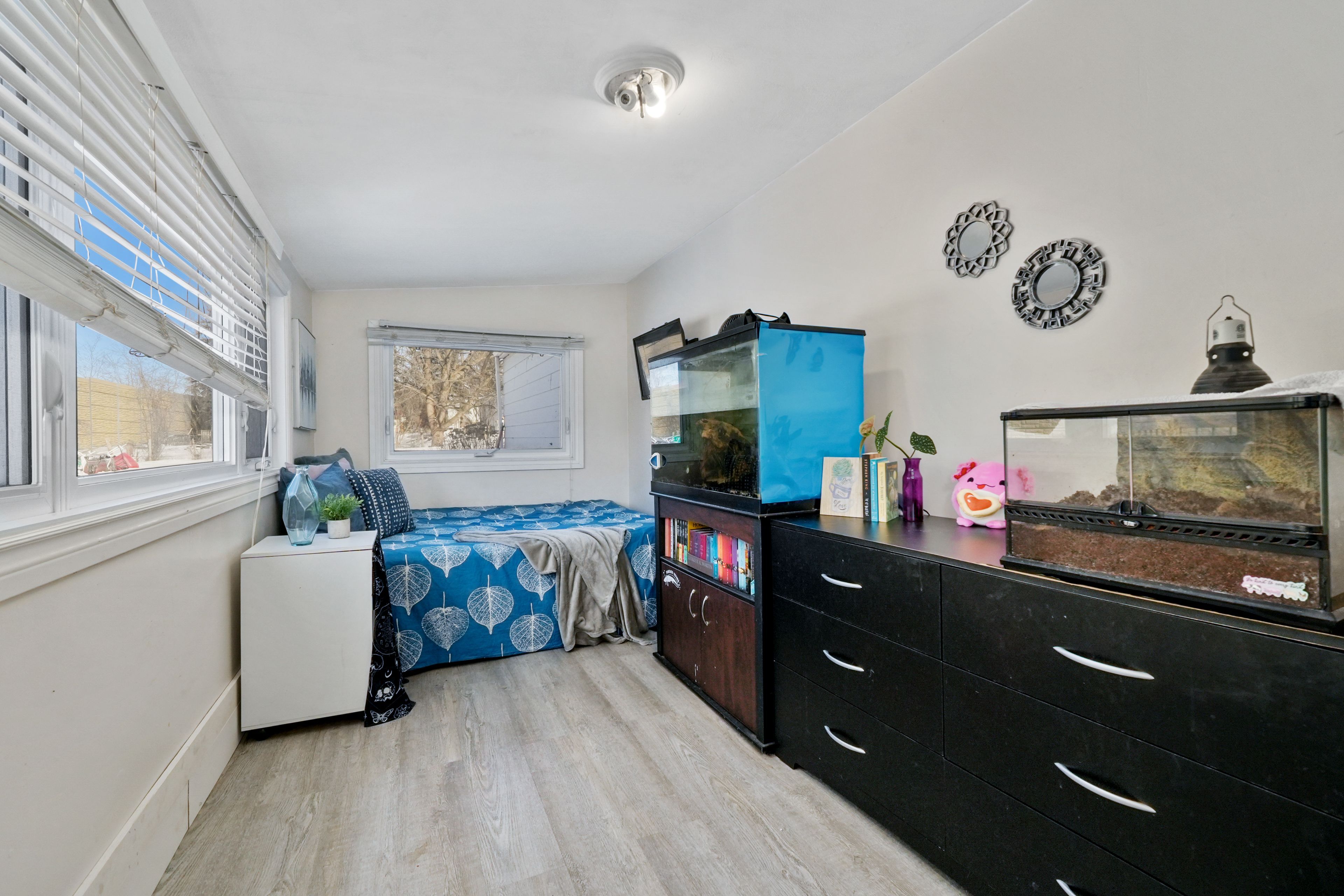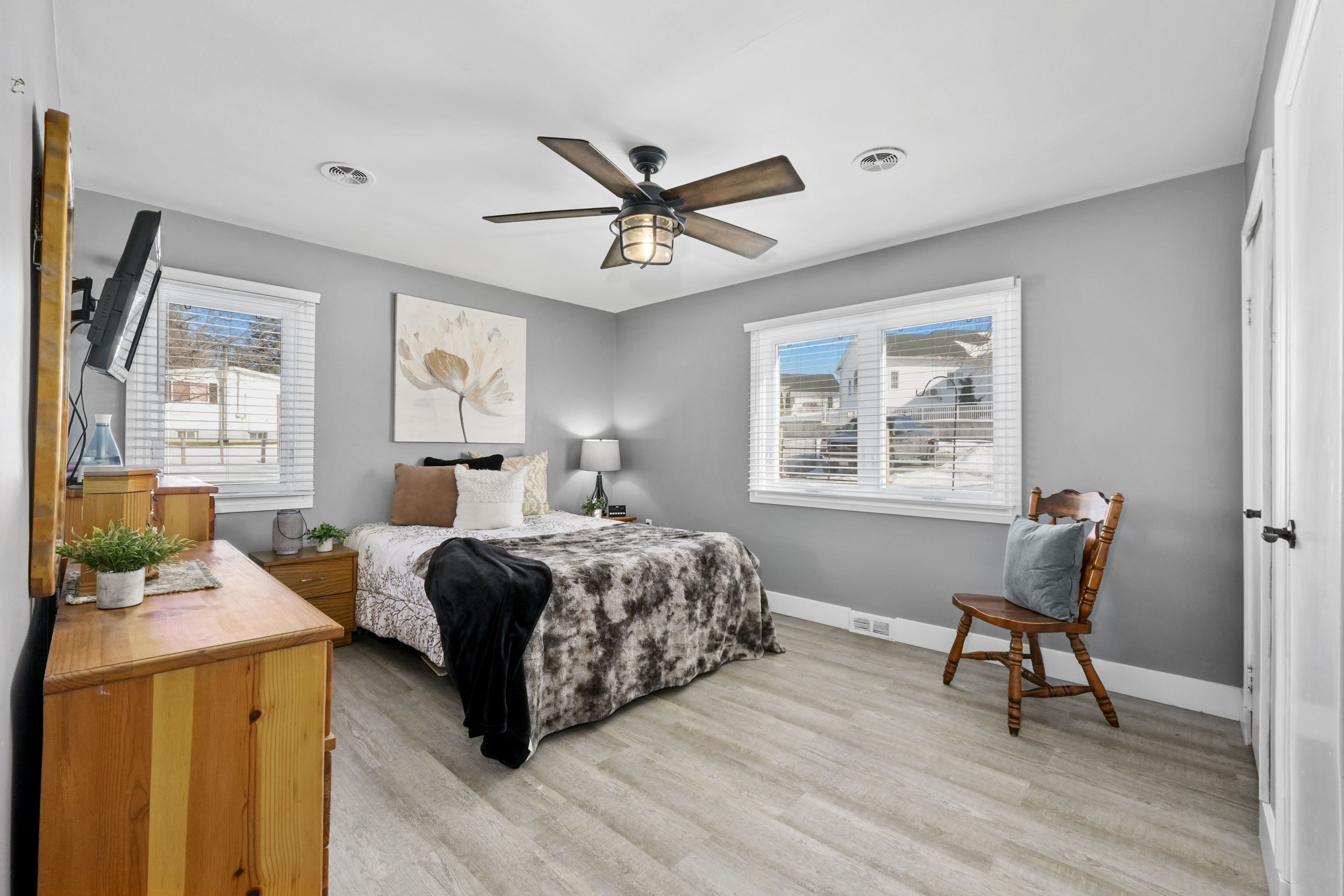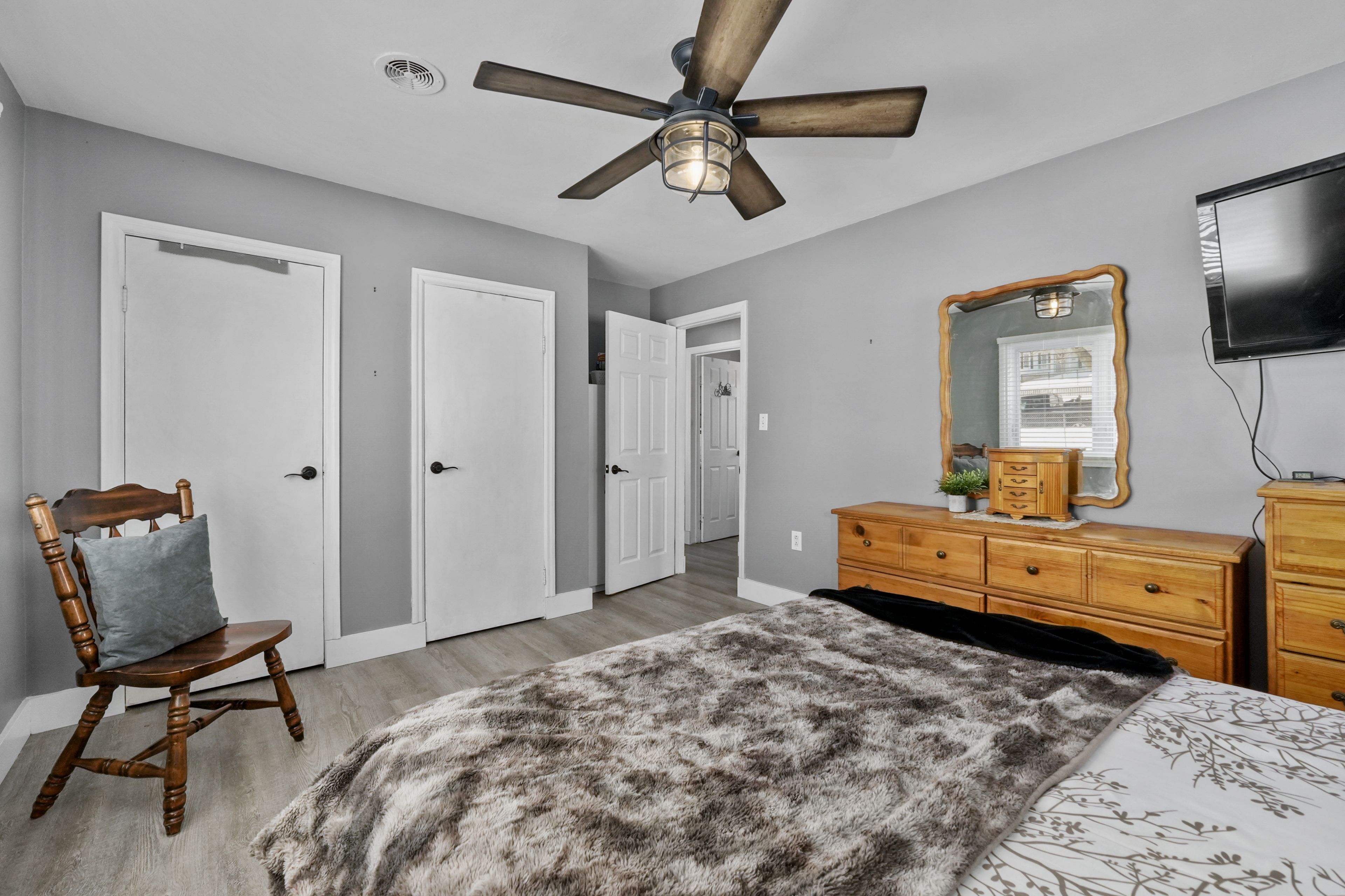 • Spacious primary bedroom with dual closets and additional rooms.