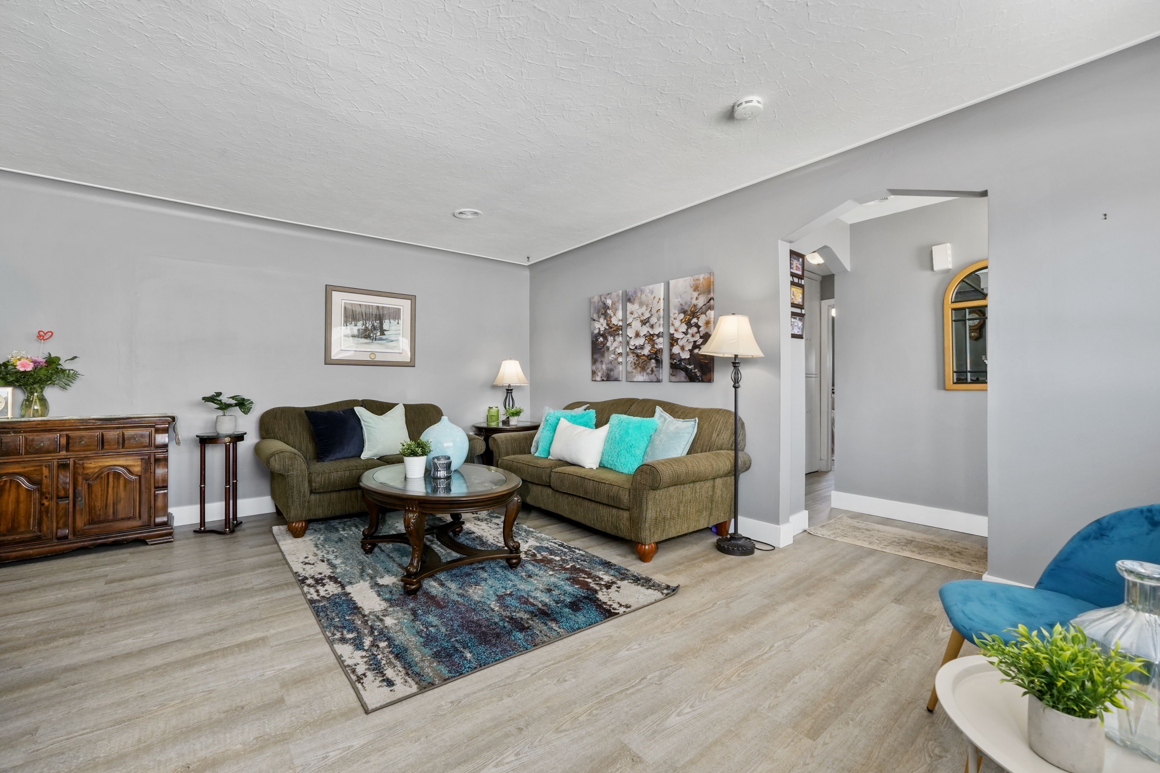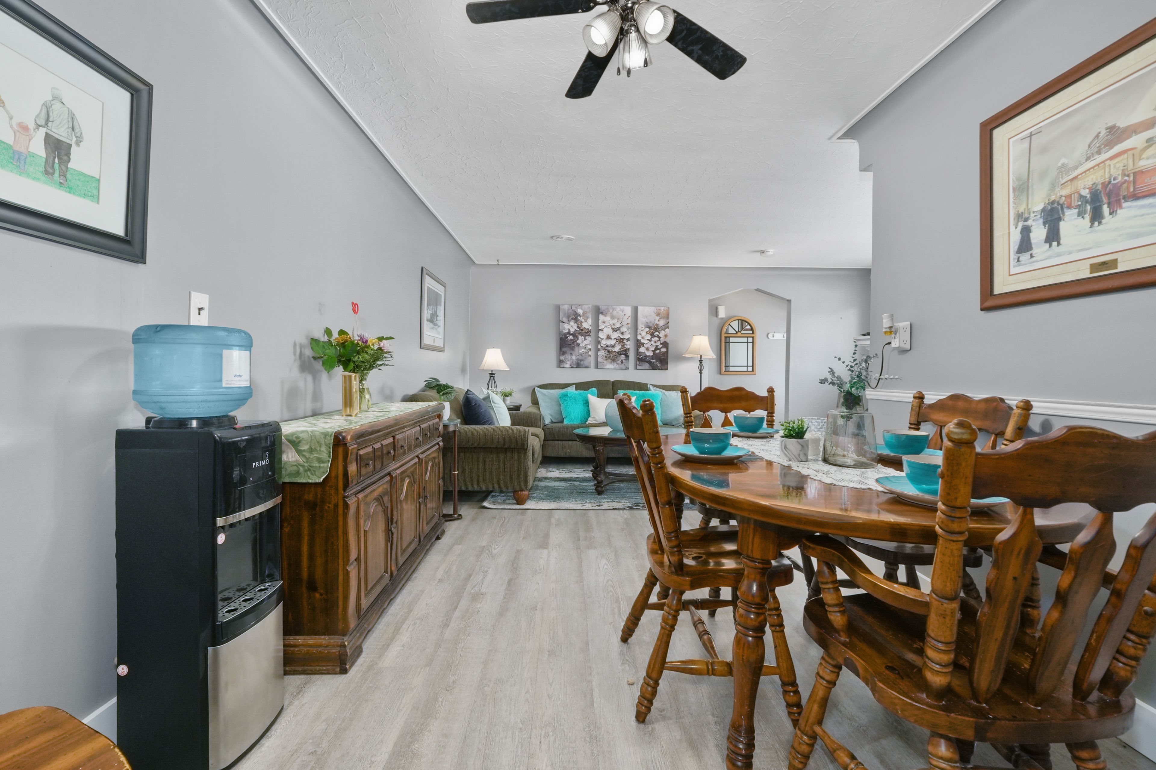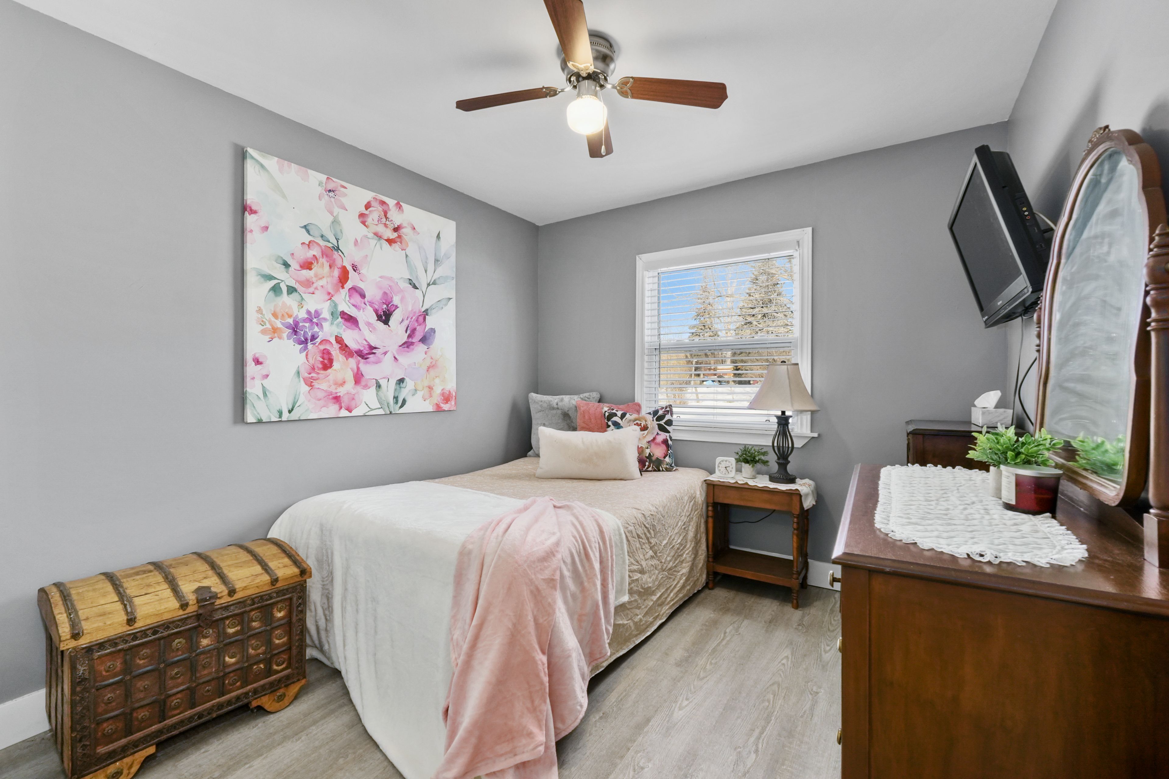 • Spacious primary bedroom with dual closets and additional rooms.