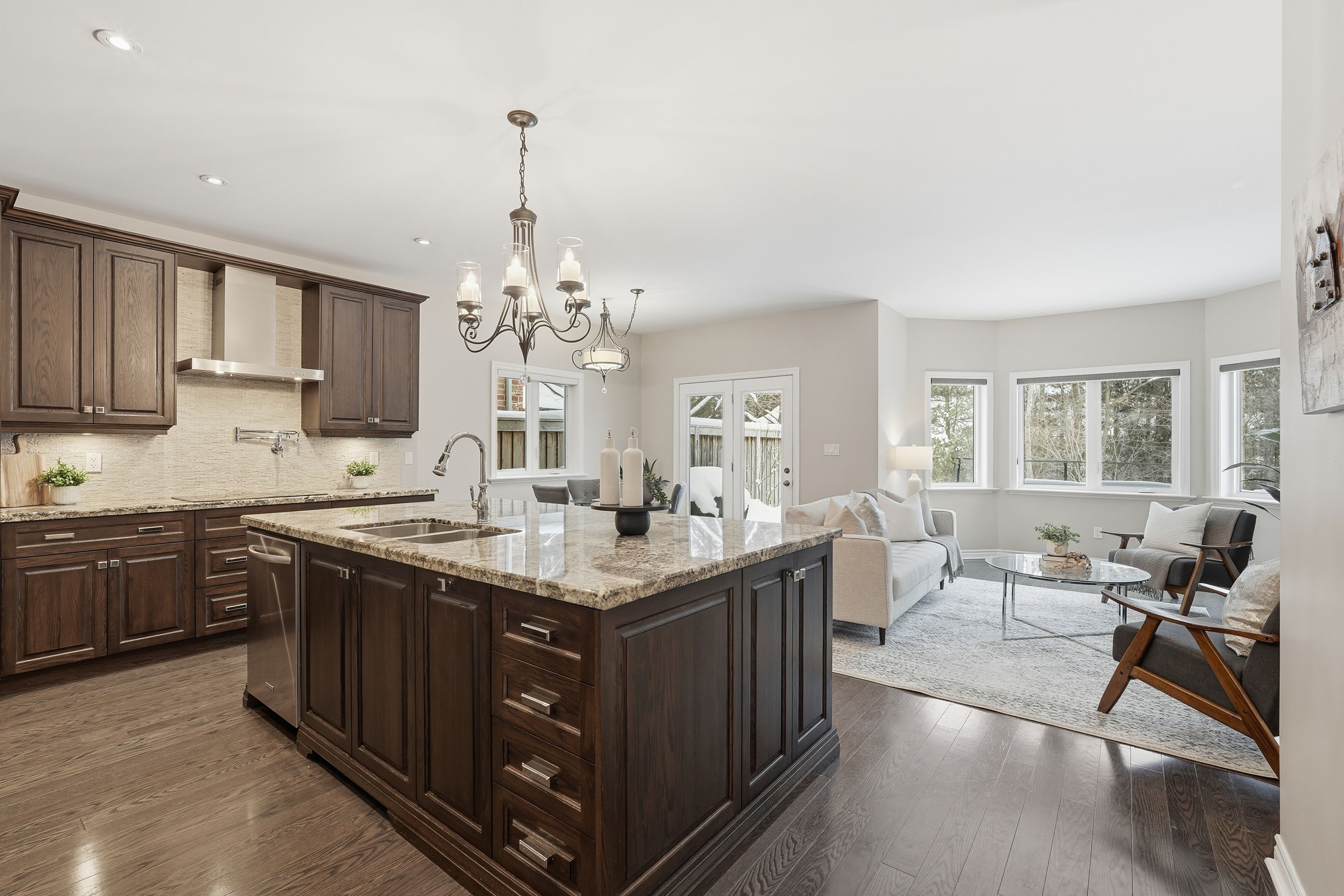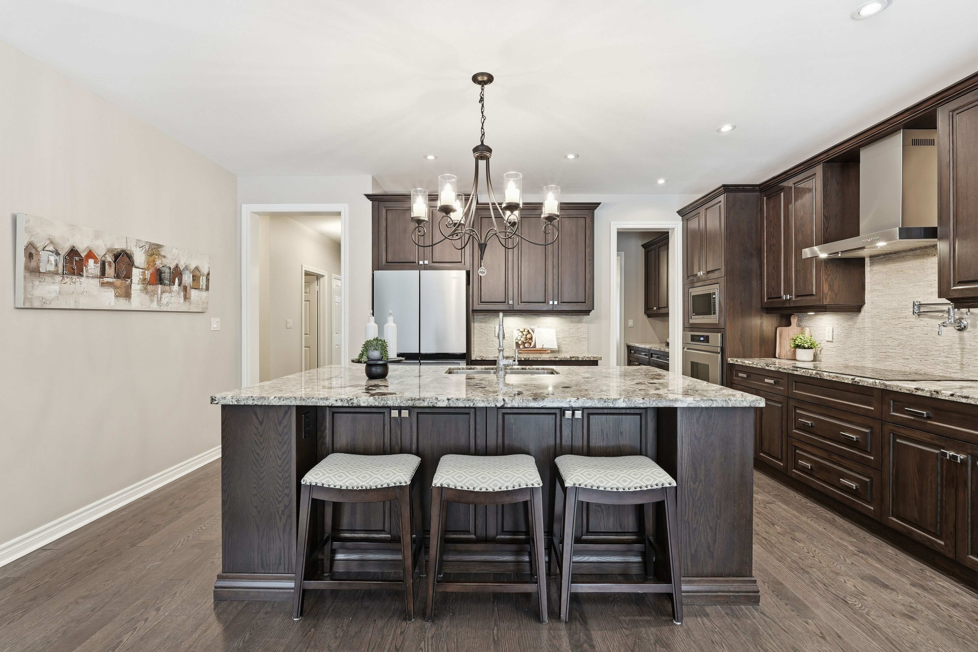 • Bright eat-in kitchen with granite island and upgraded appliances.